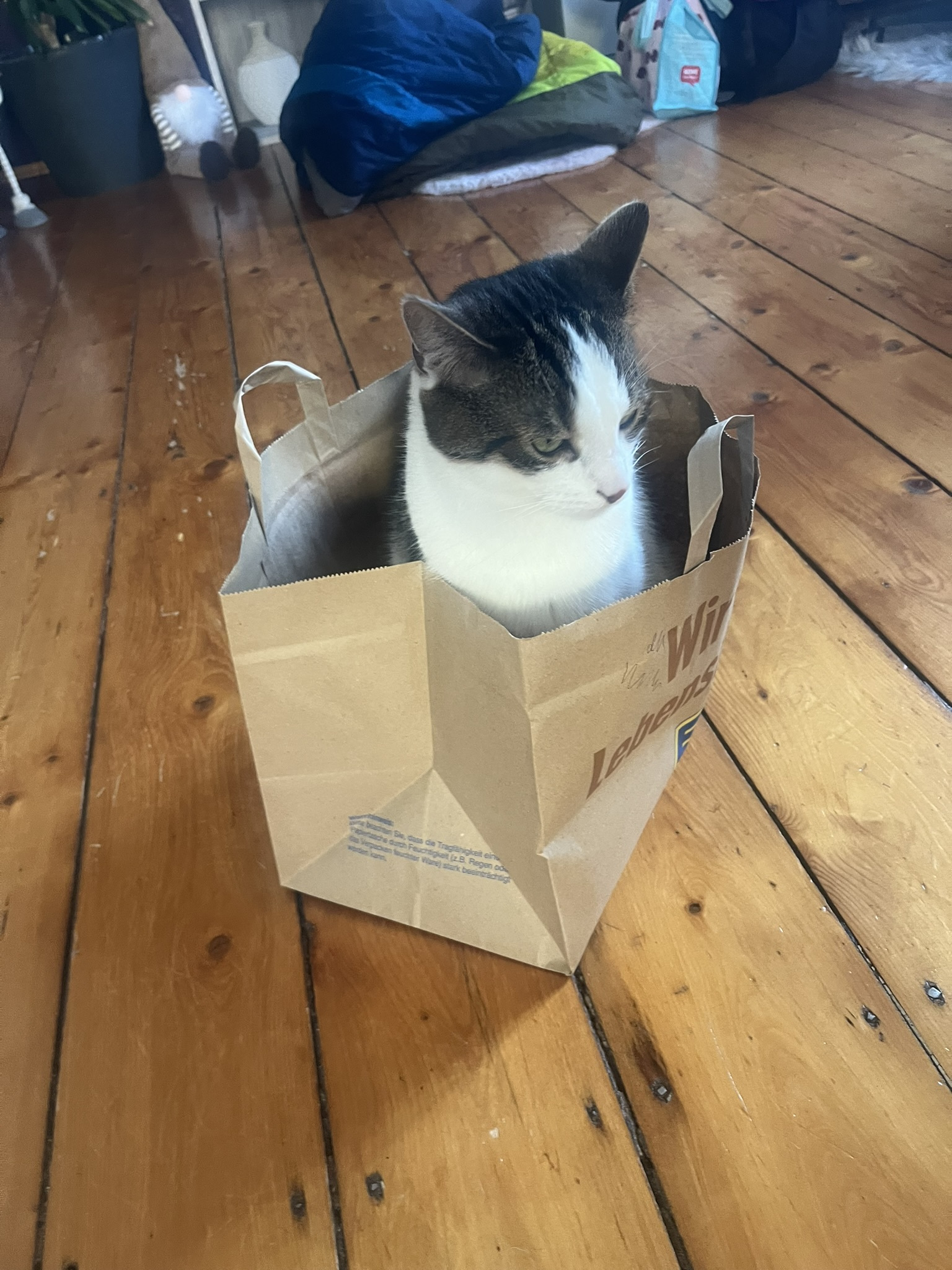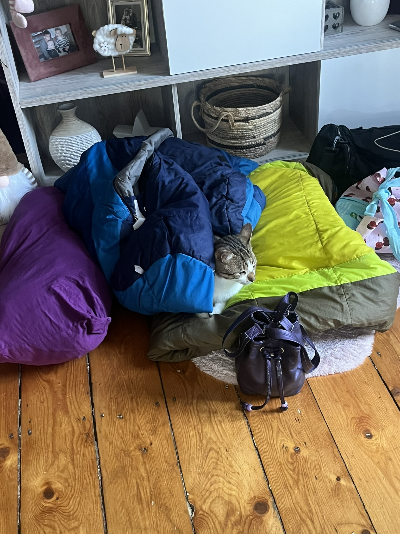 Zwei der Familienmitglieder wollen offensichtlich auch mit nach Amerika . Kater Buddy testet schonmal die Schlafsäcke während sich Simba abflugbereit im Handgepäck macht :-)