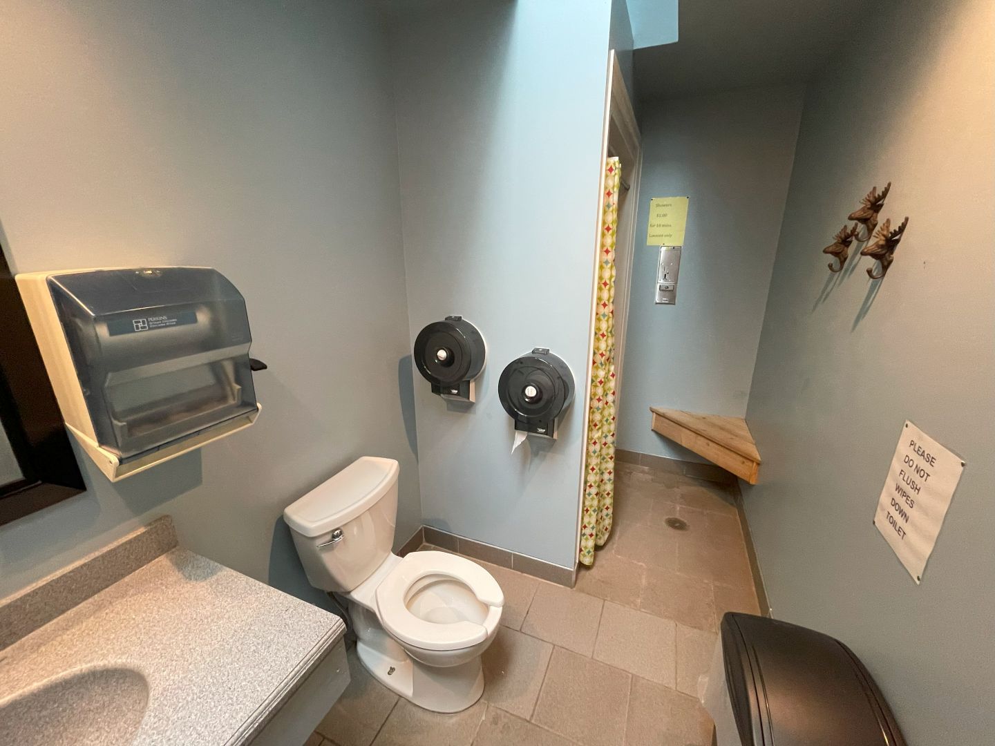 Das Sanitär ist sehr nett gemacht dagegen. Anfangs waren nur 2 Waschräume auf ...und eins davon verschi... 😖👎. Aber die wahren später gereinigt und als ich duschen bin waren alle auf. Jeder mit Toilette, Waschtisch, Dusche und alles sehr großzügig bemessen und ganz schick gemacht. Duschen kostet zwar auch wieder extra 1,-CA$, aber bei den zur Verfügung gestellten 10 Min Duschzeit kann man auch mittendrin noch ein Nickerchen machen😁. Nebenher wird man mit Musik auch den 50er bis 70er berieselt, Cool.