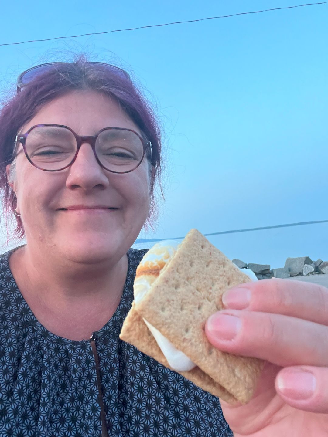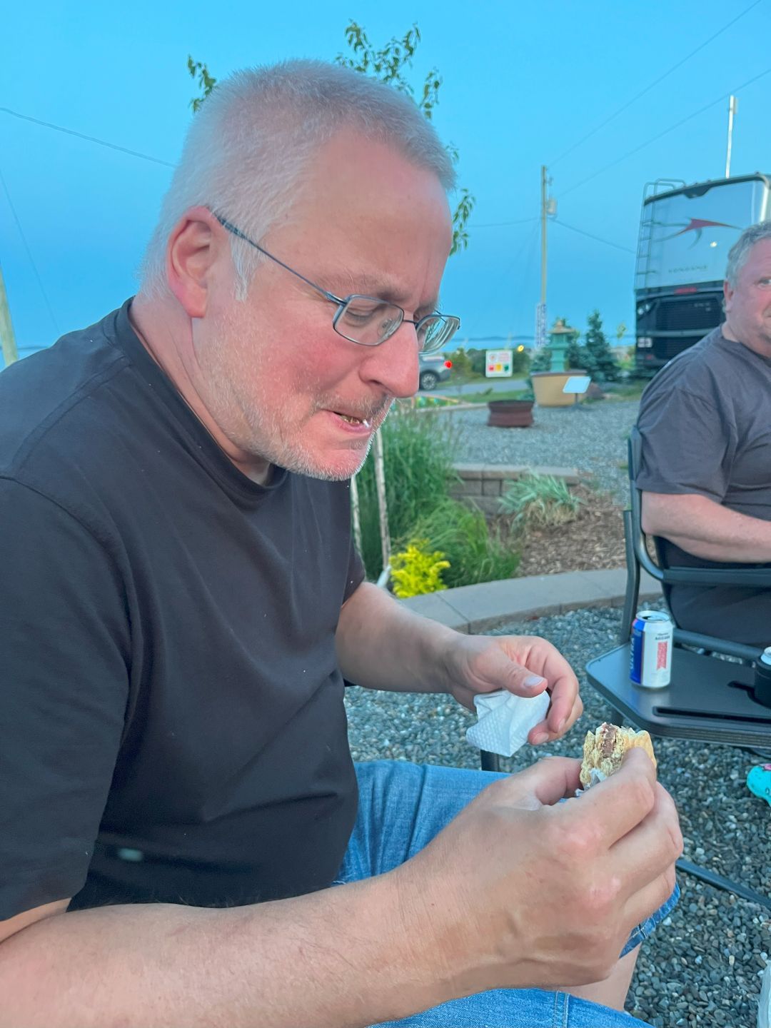 Dann noch rüber zu den Nachbarn ans Feuer. Eigentlich haben wir da ja keine Lust drauf, aber nachdem mehrfach nachgehakt wurde, ob wir auch kommen, gehen wir doch noch kurz rüber. Der Trailer und die 2 Riesen Flaggschiffe gehören zusammen und kommen alle aus der Gegend. Es wird sich über dies und das unterhalten (ich hab oft Schwierigkeit mitzukommen... zu schnell / undeutlich ist die Aussprache). Ganz nach Klischee werden auch Marshmallows gegrillt (klebrig und sausüß). Die Bierdosen sind dagegen in Überbechern versteckt 🙄
