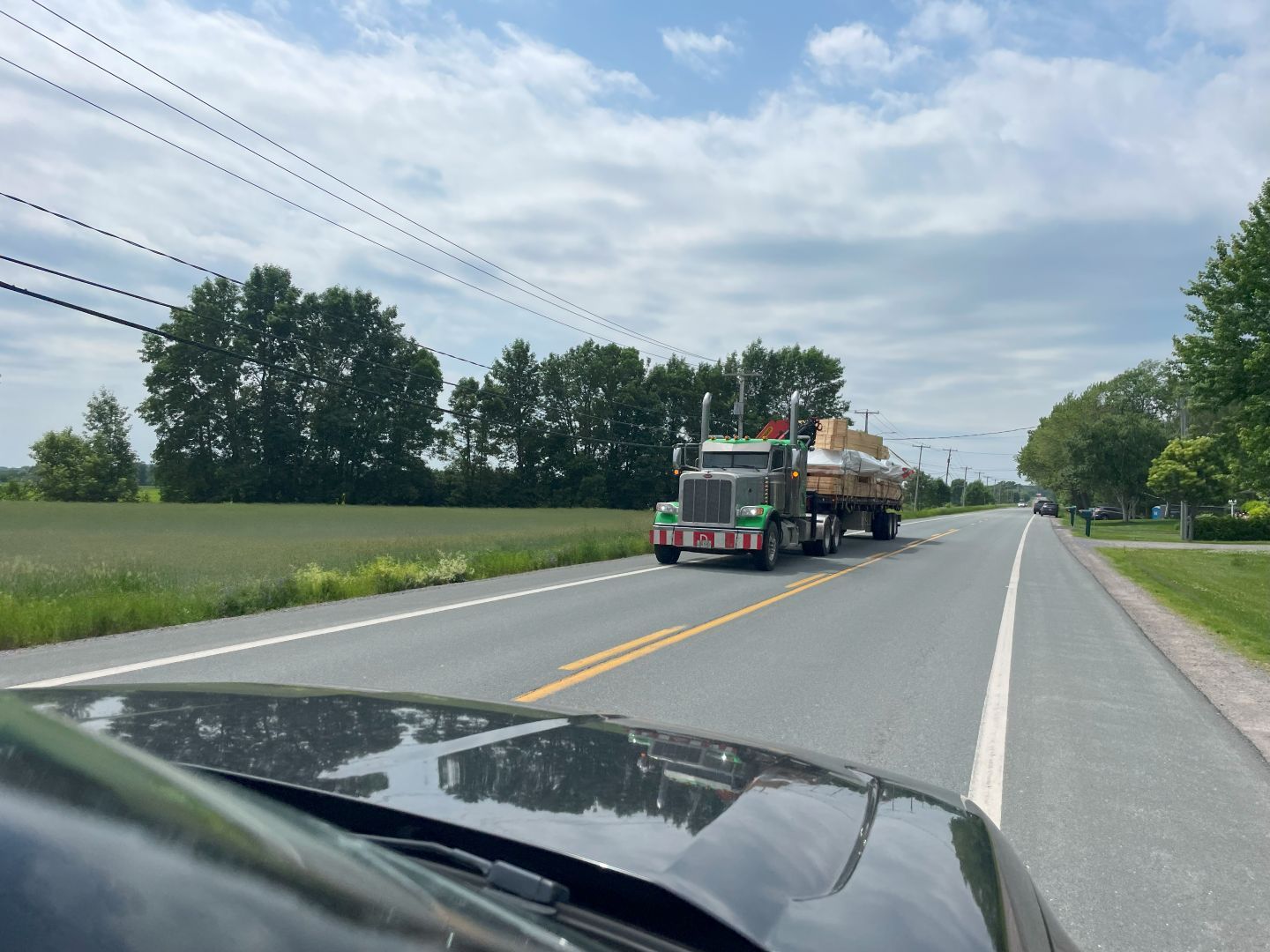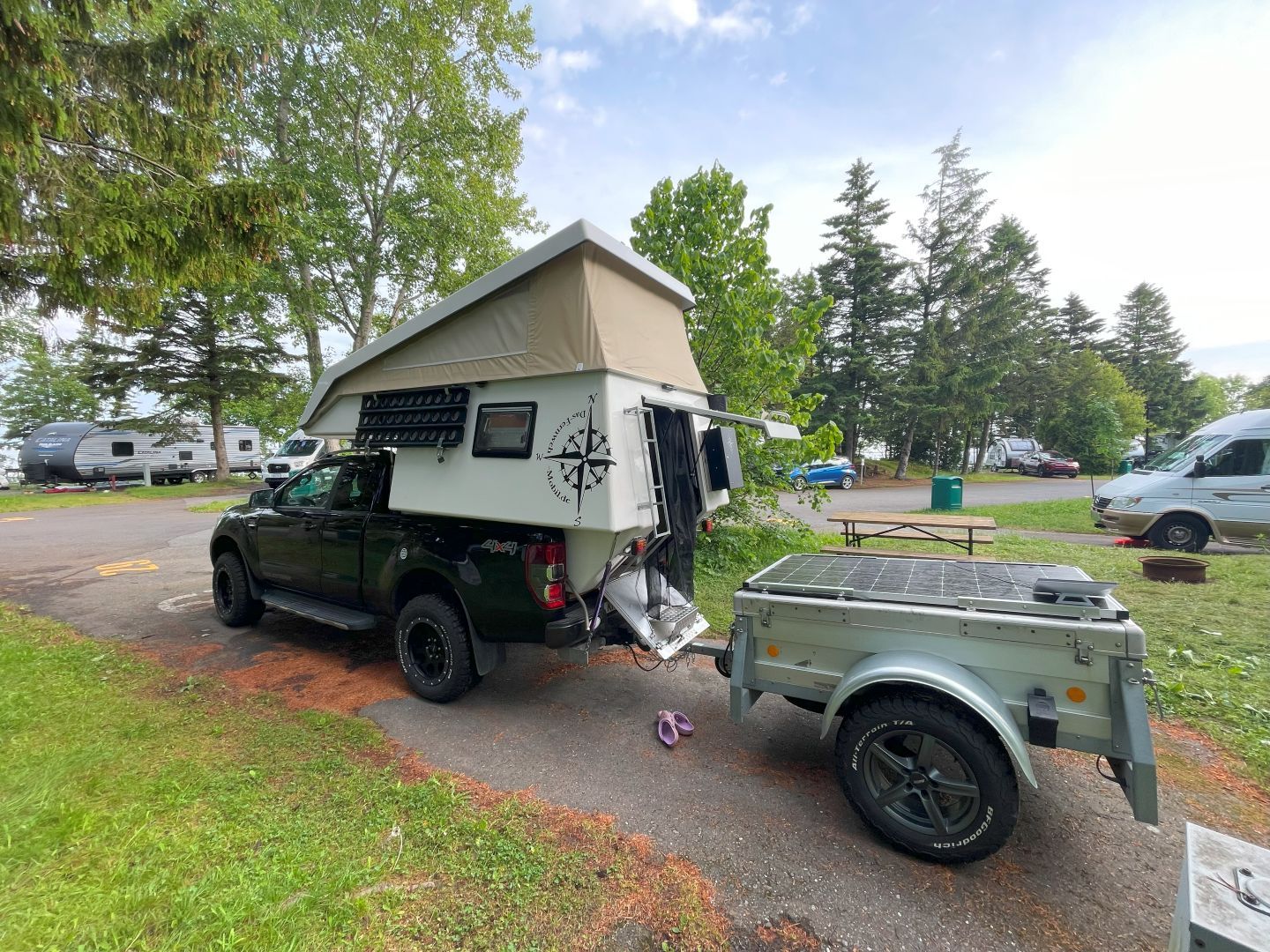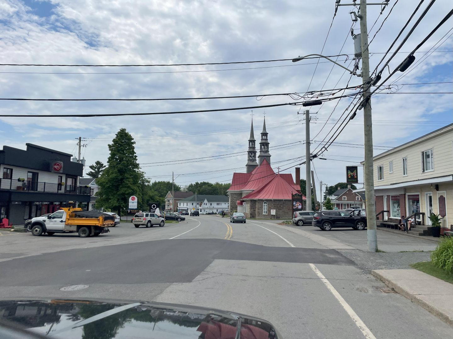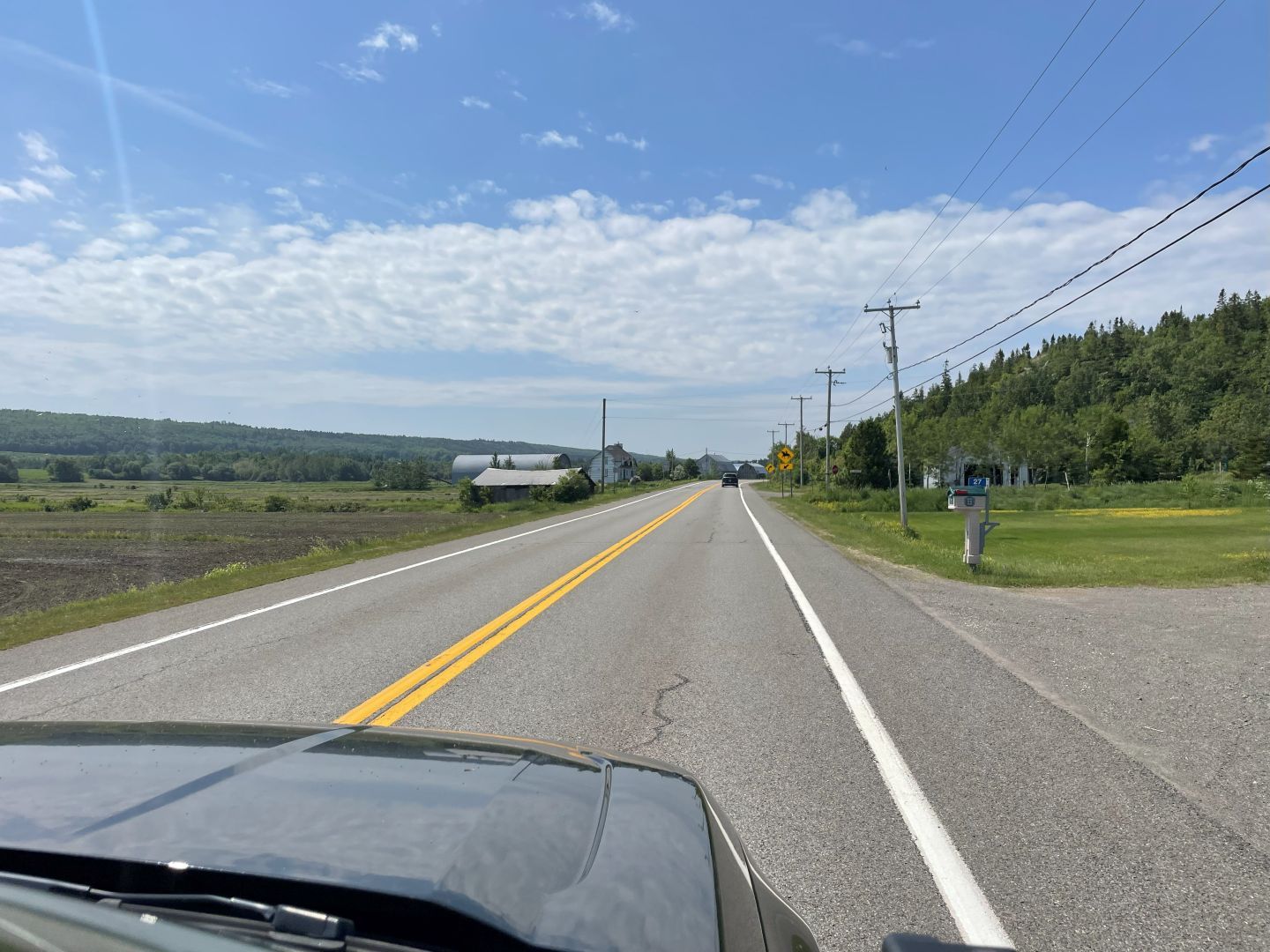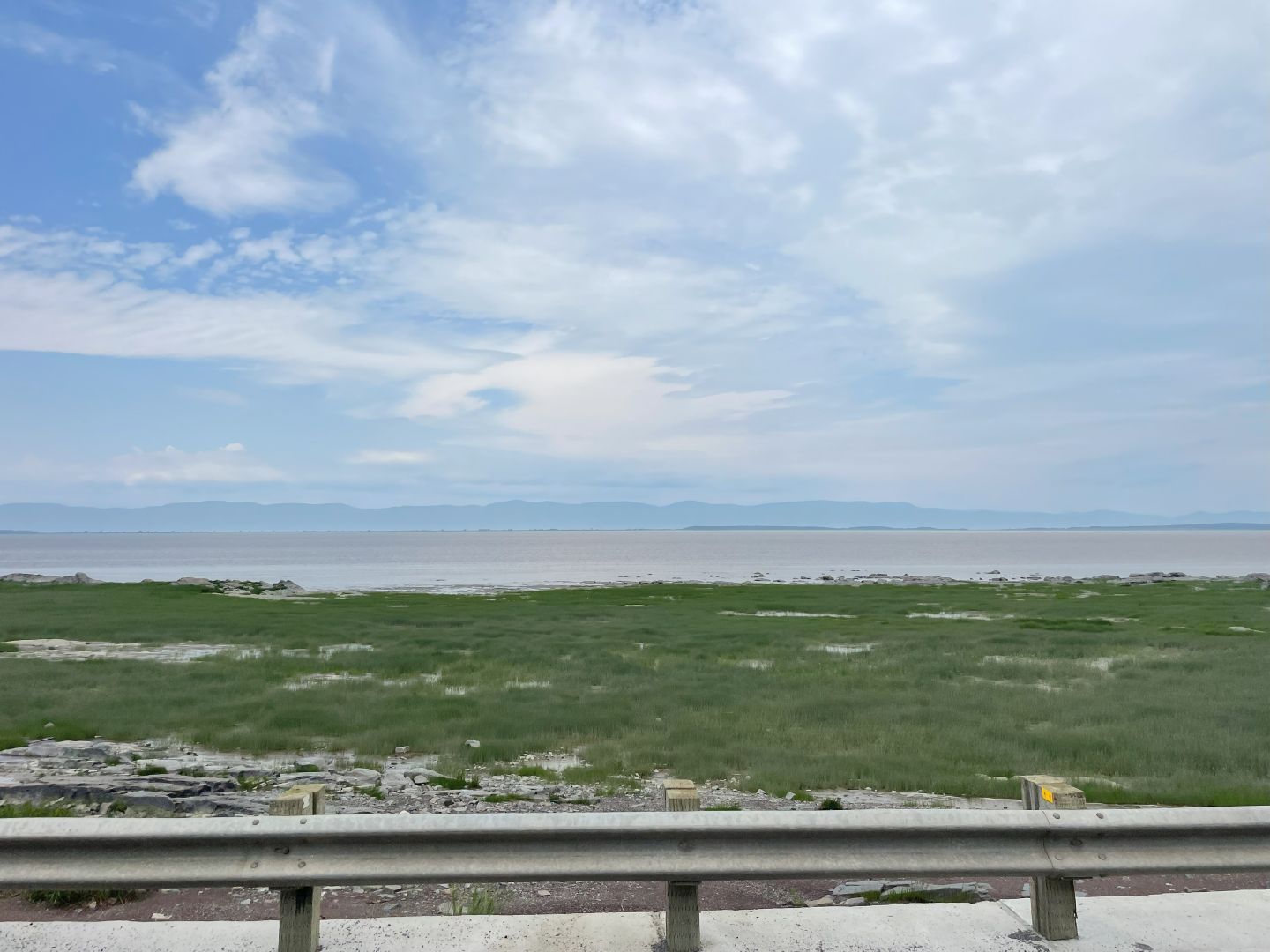 Erstmal tanken... Scheiß teuer hier in Quebec (1,76 CA$) ...wir fahren die „Route de Navigateur“ auf der Südseite des Sankt Lorenz-Strom's lang. Es geht nicht allzu lang da kommt ein Rastplatz/Viewpoint. In Quebec gibts sowas tatsächlich öfters und wird auch immer rechtzeitig angekündigt ...auch Toiletten (sauber! Ganz im Gegensatz zu D!) gibts dort oft. Da der kleine Parkplatz bereits recht voll ist und wir darauf kein Platz mehr mit dem Anhänger finden parken wir am Straßenrand (und damit auch halb auf dem Fahrradweg) Kunzi ist das unangenehm und als gleich noch drauf ein Polizeifahrzeug hält schwand ihr schon Böses... aber ne… die drehen nur um und wollen zum Glück nichts von uns. Ich lass nochmal die Drohne fliegen, wir frühstücken und weiter gehts.
