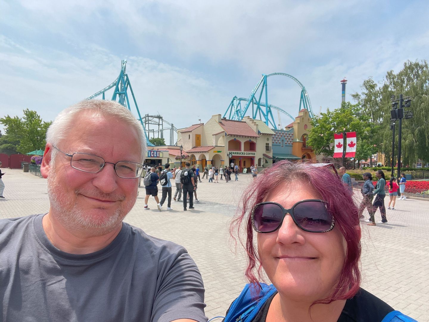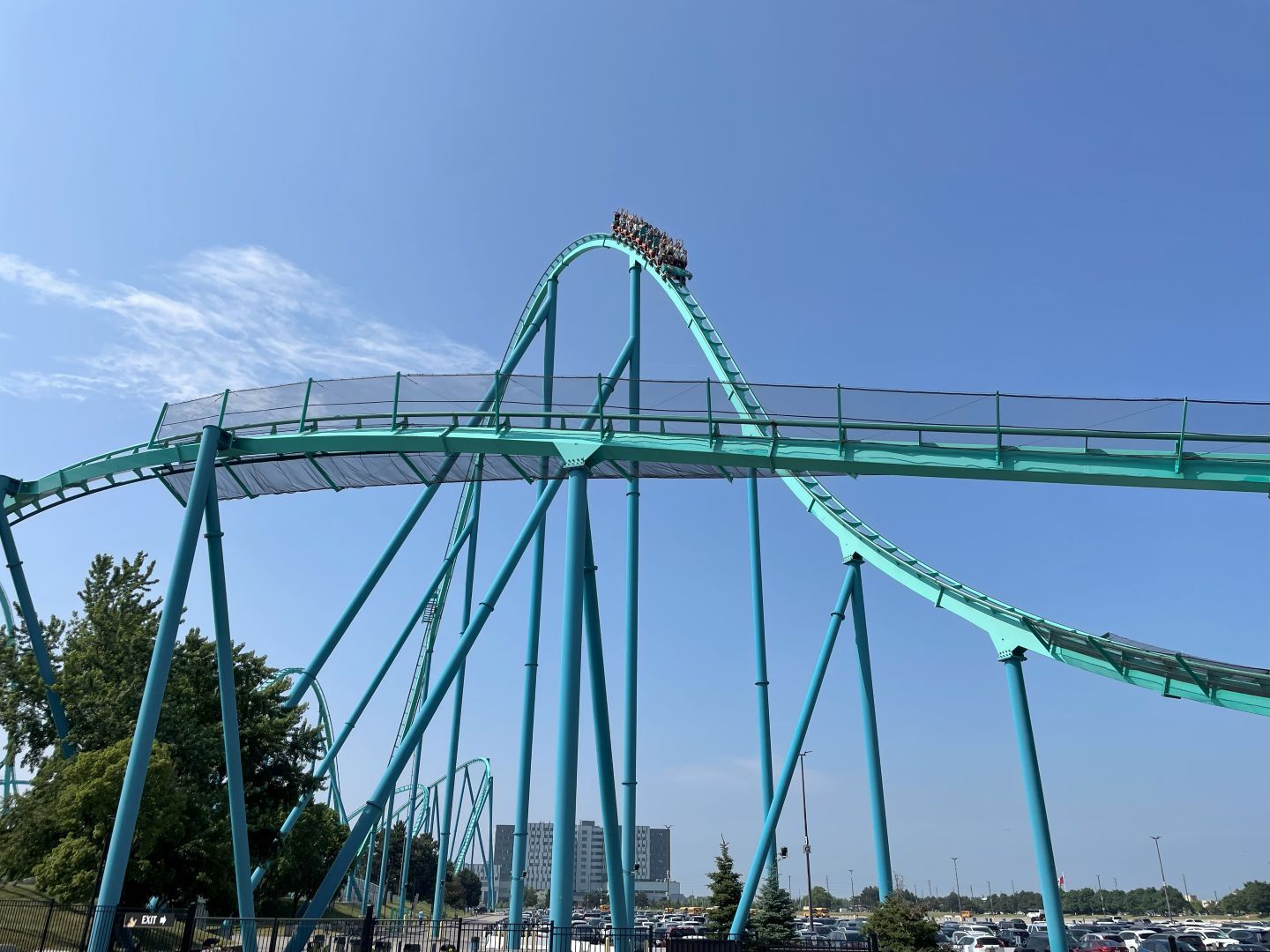 Heut gehts in das Canada's Wonderland. Das ist ein Vergnügungspark in Toronto sowie bei uns der Europapark. Von Camping sind nur 21 km dahin. Die dauern schon wieder ewig. Der Verkehr in und um Toronto rum ist eine einzige Katastrophe. Da helfen auch kein 10 Spuren in eine Richtung mehr.