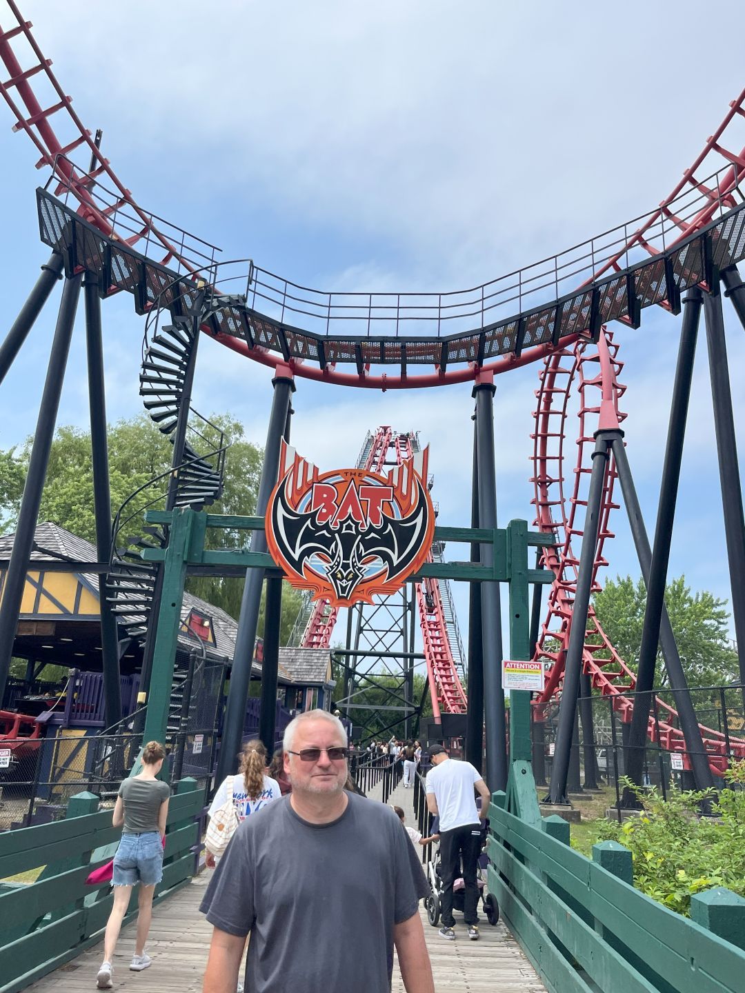 Wir, also ich, Kunzi ist nicht zu überreden, fahren noch einige weitere Achterbahnen bis wir zu „The Bat" kommen. Sieht interessant, aber klein und unspektakulär aus. Die Schlange ist aber nicht riesig, also anstellen. Es geht komischerweise irgendwie nicht voran.