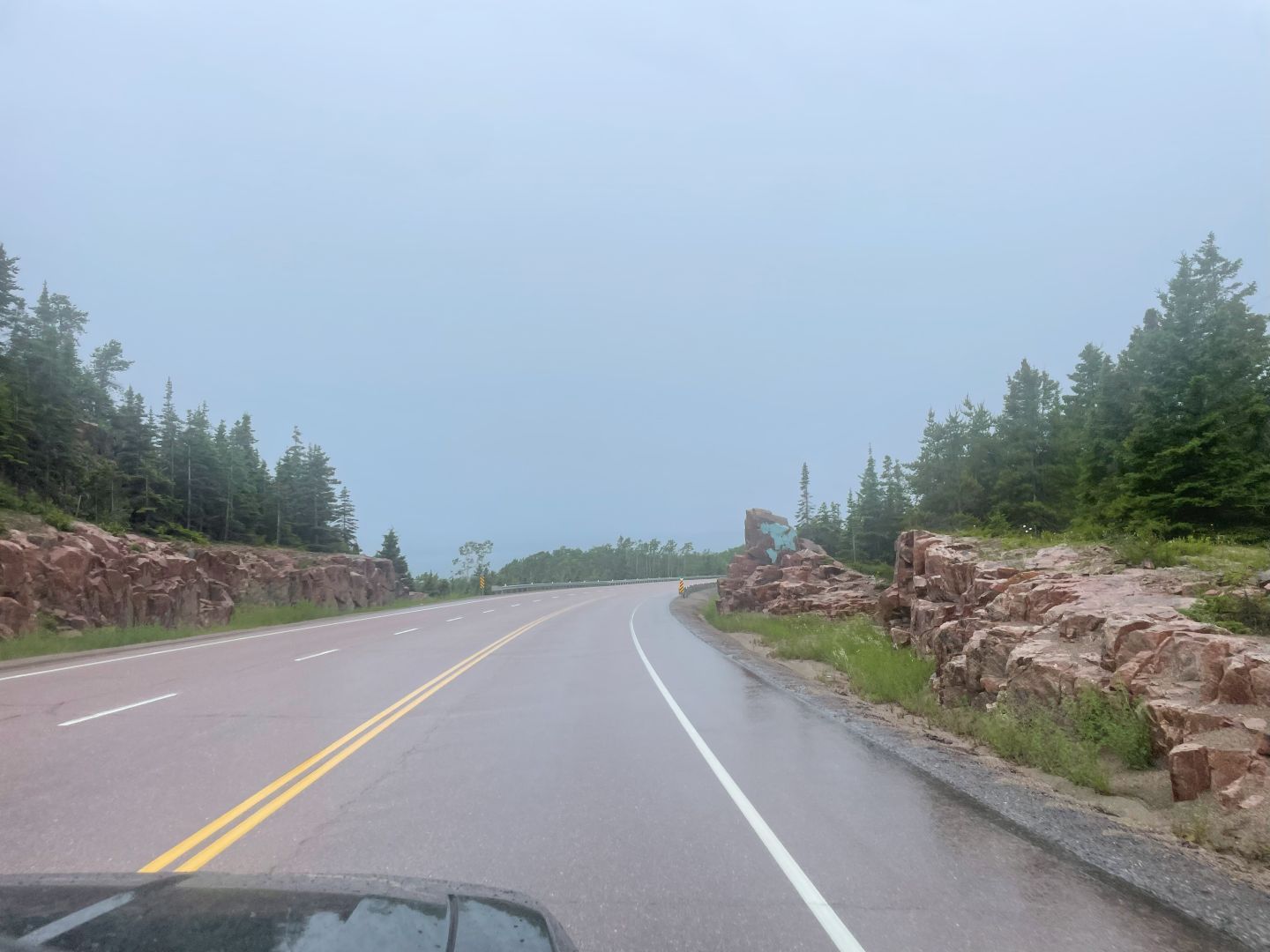 Die Landschaft wird wieder bergiger, richtig schön hier. Immer wieder gelangt man auch an den Lake Superior. Leider ziehts immer mehr und dunkler zu ...auch die Temperaturen sinken bis auf teilweise 10 Grad ab. Wir tanken noch und dann beginnts auch schon mit regnen.