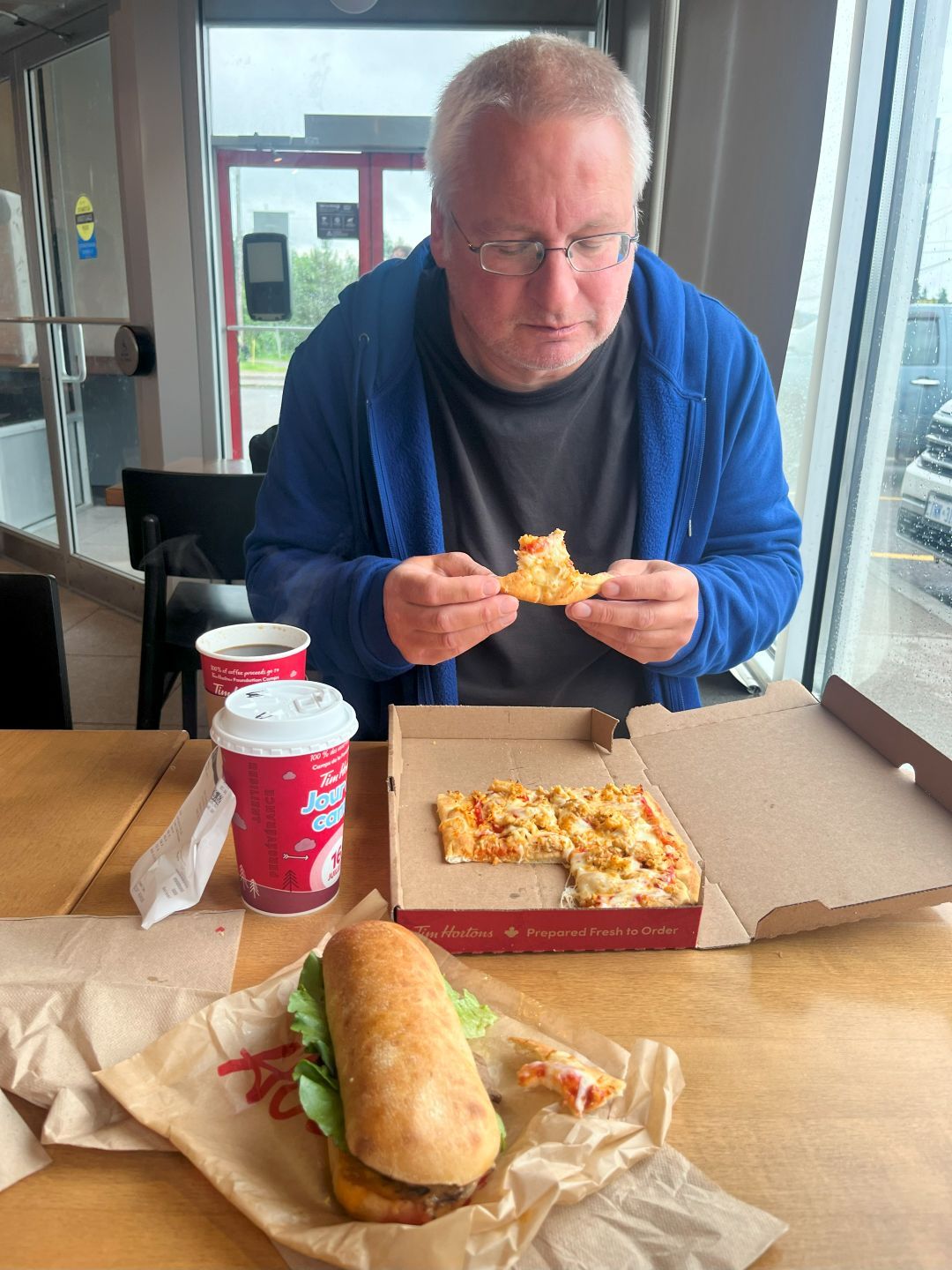 Wir gehen in den Tim Hortens nebenan. Es gibt Pizza mit Hühnchen und Parmesan (gar nicht schlecht) und ein warmes Sandwich zum „Frühstück"🙄