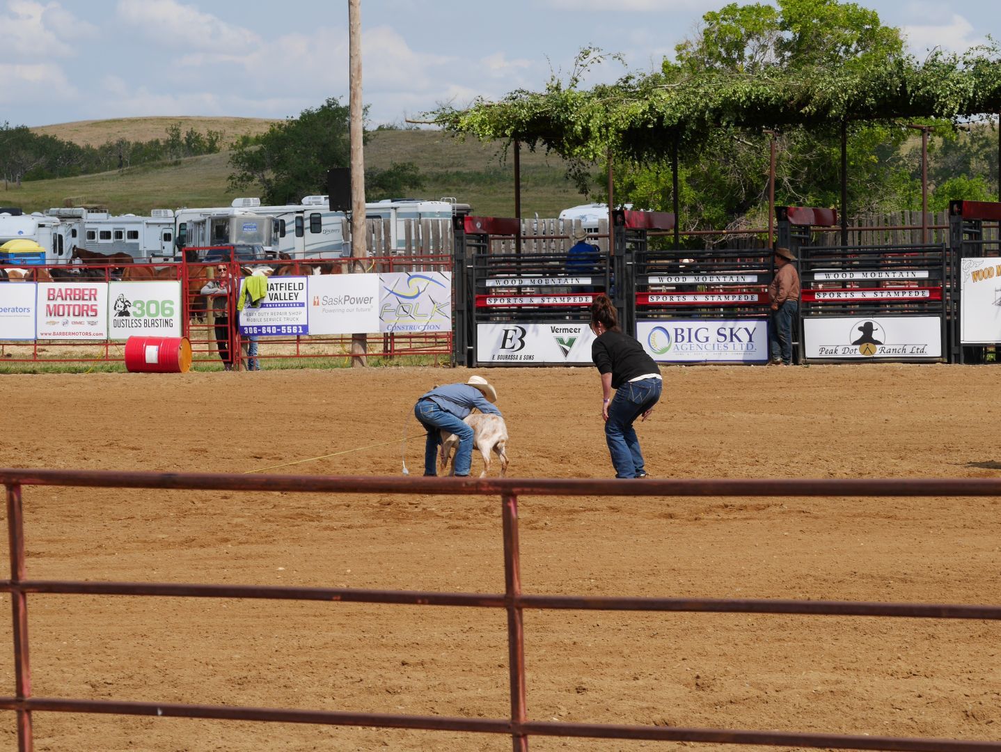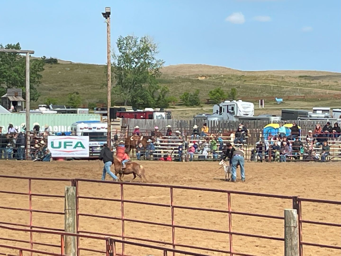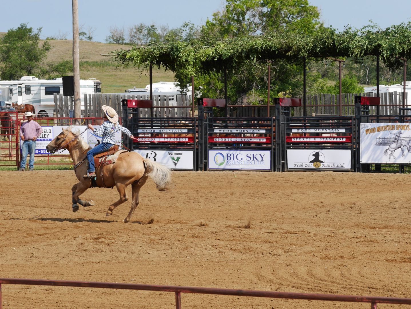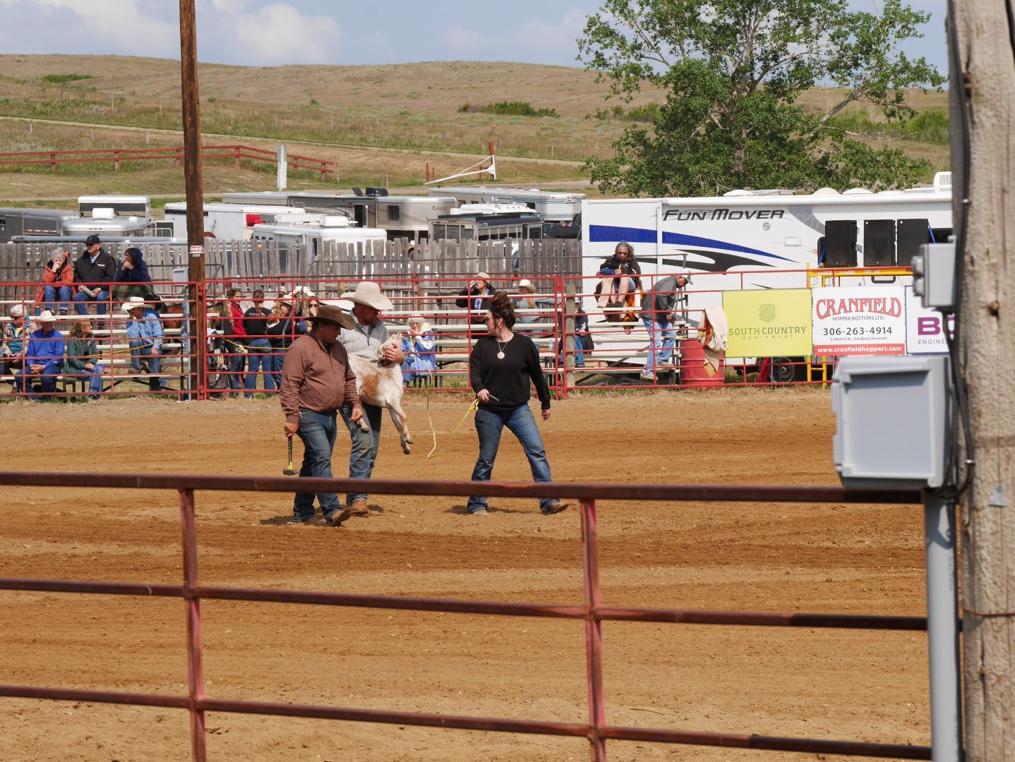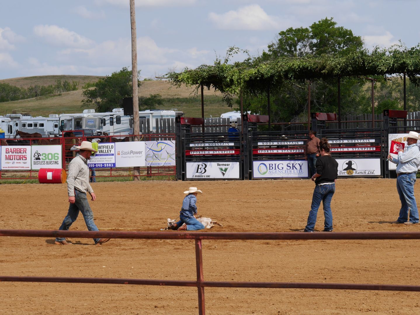 Mit Ausschlafen für Kunzi ist's Nix, der Moderator testet schon um halb 8 seine Anlage. Um kurz vor 9 geht's dann auch los mit Kids Rodeo. Zuerst sind die „Peeeweees" (bis 6 Jahre) dran😀. Da wir noch nicht fertig mit Kaffeetrinken sind verpassen wir die Hälfte. Eine Ziege ist in der Mitte in der Arena mit einem Bändchen am Schwanz ...die Cowboys und Girls müssen reinreiten und das Bändchen abziehen. Manch kleines Cowgirl ist noch so klein dass sie auf dem Arm wieder rausgetragen wird😀.