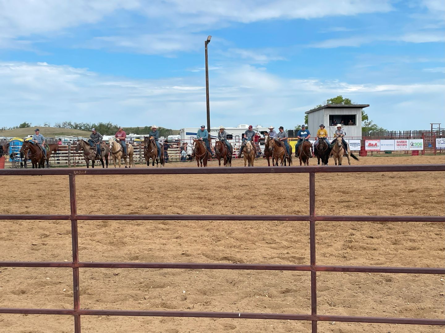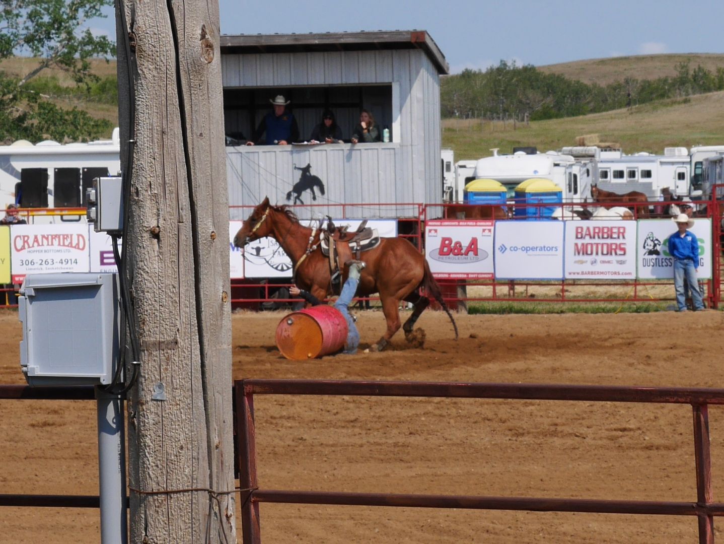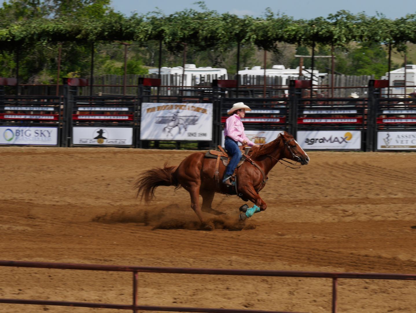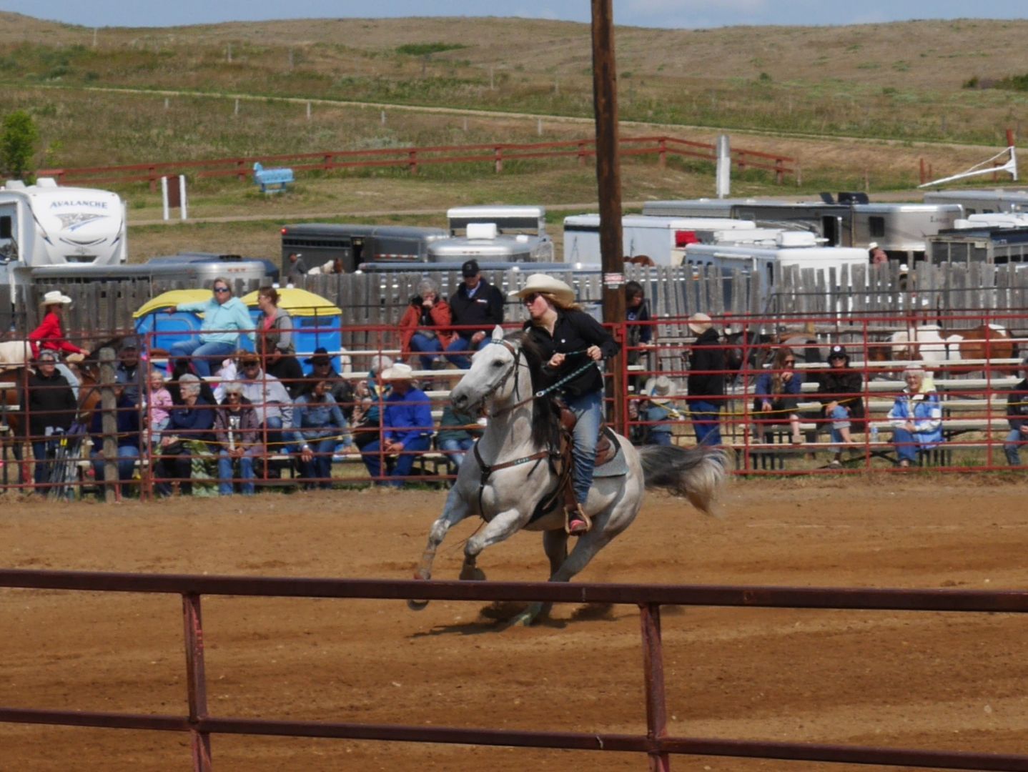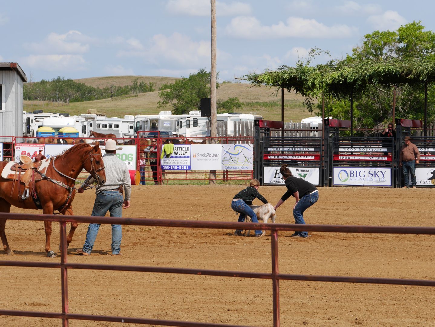 Mit Ausschlafen für Kunzi ist's Nix, der Moderator testet schon um halb 8 seine Anlage. Um kurz vor 9 geht's dann auch los mit Kids Rodeo. Zuerst sind die „Peeeweees" (bis 6 Jahre) dran😀. Da wir noch nicht fertig mit Kaffeetrinken sind verpassen wir die Hälfte. Eine Ziege ist in der Mitte in der Arena mit einem Bändchen am Schwanz ...die Cowboys und Girls müssen reinreiten und das Bändchen abziehen. Manch kleines Cowgirl ist noch so klein dass sie auf dem Arm wieder rausgetragen wird😀.