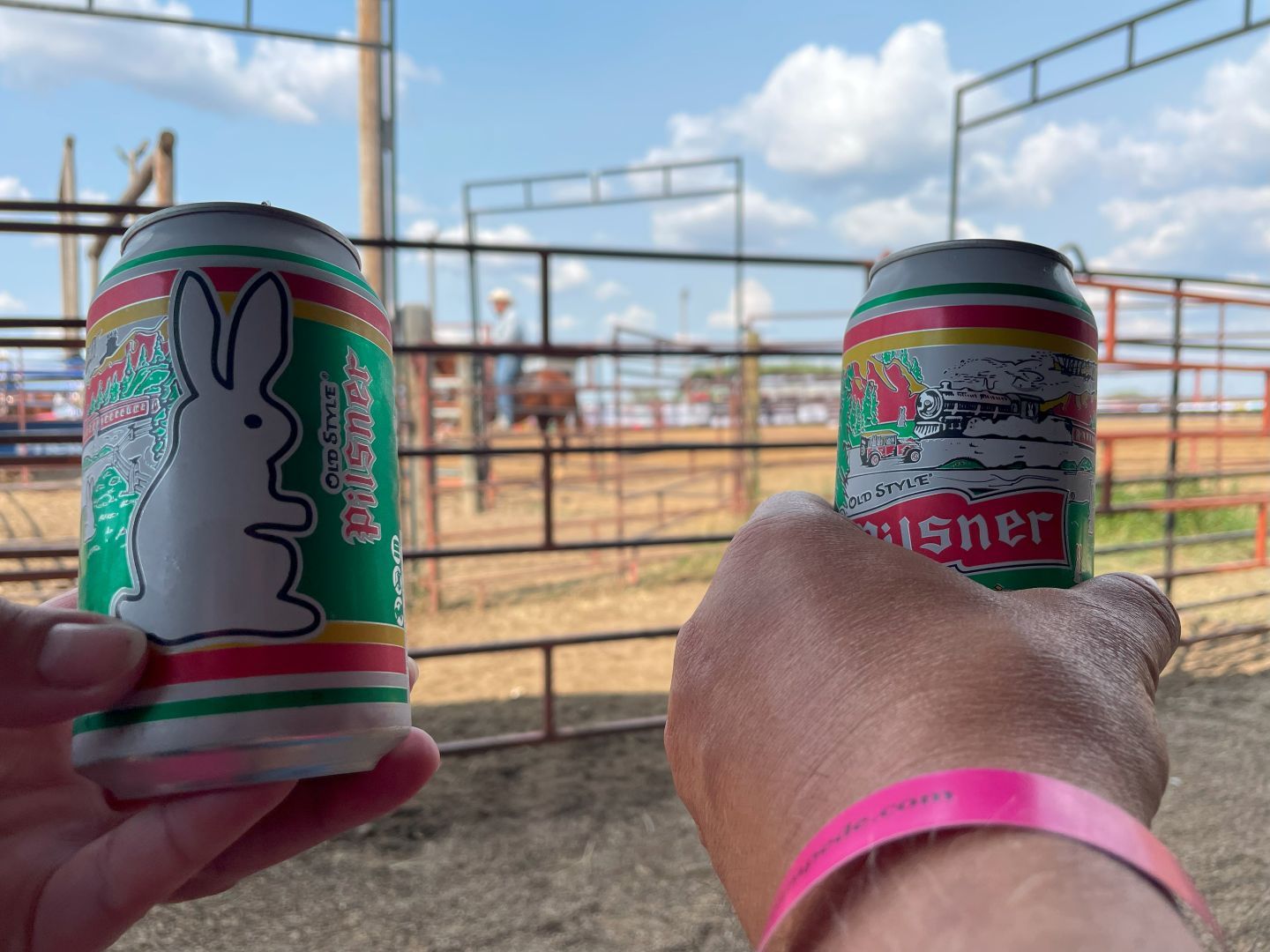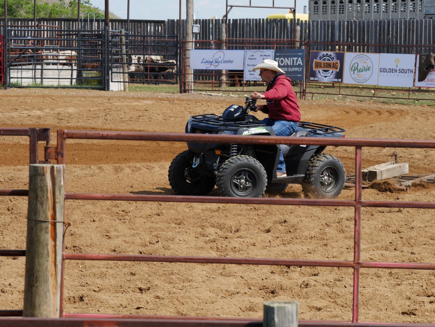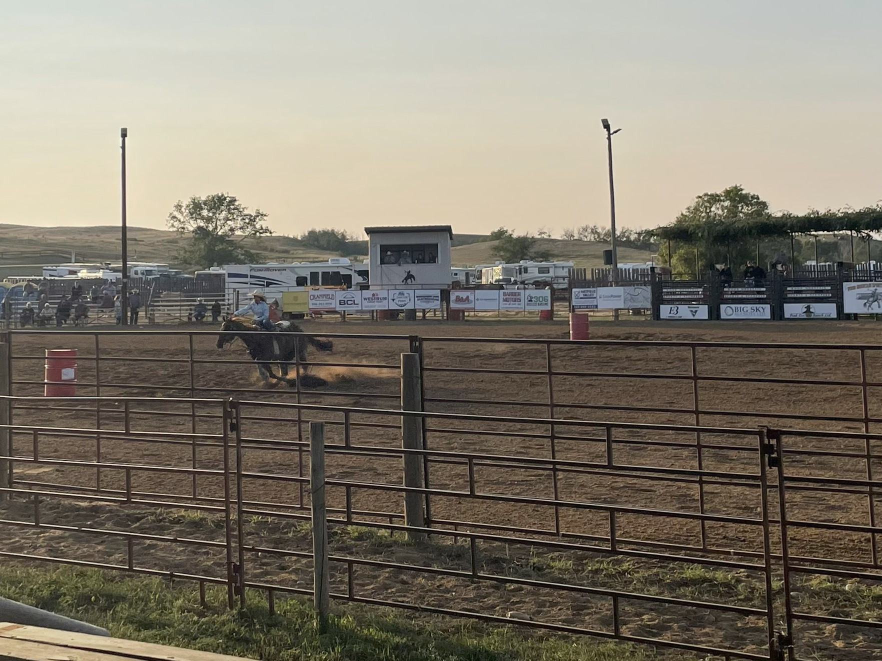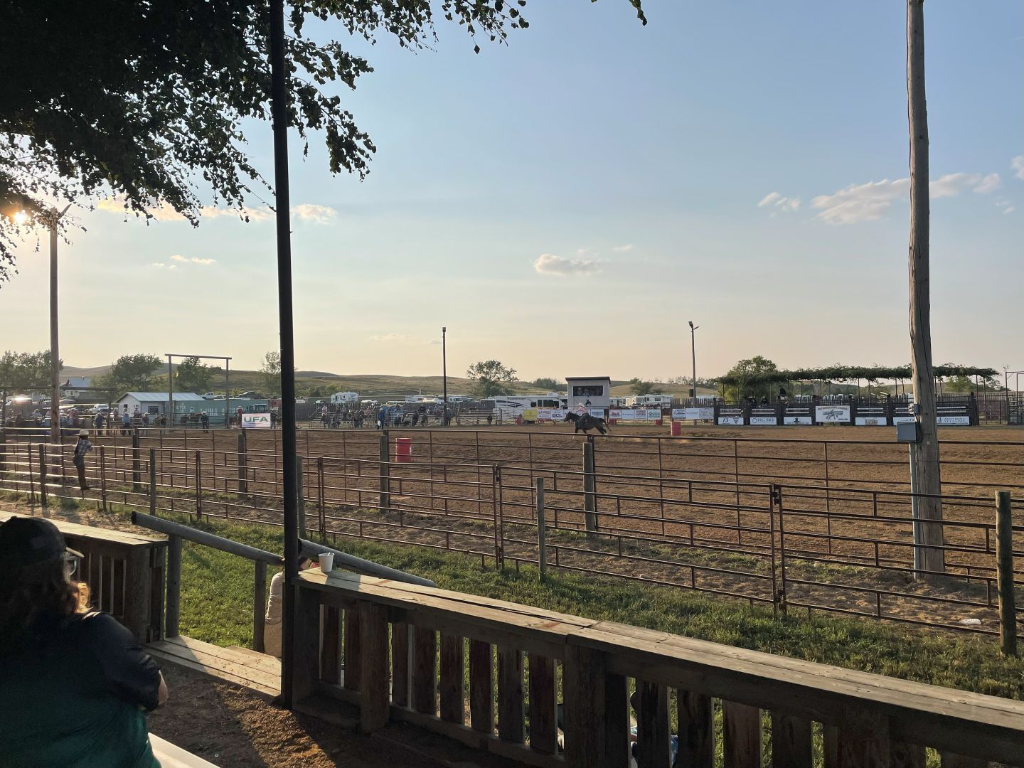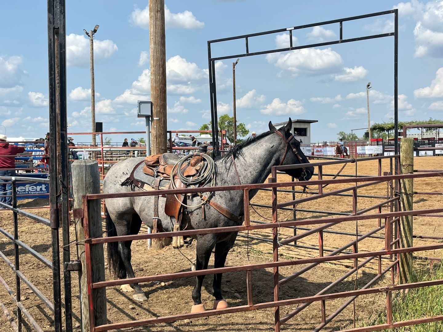 Mit Ausschlafen für Kunzi ist's Nix, der Moderator testet schon um halb 8 seine Anlage. Um kurz vor 9 geht's dann auch los mit Kids Rodeo. Zuerst sind die „Peeeweees" (bis 6 Jahre) dran😀. Da wir noch nicht fertig mit Kaffeetrinken sind verpassen wir die Hälfte. Eine Ziege ist in der Mitte in der Arena mit einem Bändchen am Schwanz ...die Cowboys und Girls müssen reinreiten und das Bändchen abziehen. Manch kleines Cowgirl ist noch so klein dass sie auf dem Arm wieder rausgetragen wird😀.
