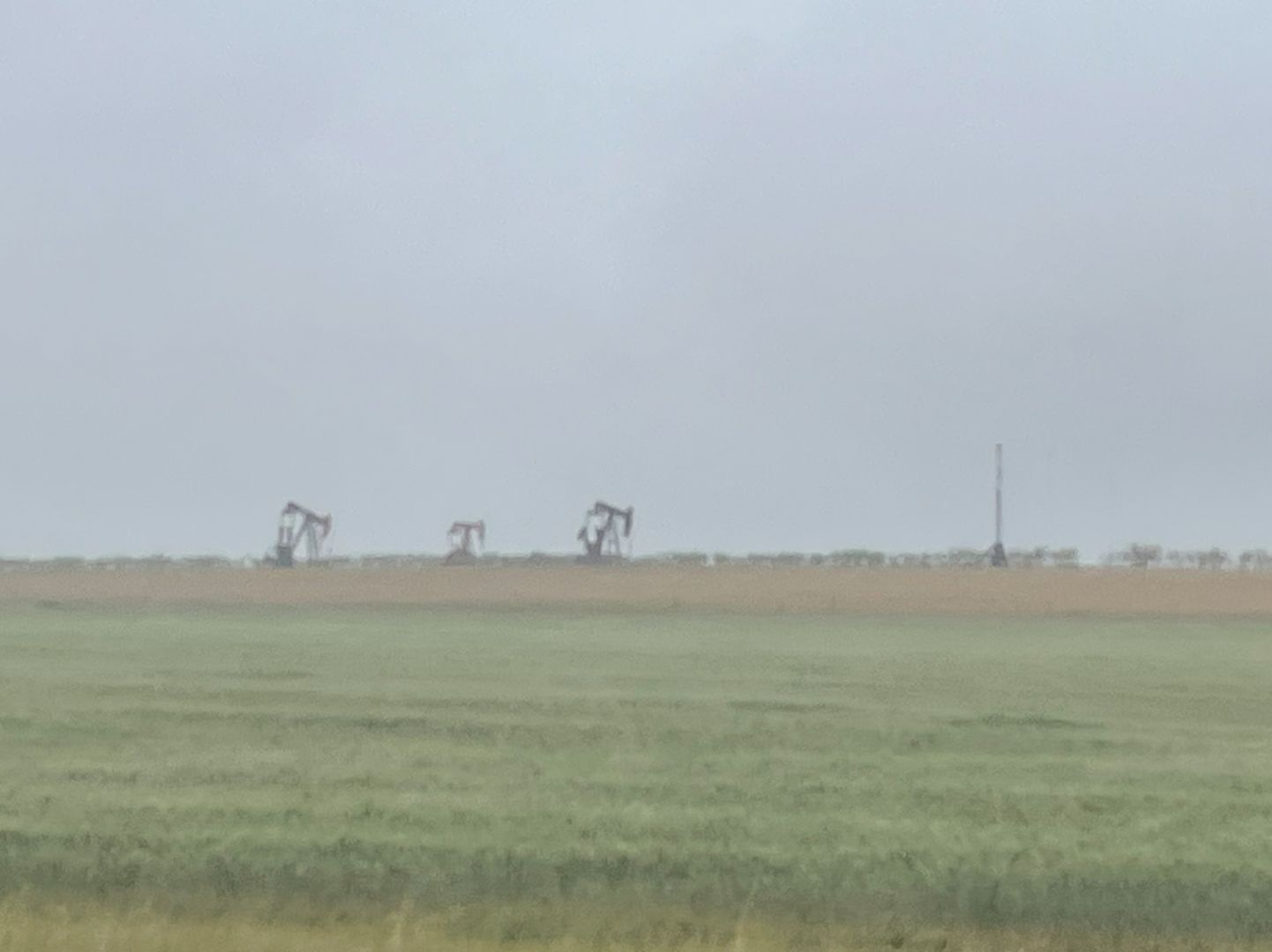 Mittendrin gibt's auf vielen Feldern plötzlich Pumpen. Dazwischen Stationen am denen Gas abgefackelt wird. Offensichtlich wird hier Öl gefördert.
