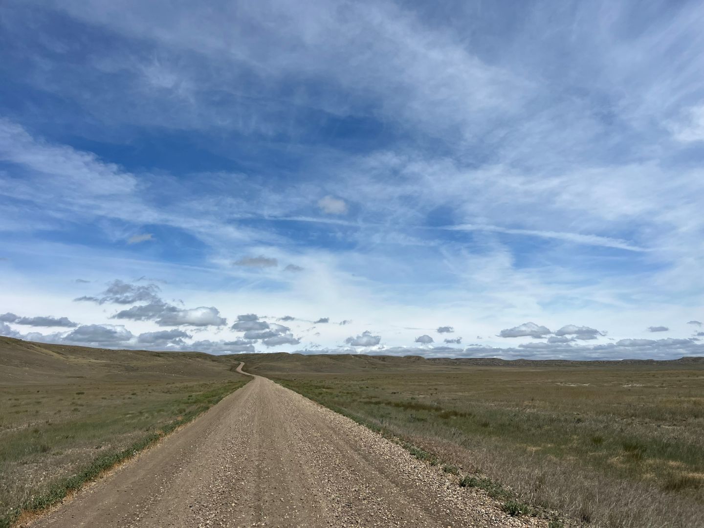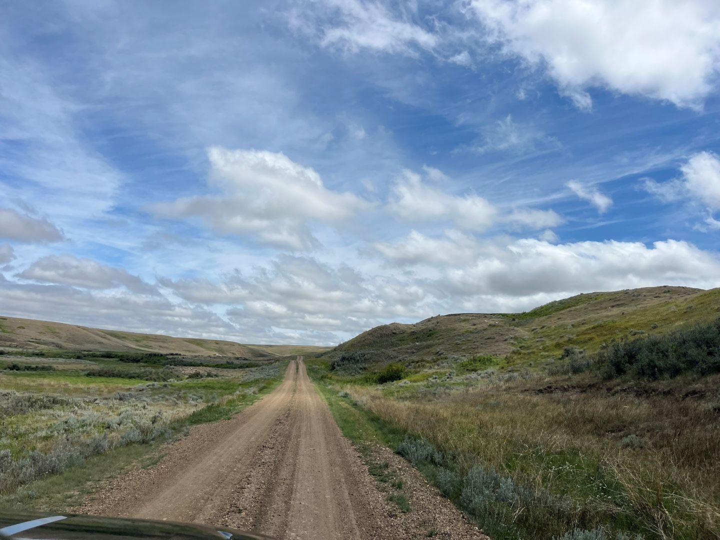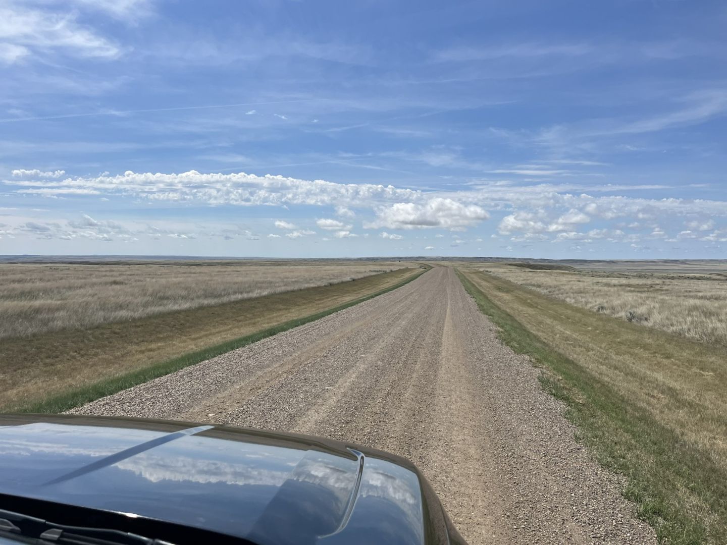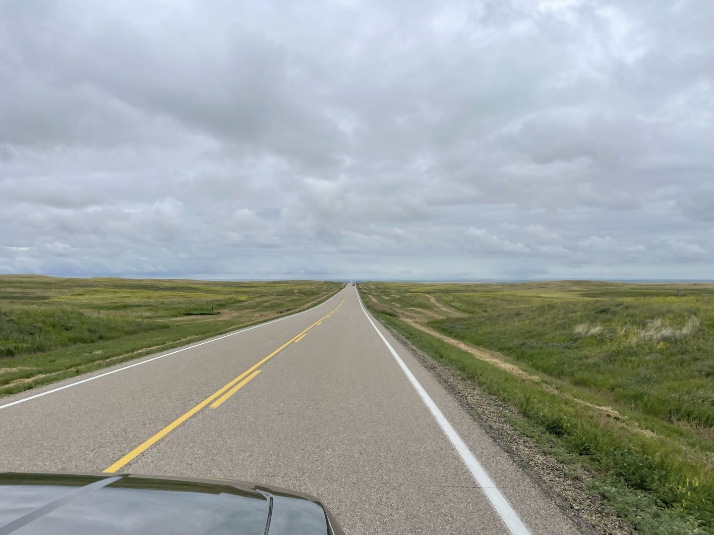 Der Himmel hat schon zugezogen als wir weiterfahren. Auf zum Glück besseren Straßen geht nach Norden Richtung Trans Canadian Highway zurück. Wie immer meist kerzengerade durch Weideland.