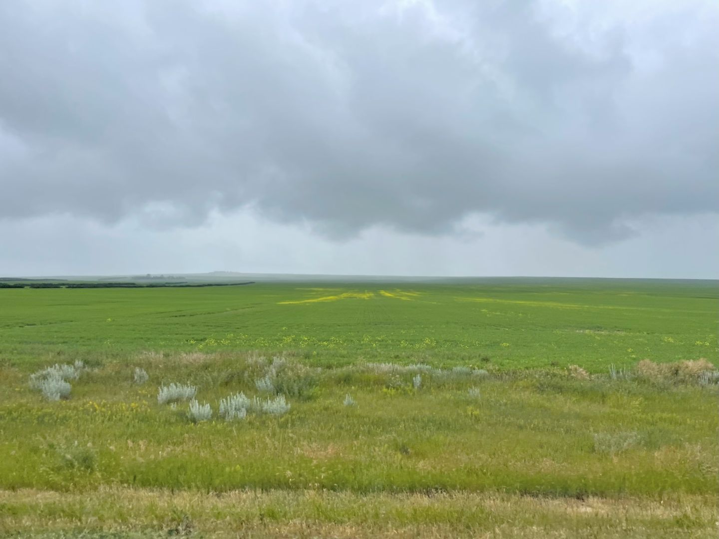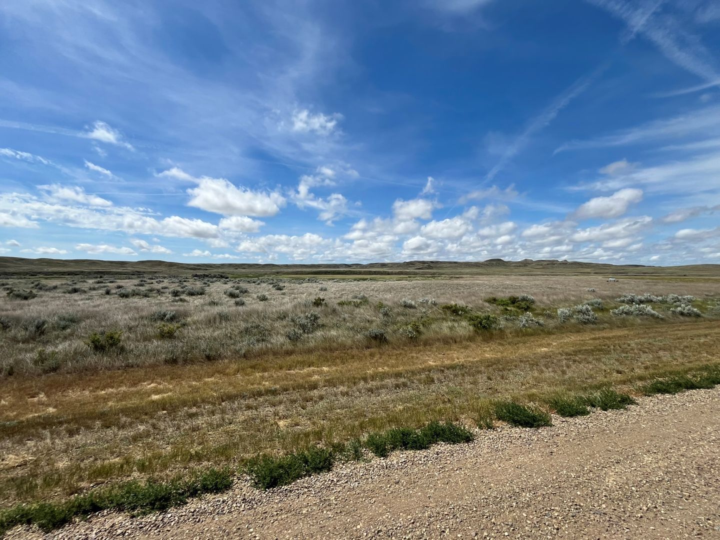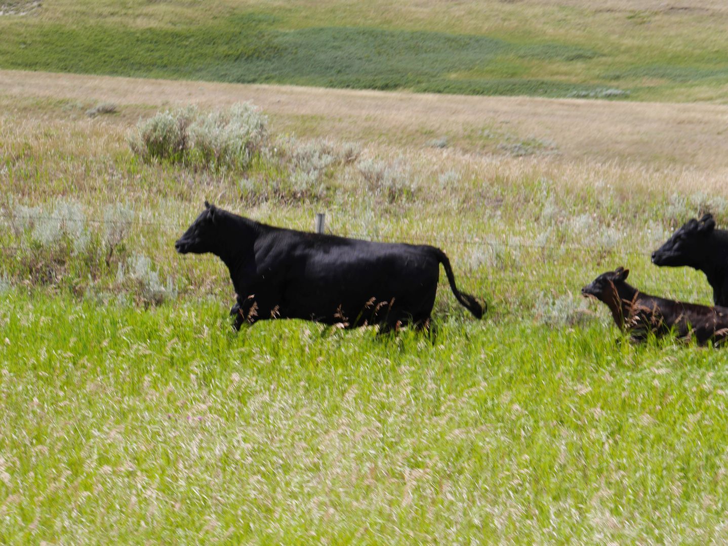 Der Himmel hat schon zugezogen als wir weiterfahren. Auf zum Glück besseren Straßen geht nach Norden Richtung Trans Canadian Highway zurück. Wie immer meist kerzengerade durch Weideland.