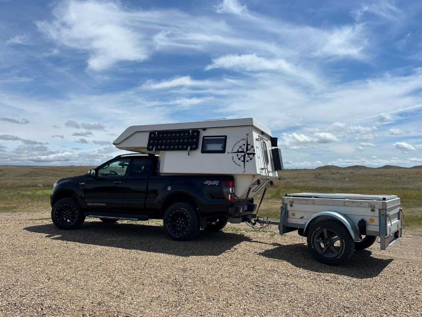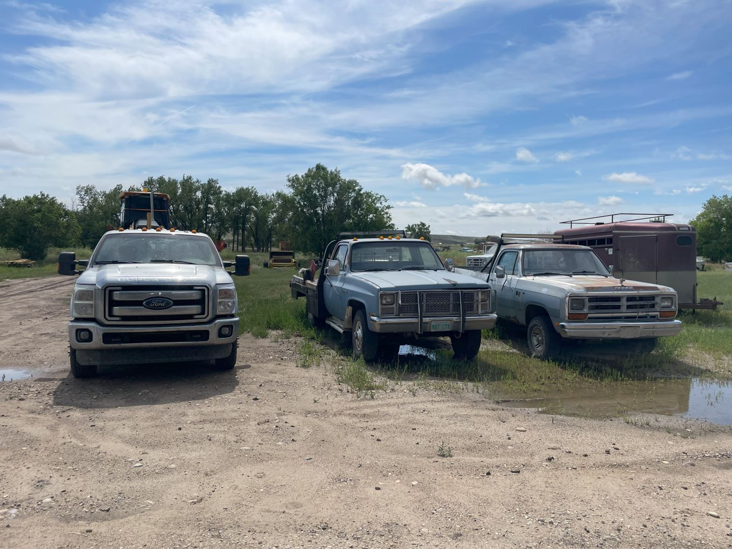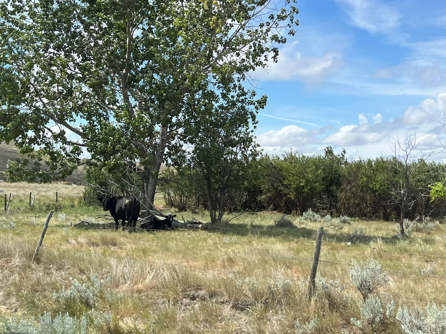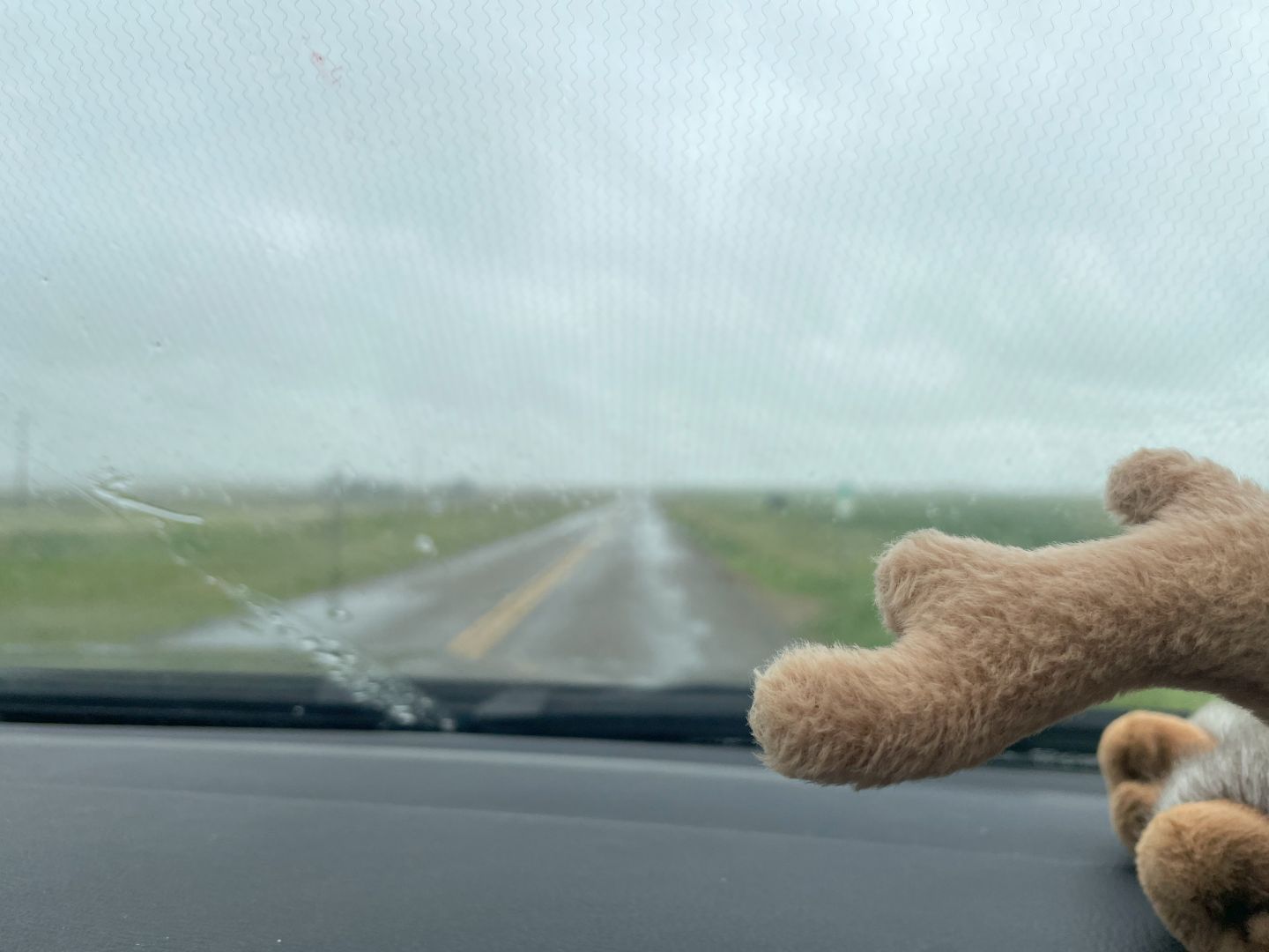 Der Himmel hat schon zugezogen als wir weiterfahren. Auf zum Glück besseren Straßen geht nach Norden Richtung Trans Canadian Highway zurück. Wie immer meist kerzengerade durch Weideland.