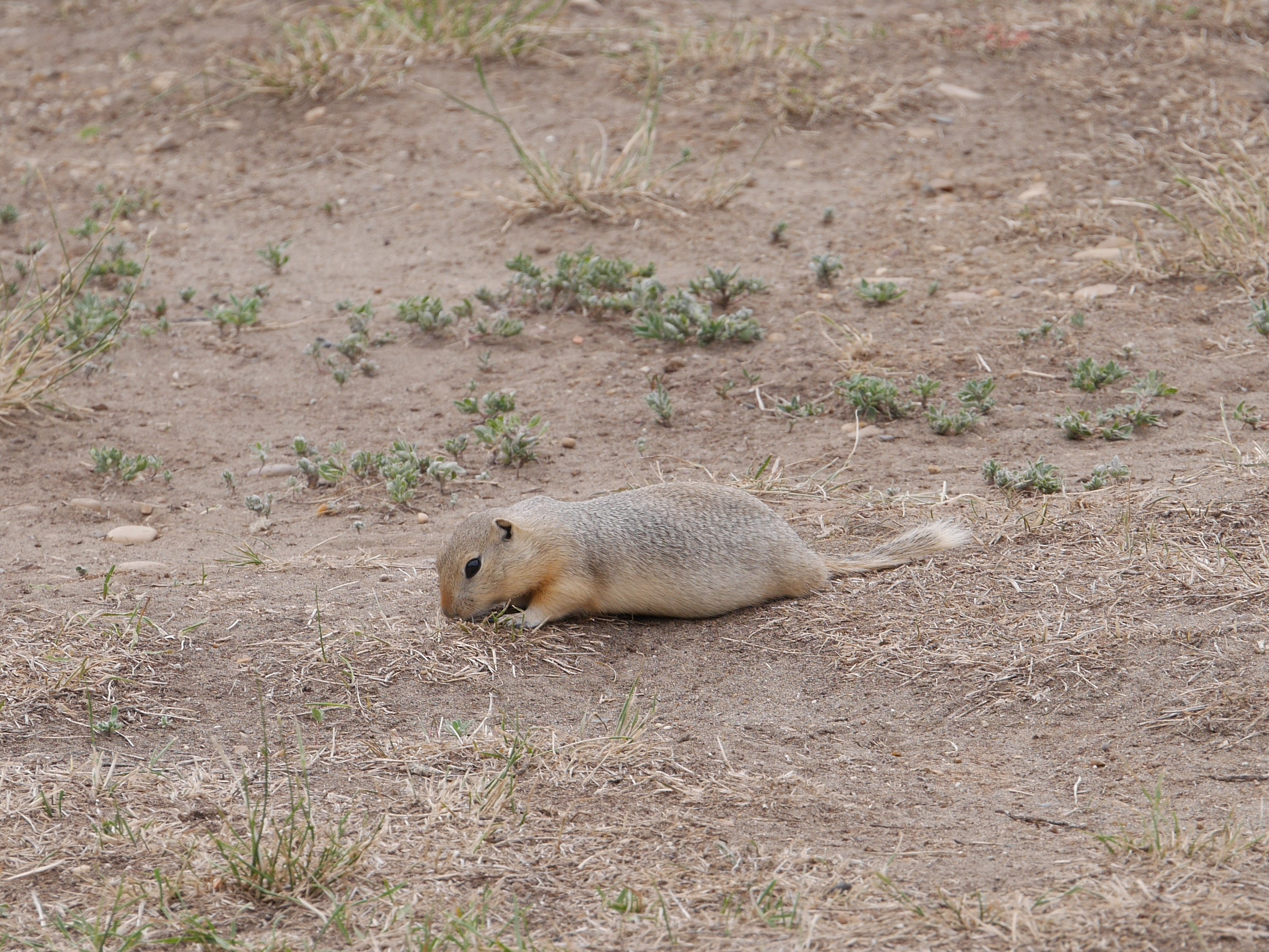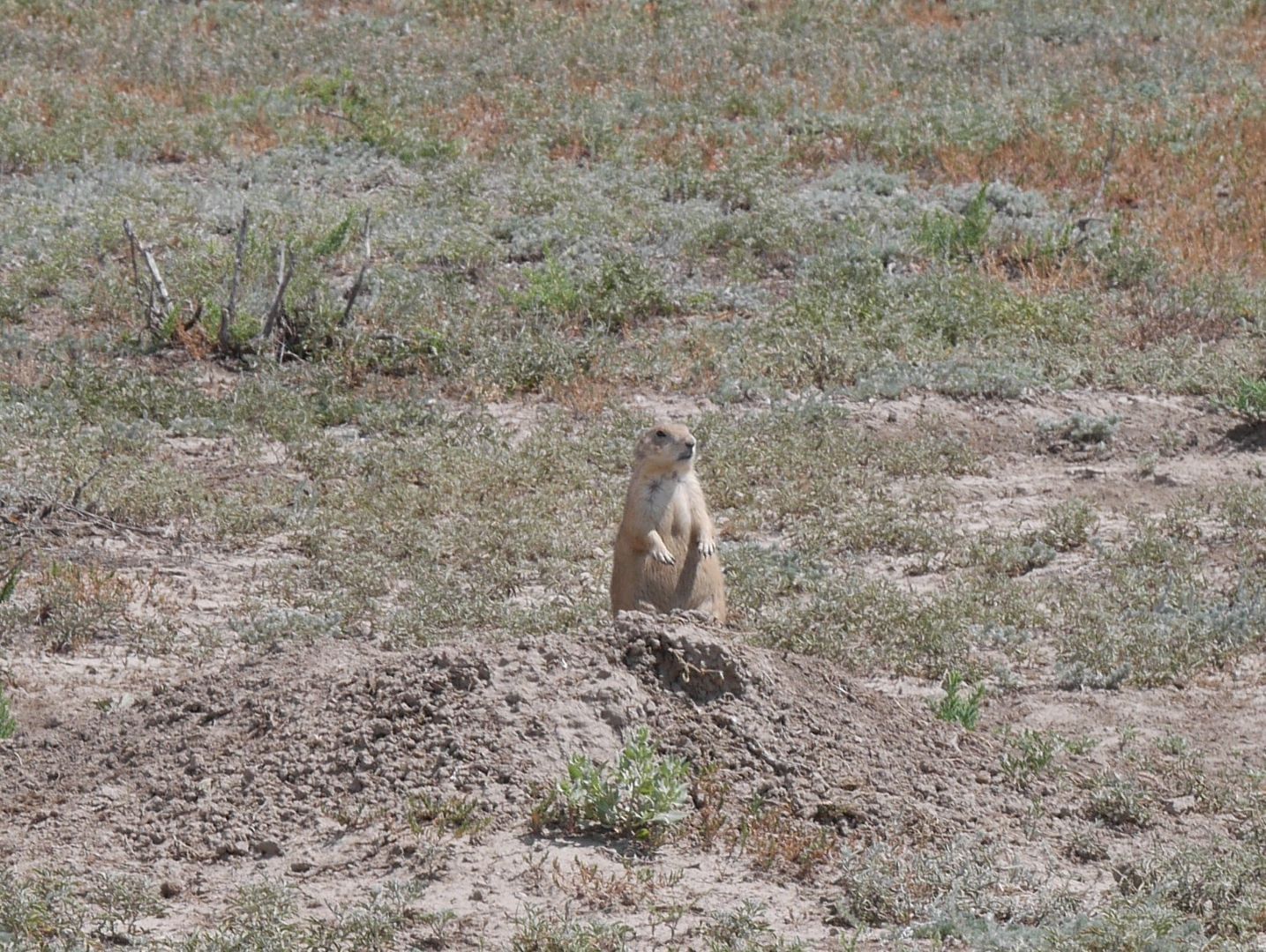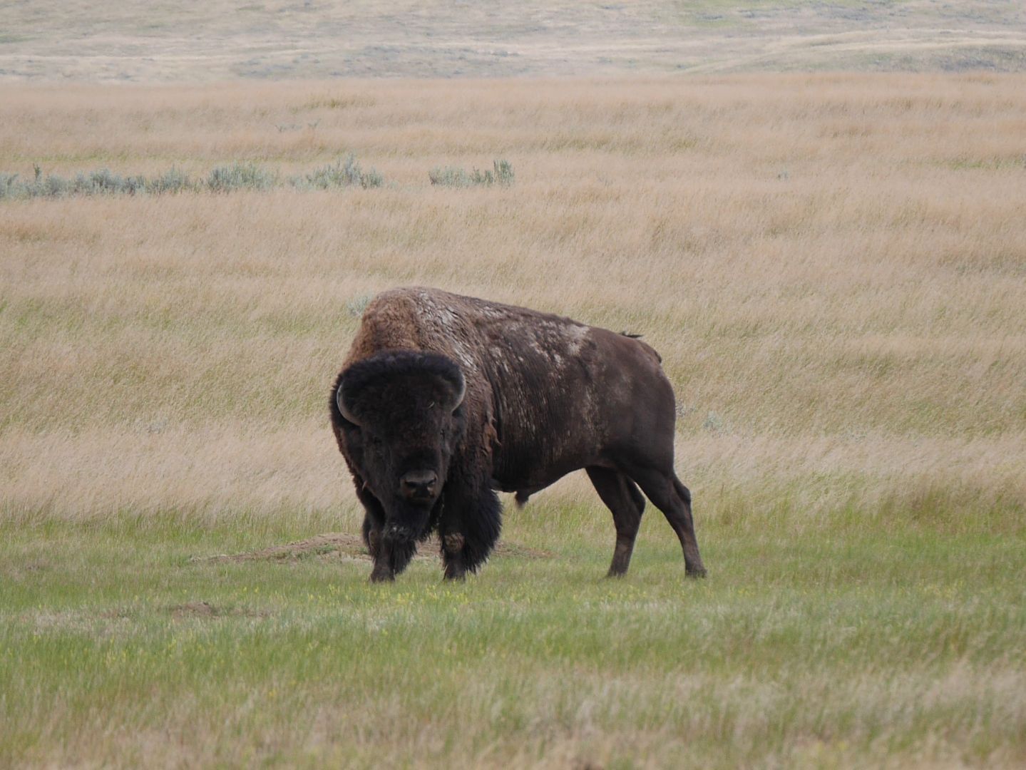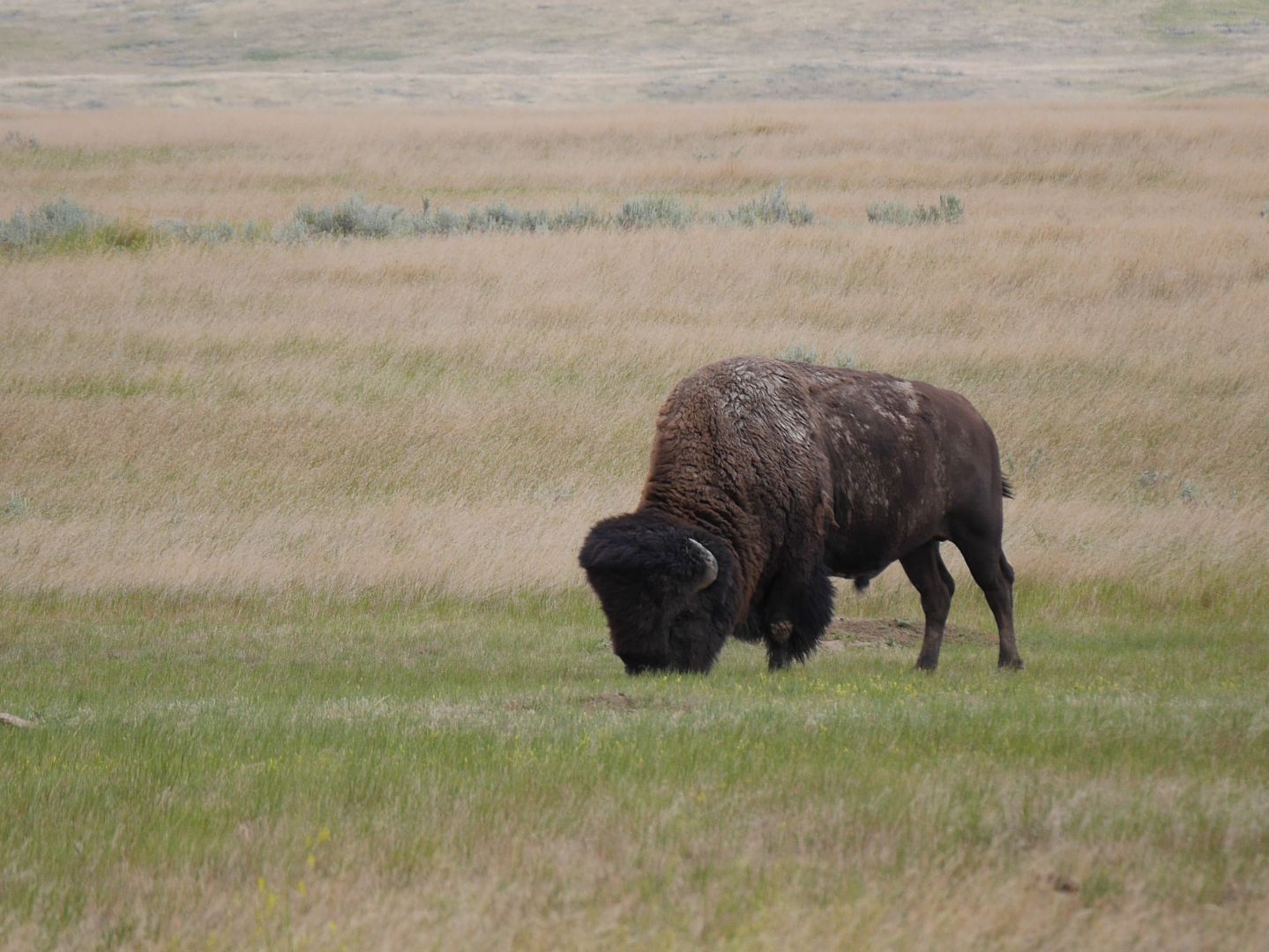 Wir fahren auf den Ecotour Scenic Drive im Park. Die so 20 km lange Schotterpiste schlängelt sich durch die beeindruckende Landschaft. Statt Bisons gibt's erstmal wieder nur unzählige Präriehunde und selbstmordgefährdete Vögel. An einem Aussichtspunkt erspähen wir dann einen braunen Fleck in der Ferne. Kamera raus. Maximaler Zoom ...Bild vergrößern ...tatsächlich das könnte einer sein🙂
