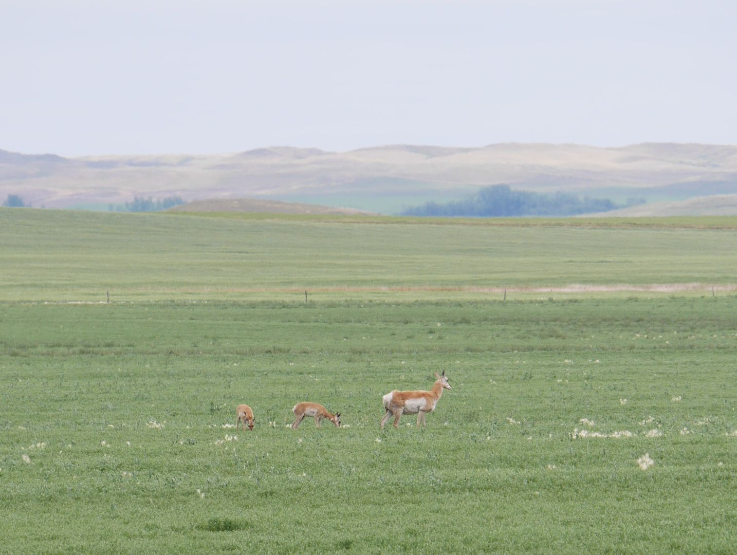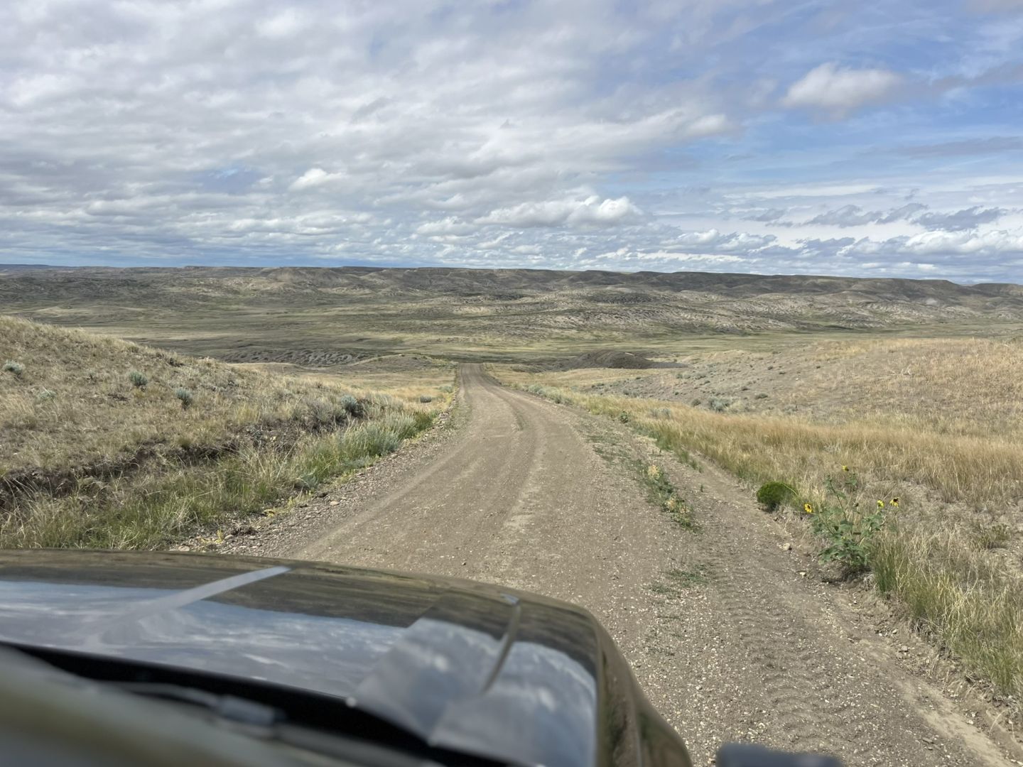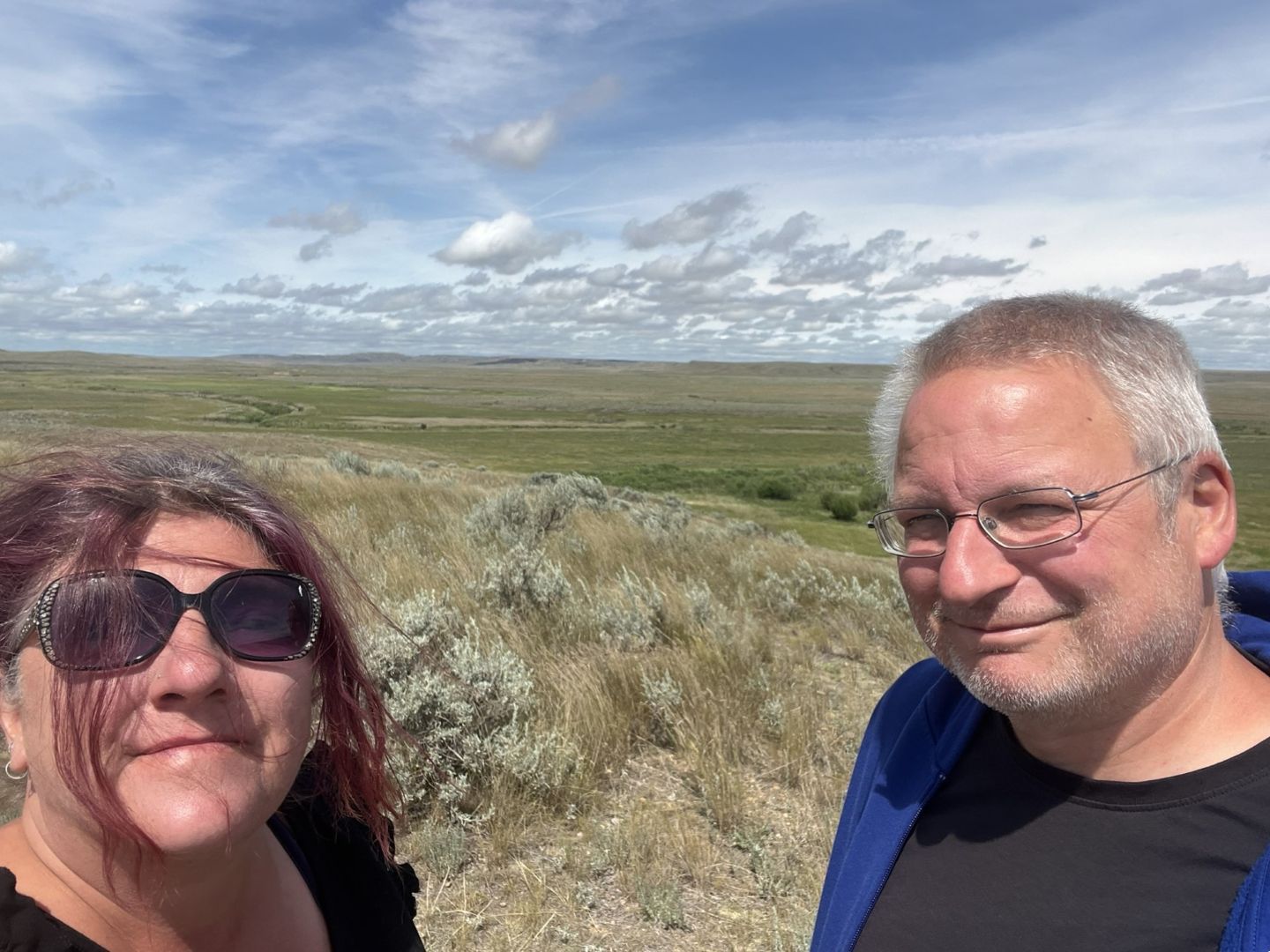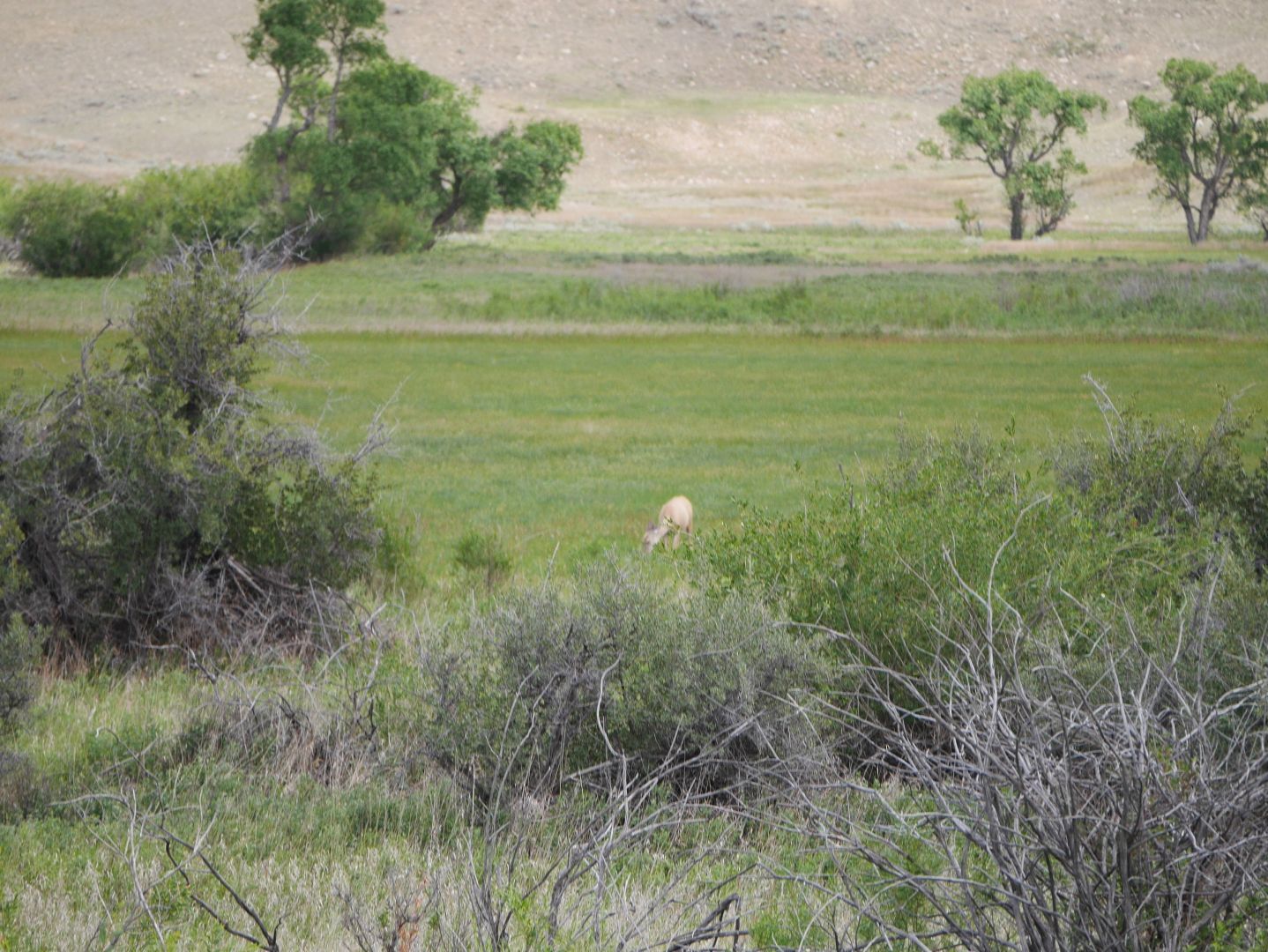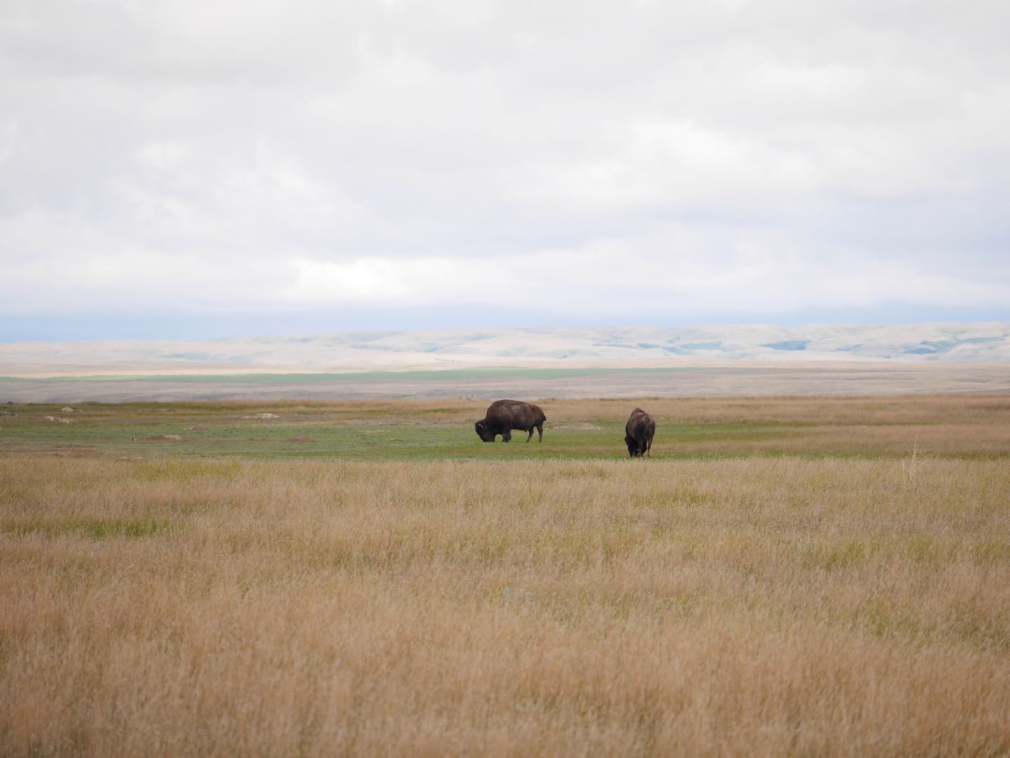 Wir fahren auf den Ecotour Scenic Drive im Park. Die so 20 km lange Schotterpiste schlängelt sich durch die beeindruckende Landschaft. Statt Bisons gibt's erstmal wieder nur unzählige Präriehunde und selbstmordgefährdete Vögel. An einem Aussichtspunkt erspähen wir dann einen braunen Fleck in der Ferne. Kamera raus. Maximaler Zoom ...Bild vergrößern ...tatsächlich das könnte einer sein🙂