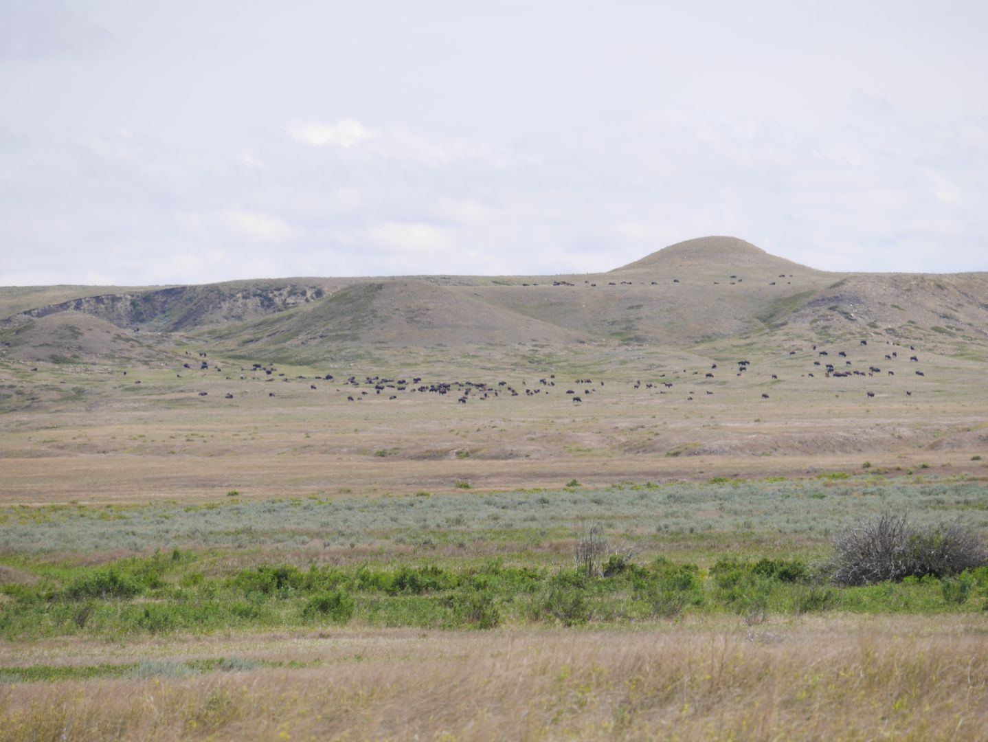 Wir fahren weiter und erspähen eine große Herde ...weit weg am andern Ende einer Senke am Hang. Keine Chance da näher ranzukommen. Hmpf 🙁 ...aber immerhin unseres ersten freilebenden Bisons 👍