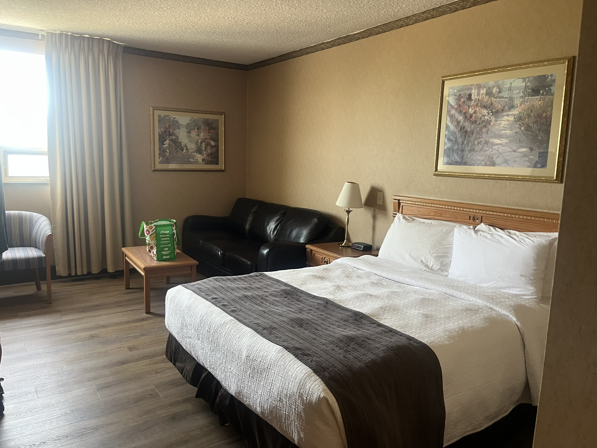 Wir vereinbaren, dass wir's Fahrzeug gleich morgens vorbeibringen ohne eine große Stecke zu fahren. Ein Camping fällt damit flach ...48 km ist der Nächste entfernt. Also ein Hotel, da ist auch eins grad in der Nähe ...leider ausgebucht 🙁 das Nächste 300m weiter ...auch ausgebucht Hmpf. Wir landen dann im 4 km entfernten Glenmore Inn. Das kostet „nur" 179,- CA$ + Steuer natürlich. Ein bisschen bescheiden siehts schon aus. Wir essen noch in einem kleinen Pizza-Imbiss. Die Pizzen sind ganz gut und trotz „small" noch so groß, dass doch einiges übrigbleibt.