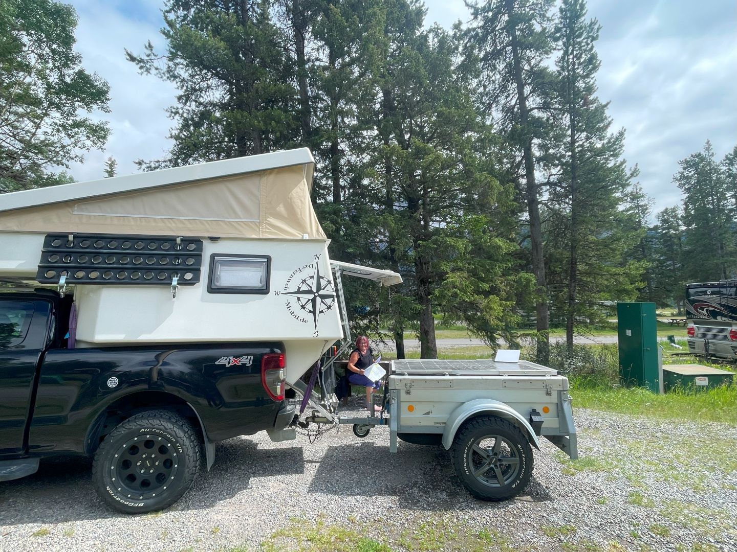 Gleich 3 gibt's direkt bei Banff, die es zusammen auf so 1200 Plätze bringen. Wir fahren einen der auf dem Sattelitenbild sonnig aussieht an ...und bekommen den letzten Platz für eine Nacht, eine zweite geht nicht alles ausgebucht ...Ach du Schreck😮 Auf Nachfrage wird uns erklärt, dass sobald die Campjngplätze hier aufmachen alles sofort ausgebucht sind. Oh oh, das kann ja heiter werden.