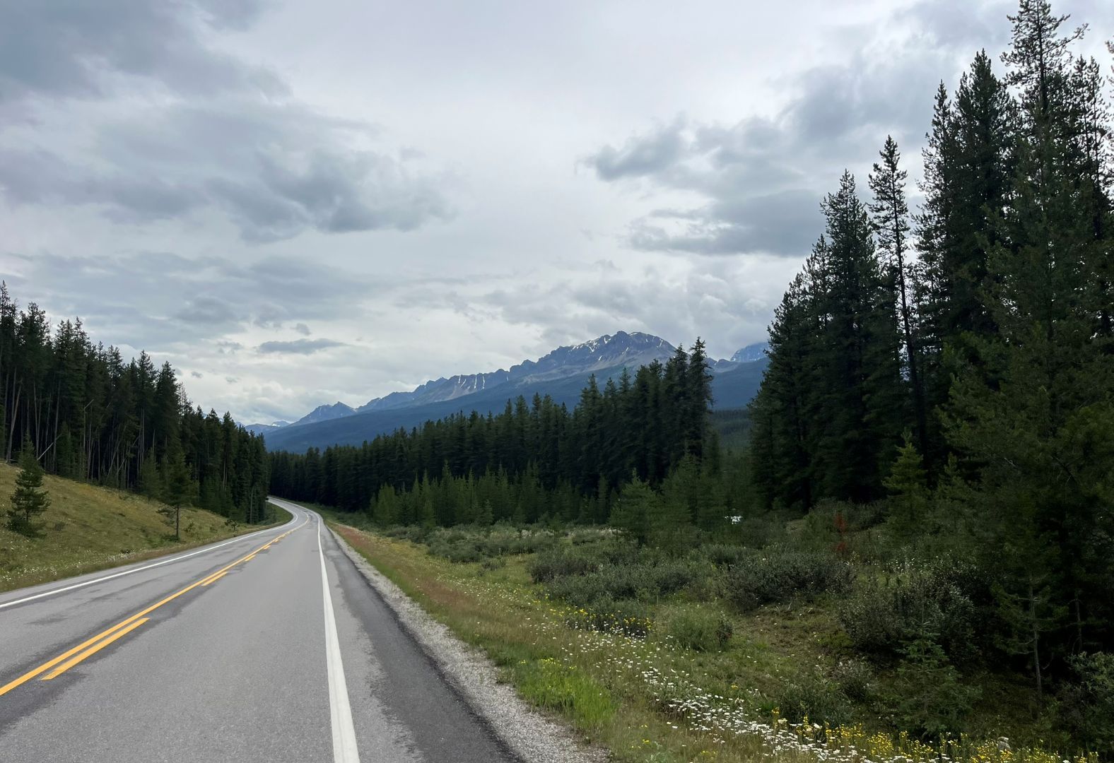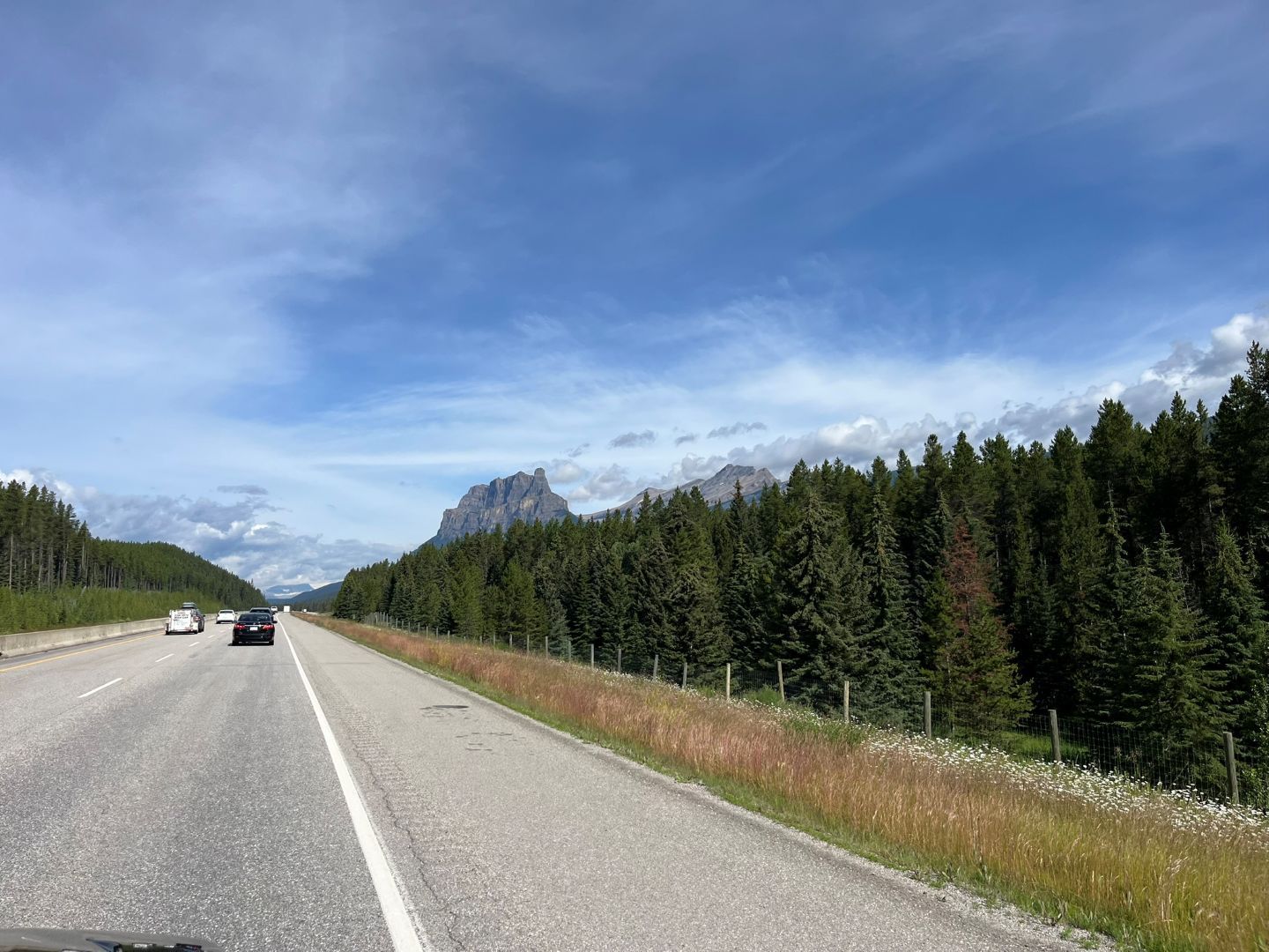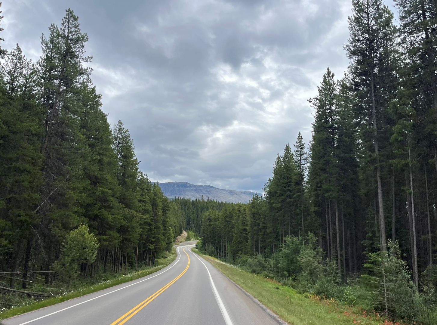 Das Programm (Lake Minnewanka, ggf. Johnson Lake, Bow Valley Parkway, Lake Louise und Moraine Lake) für diesen Tag wird umgestellt. Wir fahren erst zum Lake Louise und zum Moraine Lake. Die beiden sind die bekanntesten Ausflugsziele im Banff National Park und der Reiseführer empfiehlt entweder früh oder spät diese beiden zu besuchen. Den Moraine-See hätte man eigentlich über eine Piste anfahren können aber auf der am Camping ausgehändigten Karte steht bereits das der Weg 2025 für private Fahrzeuge gesperrt ist, dafür gäbs Shuttlebusse. Wir trinken nur Kaffee und los geht's, frühstücken können wir ja dann am Lake Louise ....denken wir🙄... Ab auf den Trans Canadian Highway und los geht's zum knapp 60 km entfernten gleichnamigen Ort im Tal. Das Wetter ist noch gut (soll aber schlechter werden im Laufe des Tages) und man kann schön die Rocky‘s bewundern ...wirkt ein bisschen wie in Österreich.