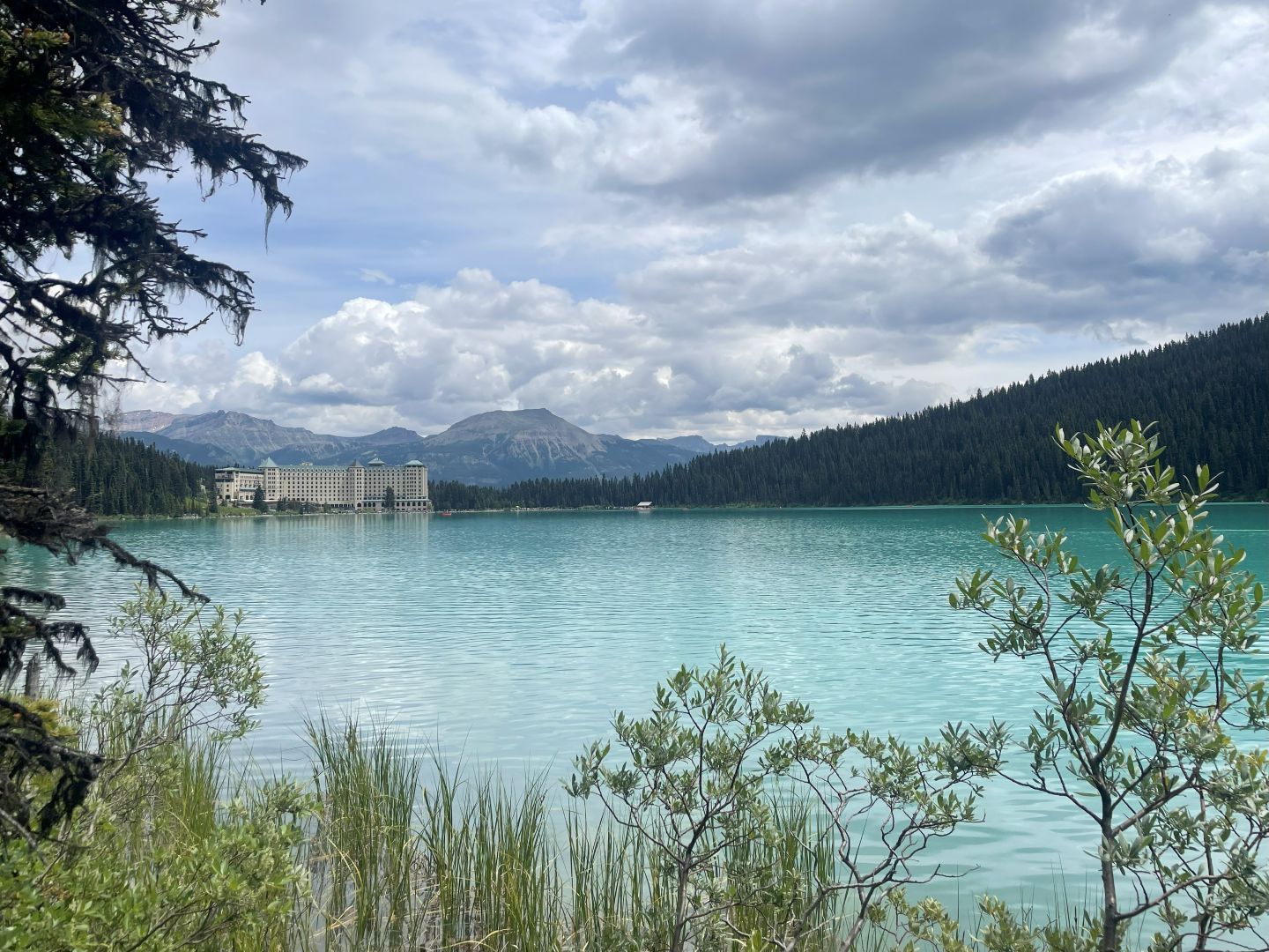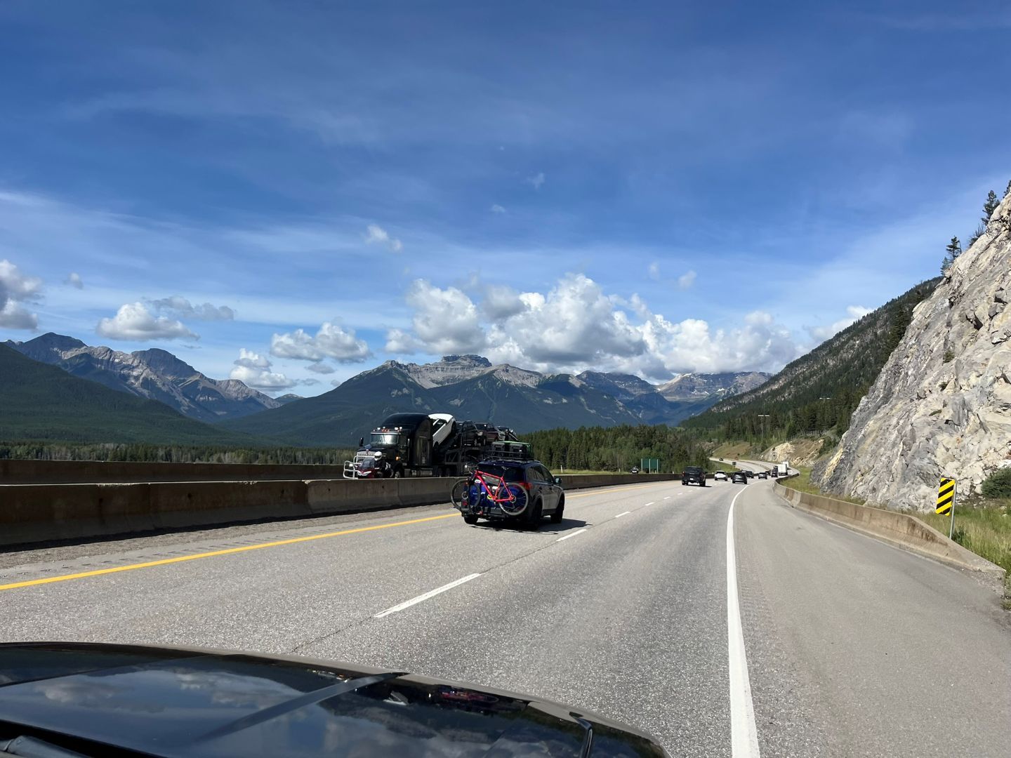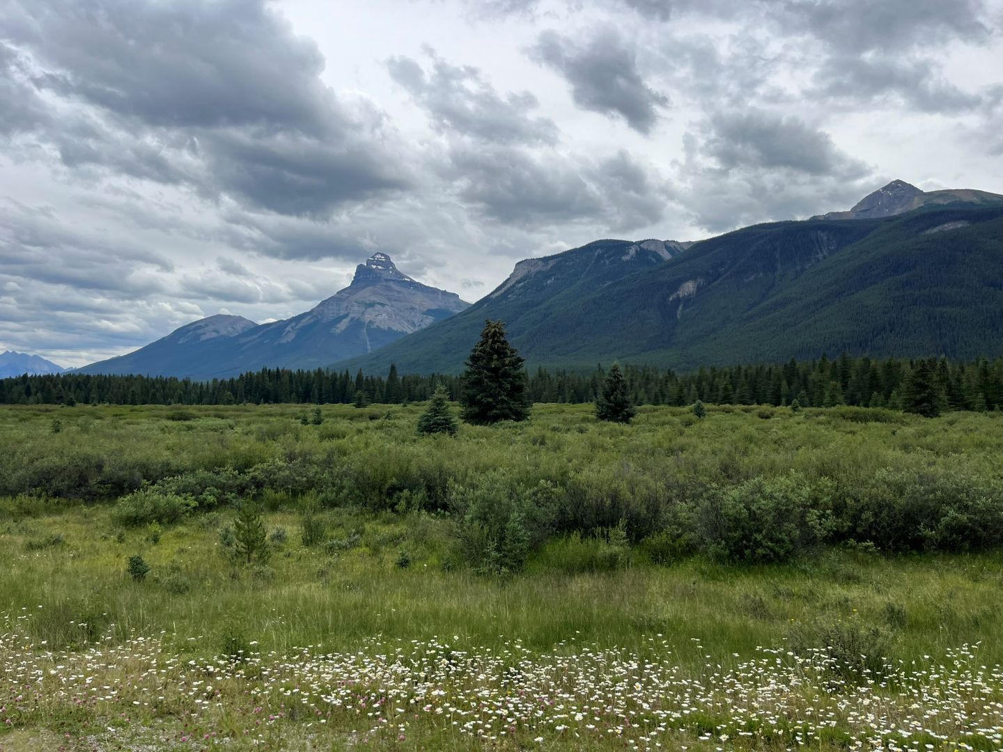 Das Programm (Lake Minnewanka, ggf. Johnson Lake, Bow Valley Parkway, Lake Louise und Moraine Lake) für diesen Tag wird umgestellt. Wir fahren erst zum Lake Louise und zum Moraine Lake. Die beiden sind die bekanntesten Ausflugsziele im Banff National Park und der Reiseführer empfiehlt entweder früh oder spät diese beiden zu besuchen. Den Moraine-See hätte man eigentlich über eine Piste anfahren können aber auf der am Camping ausgehändigten Karte steht bereits das der Weg 2025 für private Fahrzeuge gesperrt ist, dafür gäbs Shuttlebusse. Wir trinken nur Kaffee und los geht's, frühstücken können wir ja dann am Lake Louise ....denken wir🙄... Ab auf den Trans Canadian Highway und los geht's zum knapp 60 km entfernten gleichnamigen Ort im Tal. Das Wetter ist noch gut (soll aber schlechter werden im Laufe des Tages) und man kann schön die Rocky‘s bewundern ...wirkt ein bisschen wie in Österreich.