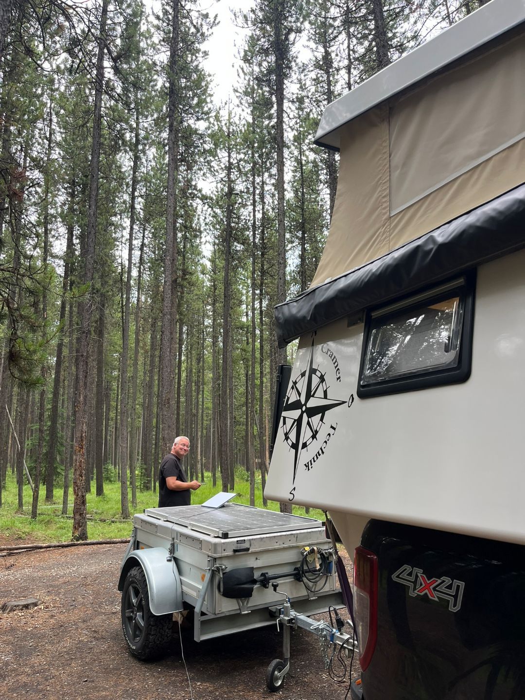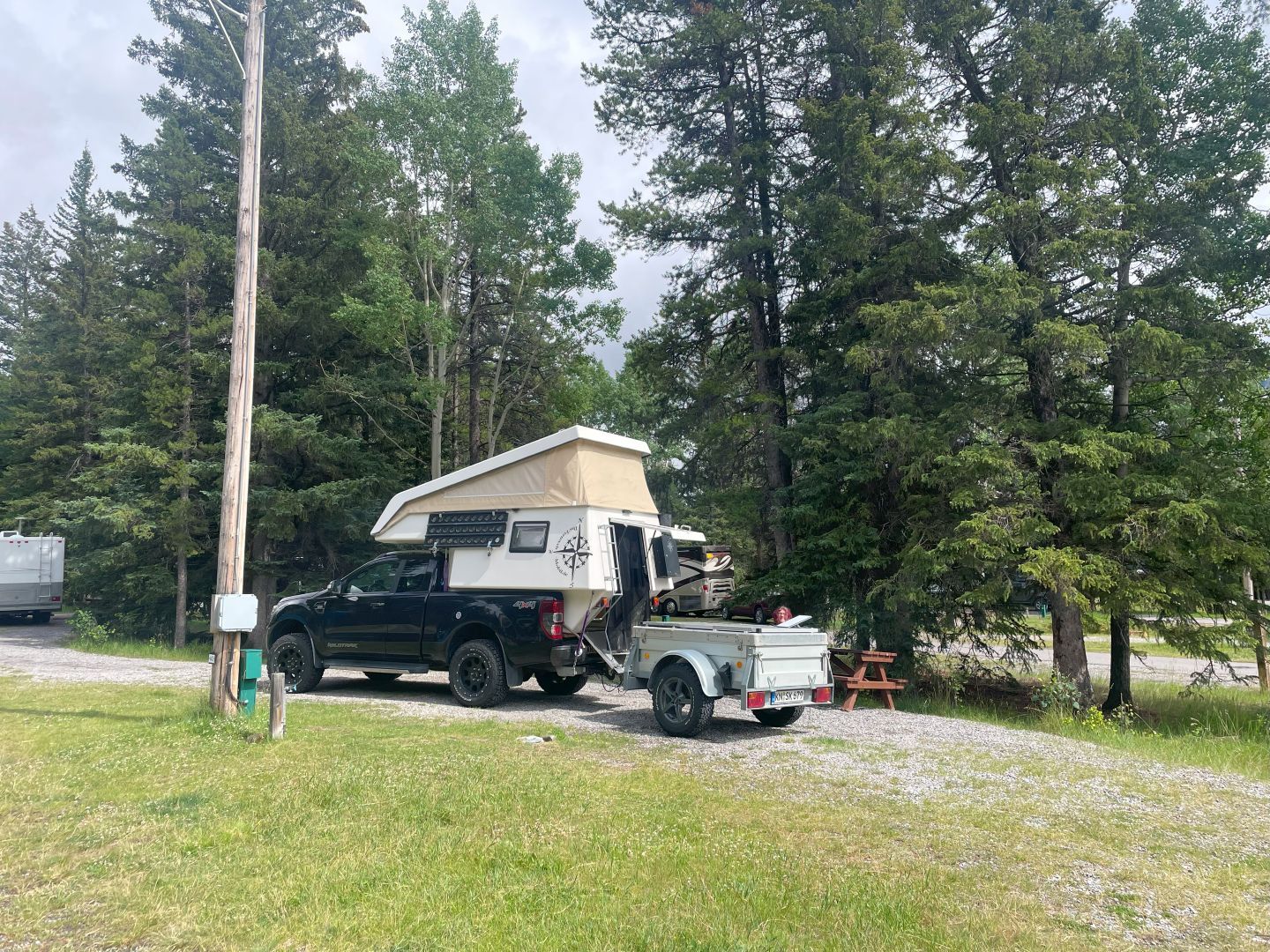 Es geht auf den Two Jack Lake Main Camping in der Nähe des gleichnamigen Sees. Da gibts auch noch einen weiteren Campjng am See. Unserer liegt jedenfalls direkt im dunkelsten Wald ...Ohjeee. Da wir Feuerholz zwangsweise mitbezahlen mussten, beschließen wir ein Lagerfeuer zu machen... Holz gibt's, wie könnte auch anders sein, am anderen Ende des Campings. Also nochmal losfahren und Holz holen. Zurück erstmal Internet aufbauen und neuen Platz buchen ...gibts nur noch bei Jasper (Overflow heißt der, und wird nur aufgemacht, wenn alles andere überfüllt ist) ...Ok buchen ...mit Starlink wird das nix ...immer 15 Sekunden I-Net und dann geht 5 Min nix. Wir kommen immer bis zu den Kreditkarten-Daten und dann geht gar nix mehr. Mit Mobilfunk geht noch weniger ...nämlich überhaupt nix!