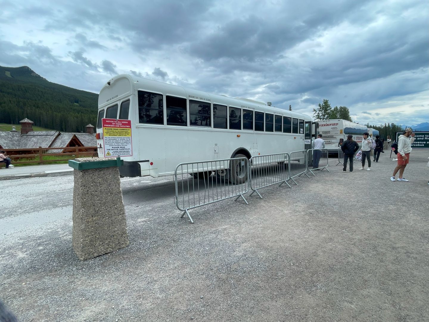 Wir sind schon leicht genervt von der Suche nach Ticketverkaufsstelle (war bei der Bar/Restaurant ...mit Beschilderung haben's die hier nicht so) kommt schon gleich der große Schock. Für das Shuttle Hin-& Zurück zum Lake Louise will man 55,-CA$ ...pro Person! Will man auch noch zum Moraine Lake sind gleich 125,- 😖👎👎. Das ist eine absolut freche Touri-Abzocke hier. Ein Zeitfenster muss man auch noch wählen. Die Mitnahme wird dann auch nur für die gewählten Zeiten garantiert. Und das wird beim Einsteigen mit Namenslisten auch geprüft.