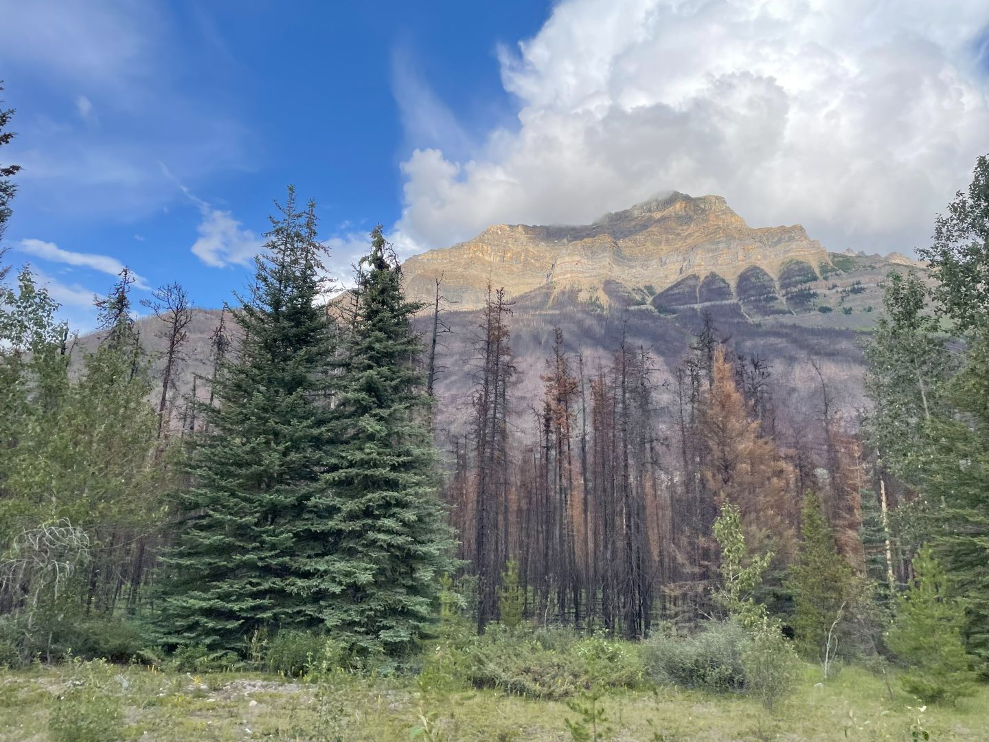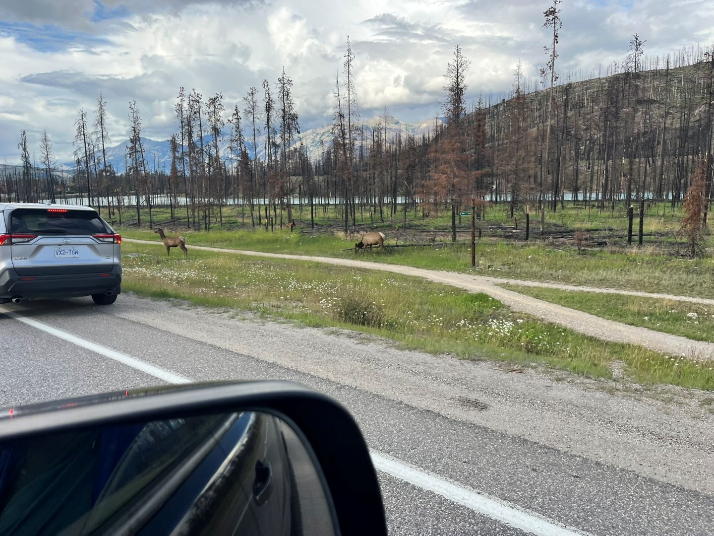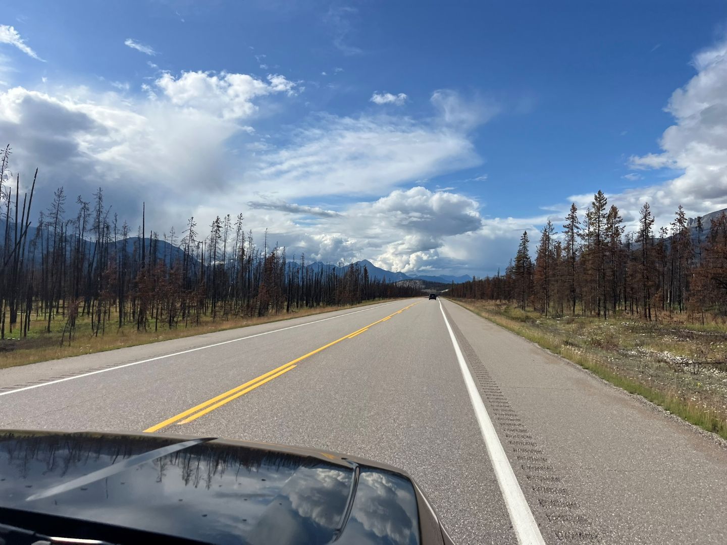 So 35 Km vor Jaspar sieht man dann die ersten Waldbrandgebiete. Es geht nicht lang und die abgefackelten Gebiete reichen von Baumgrenze links durchs komplette Tal bis Baumgrenze rechts am Berg. Alles abgefackelt nur noch Gras dazwischen und teilweise nicht mal mehr das. Richtig bedrückend wird die Stimmung🙁