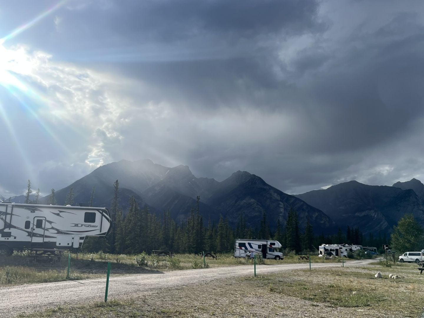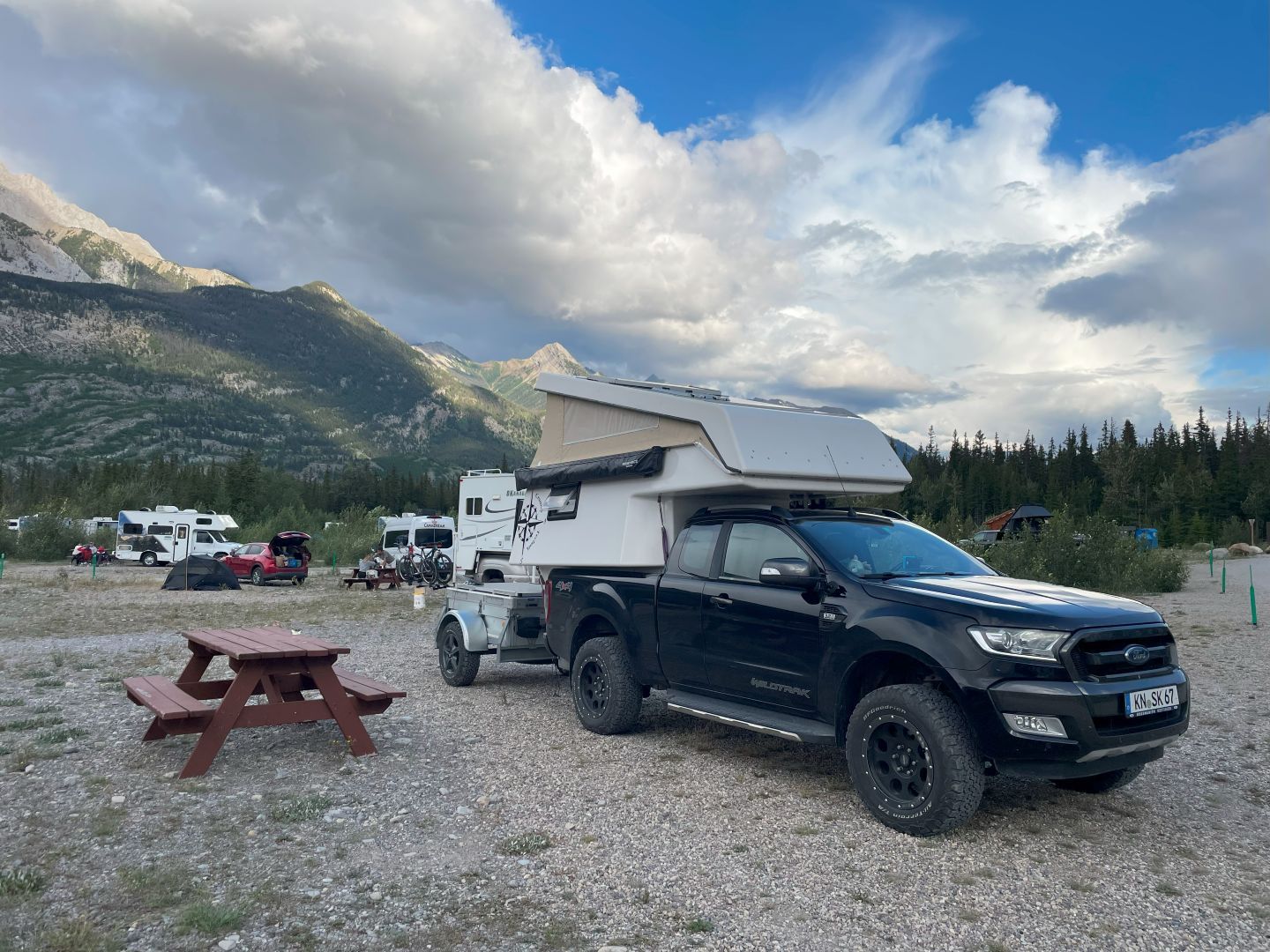 Wir fahren auf den Jasper Overflow Campground, der normalerweise nur aufgemacht wird, wenn alles andere überfüllt ist. Da der Große Waipiti Campground noch immer zum Großteil wegen den Brandschäden gesperrt ist dürfte dieser hier wohl dauerhaft auf sein.