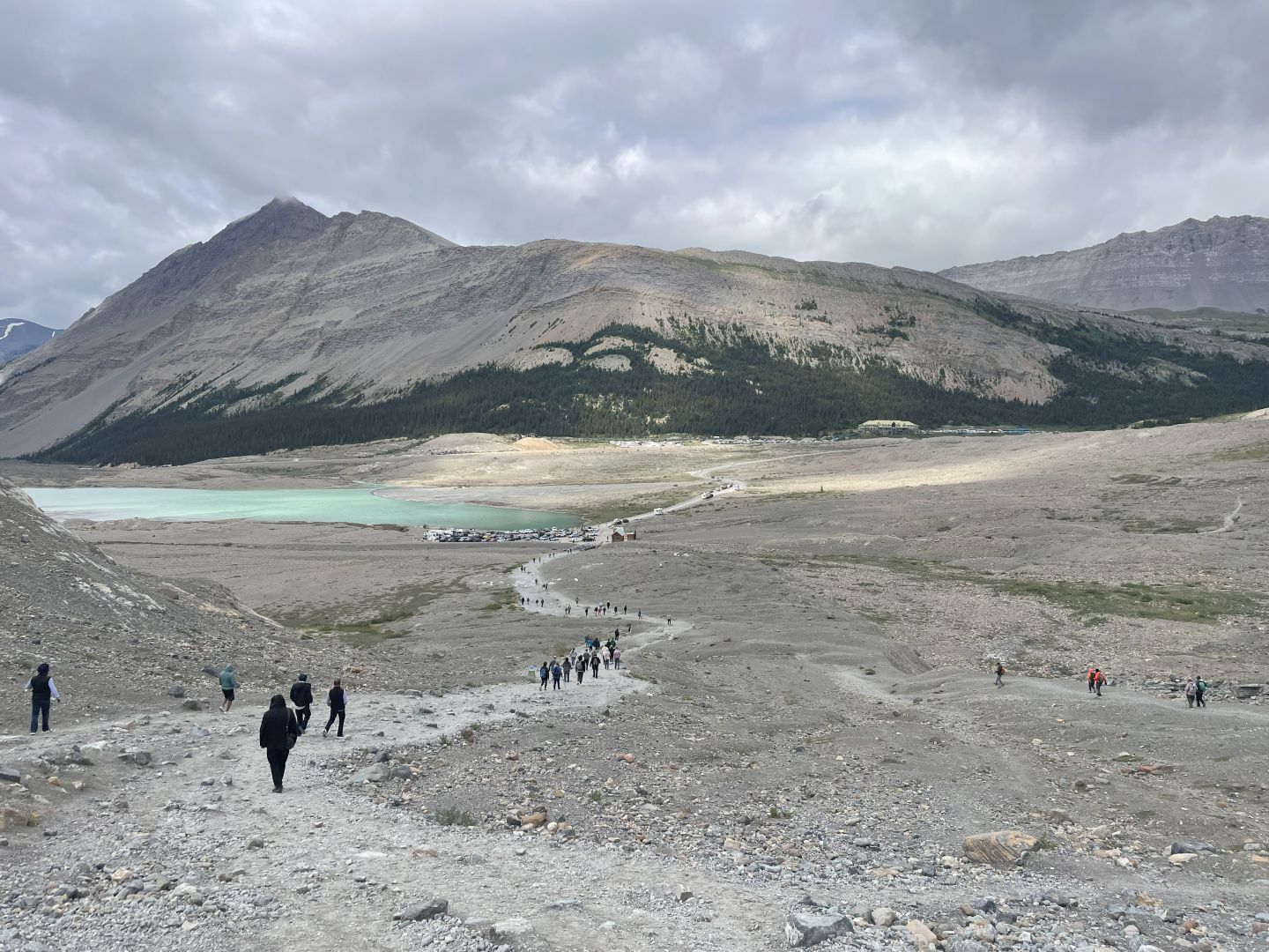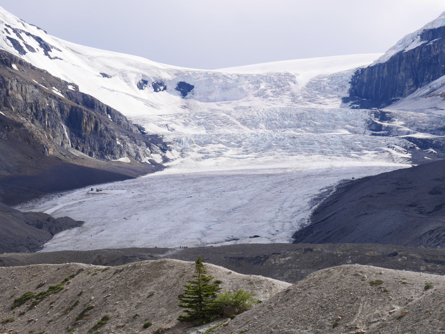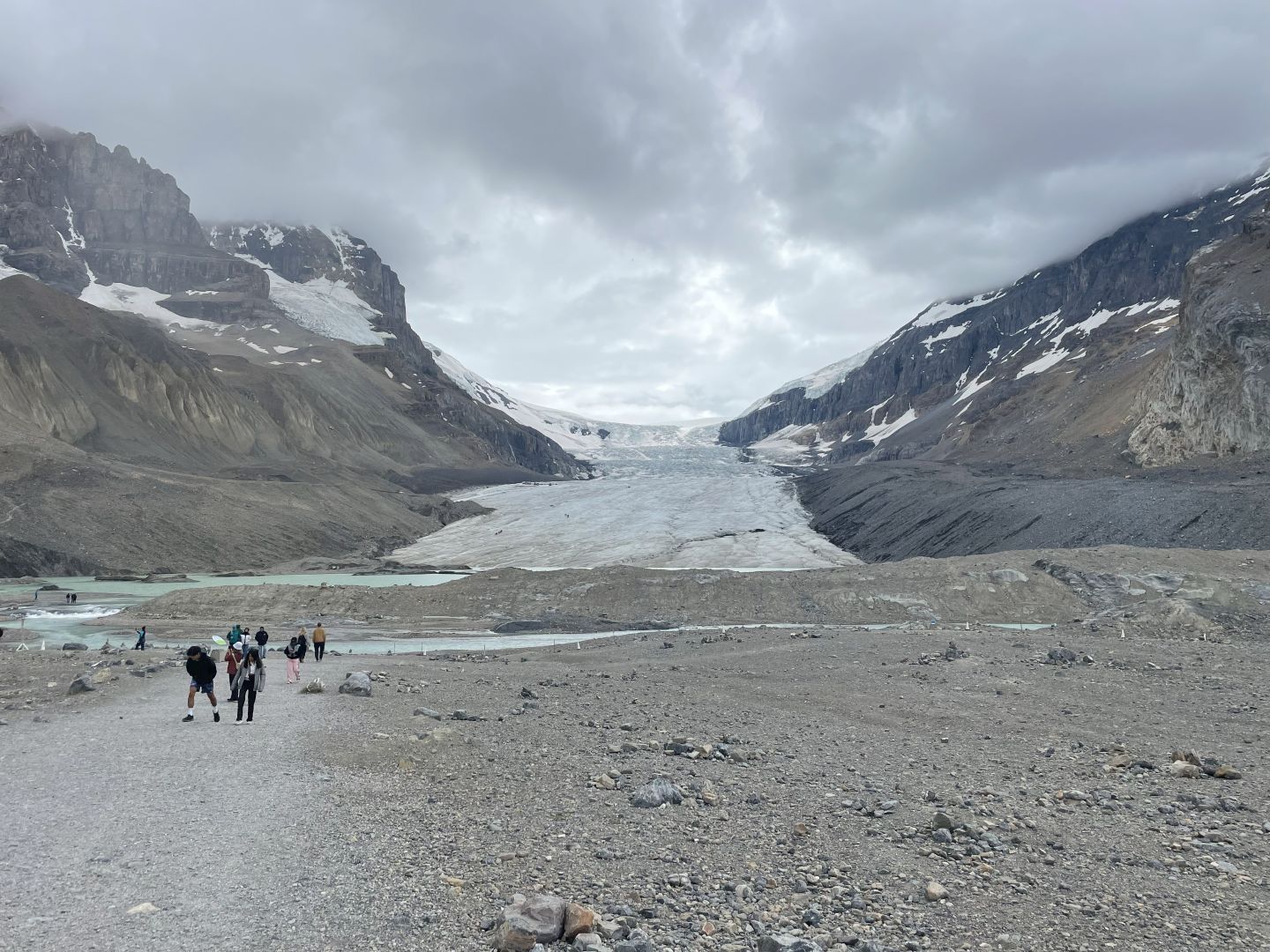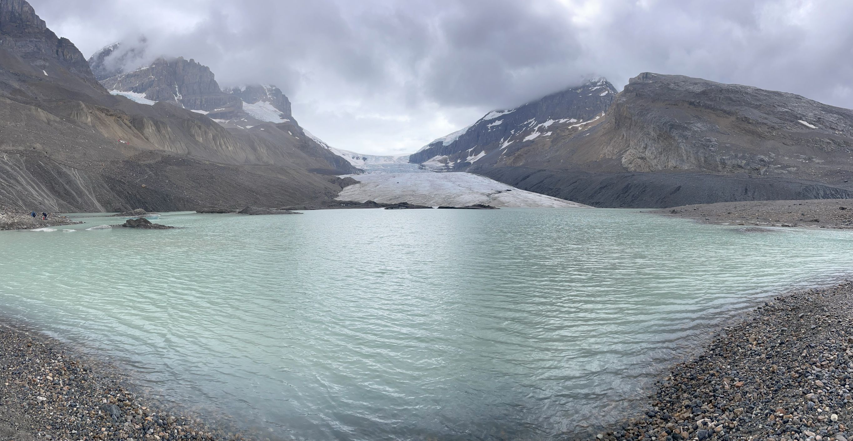 Dann gehts nochmal zum Columbia Icefield. Vom Icefield Center aus werden geführte Touren auf den Athabasca-Gletscher angeboten, das ist einer der 8 großen Gletscher die sich aus dem Eisfeld speisen. Auch mit Spezial-Bussen die auf den Gletscher fahren. Wenn ich das aber richtig gesehen hab, fahren die über eine Piste seitlich auf den Gletscher und dort dann nicht mehr all zu weit. Die „Ice Odysee" mit einem lustig aussehenden Spezial-Fahrzeug klingt da schon interessanter, kostet aber auch nicht zu knapp. Da wir hier in Kanada eh schon zu viel Geld ausgeben sparen wir uns das, und laufen zum Gletcherfuß. Bis ganz kommen wir nicht ran, dafür hätte man um den Gletschersee am Fuße noch einen großen und vor allem steilen Umweg über den Rand laufen müssen und es beginnt bereits zu regnen. Aber auch so war das gut🙂👍