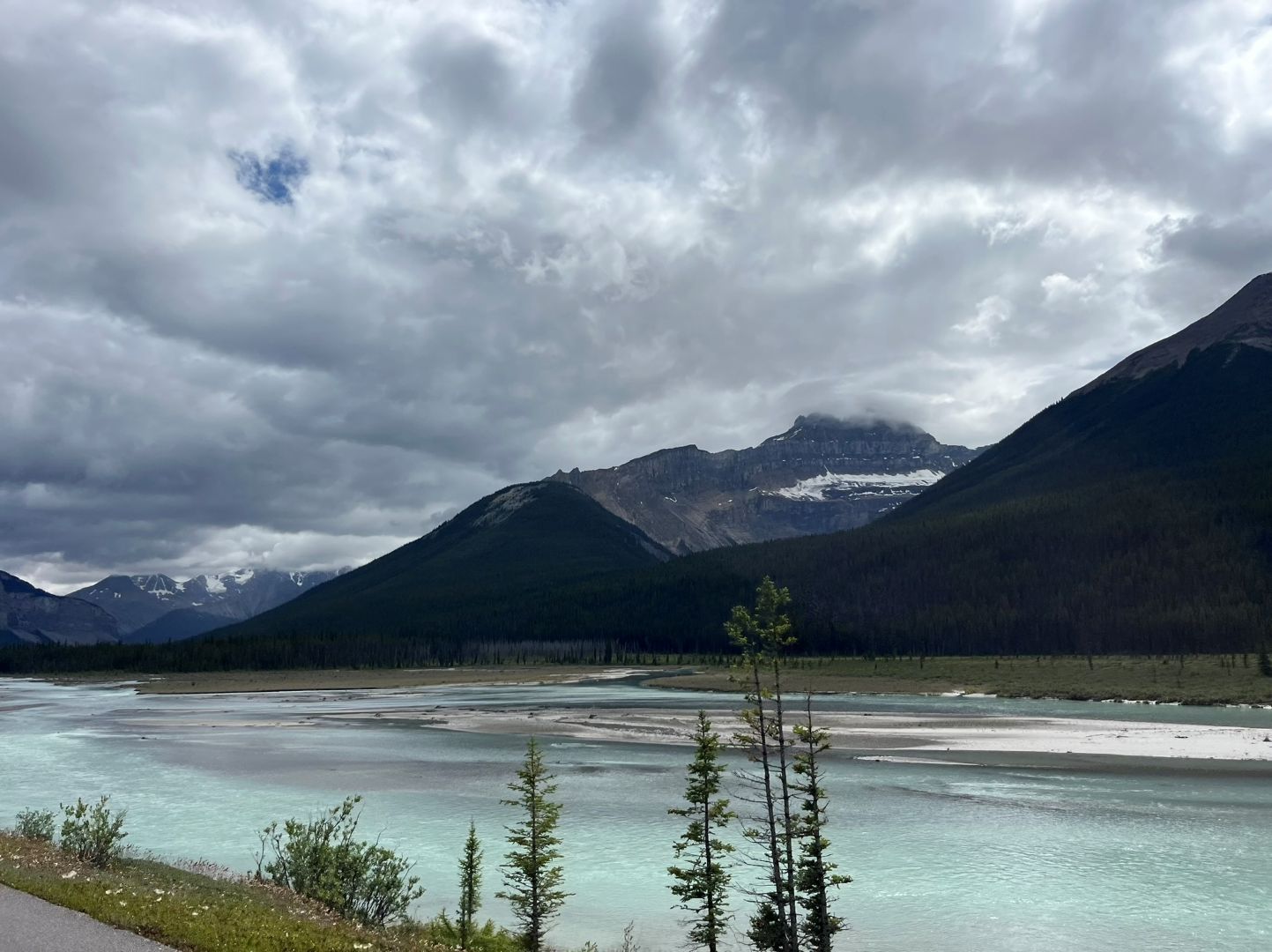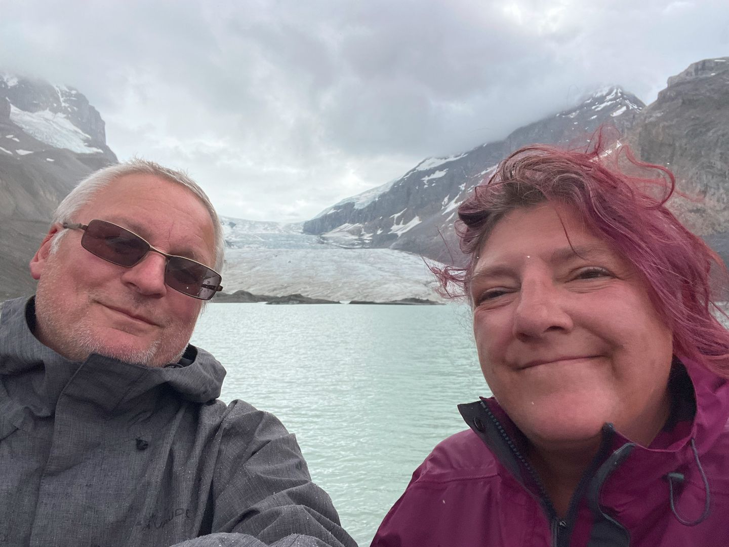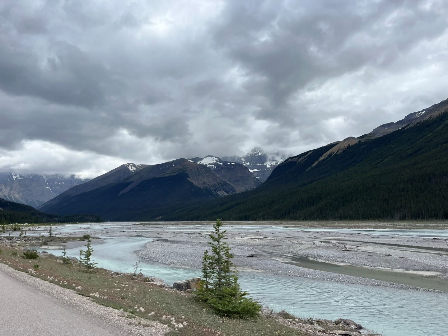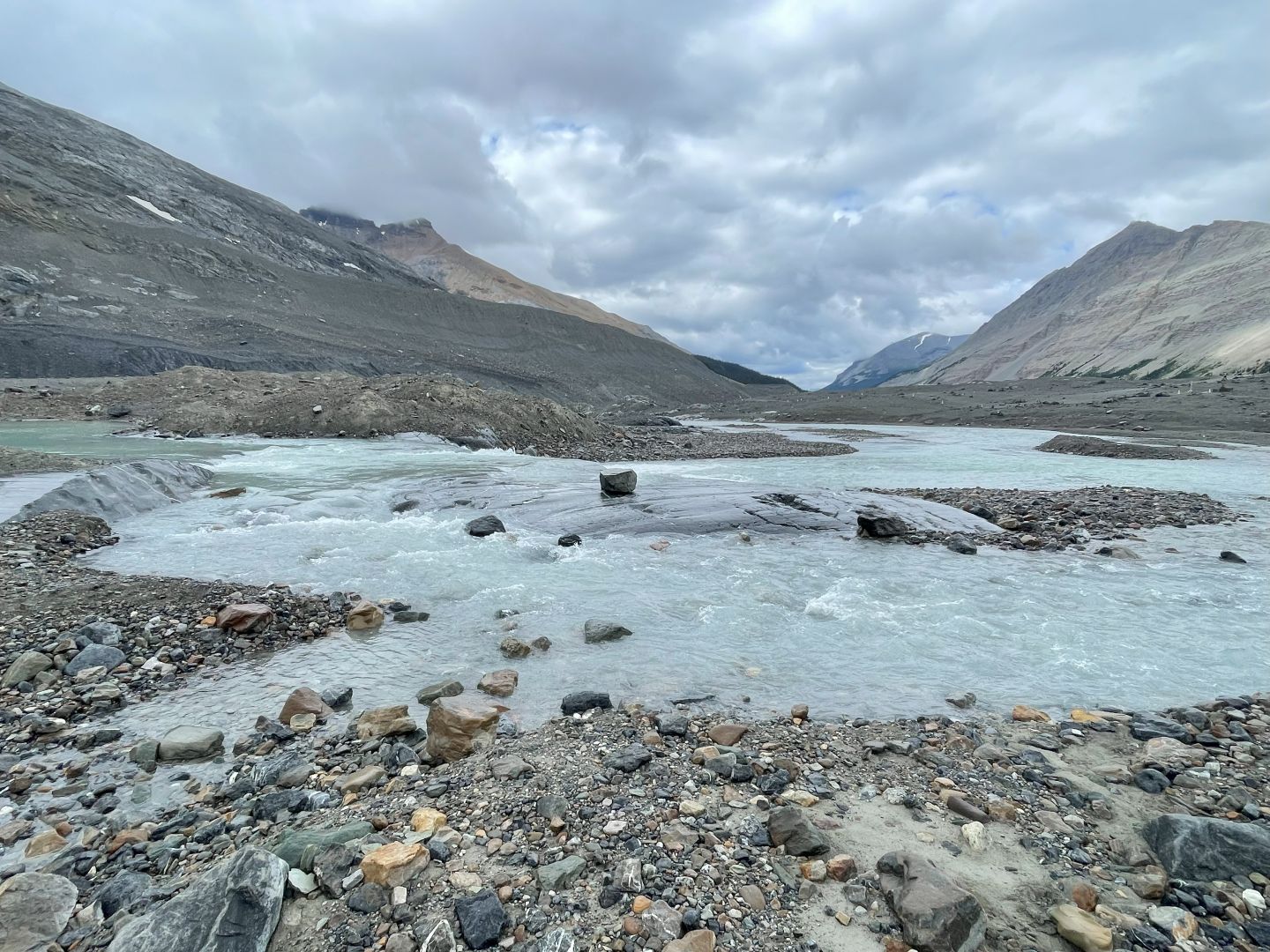Dann gehts nochmal zum Columbia Icefield. Vom Icefield Center aus werden geführte Touren auf den Athabasca-Gletscher angeboten, das ist einer der 8 großen Gletscher die sich aus dem Eisfeld speisen. Auch mit Spezial-Bussen die auf den Gletscher fahren. Wenn ich das aber richtig gesehen hab, fahren die über eine Piste seitlich auf den Gletscher und dort dann nicht mehr all zu weit. Die „Ice Odysee" mit einem lustig aussehenden Spezial-Fahrzeug klingt da schon interessanter, kostet aber auch nicht zu knapp. Da wir hier in Kanada eh schon zu viel Geld ausgeben sparen wir uns das, und laufen zum Gletcherfuß. Bis ganz kommen wir nicht ran, dafür hätte man um den Gletschersee am Fuße noch einen großen und vor allem steilen Umweg über den Rand laufen müssen und es beginnt bereits zu regnen. Aber auch so war das gut🙂👍