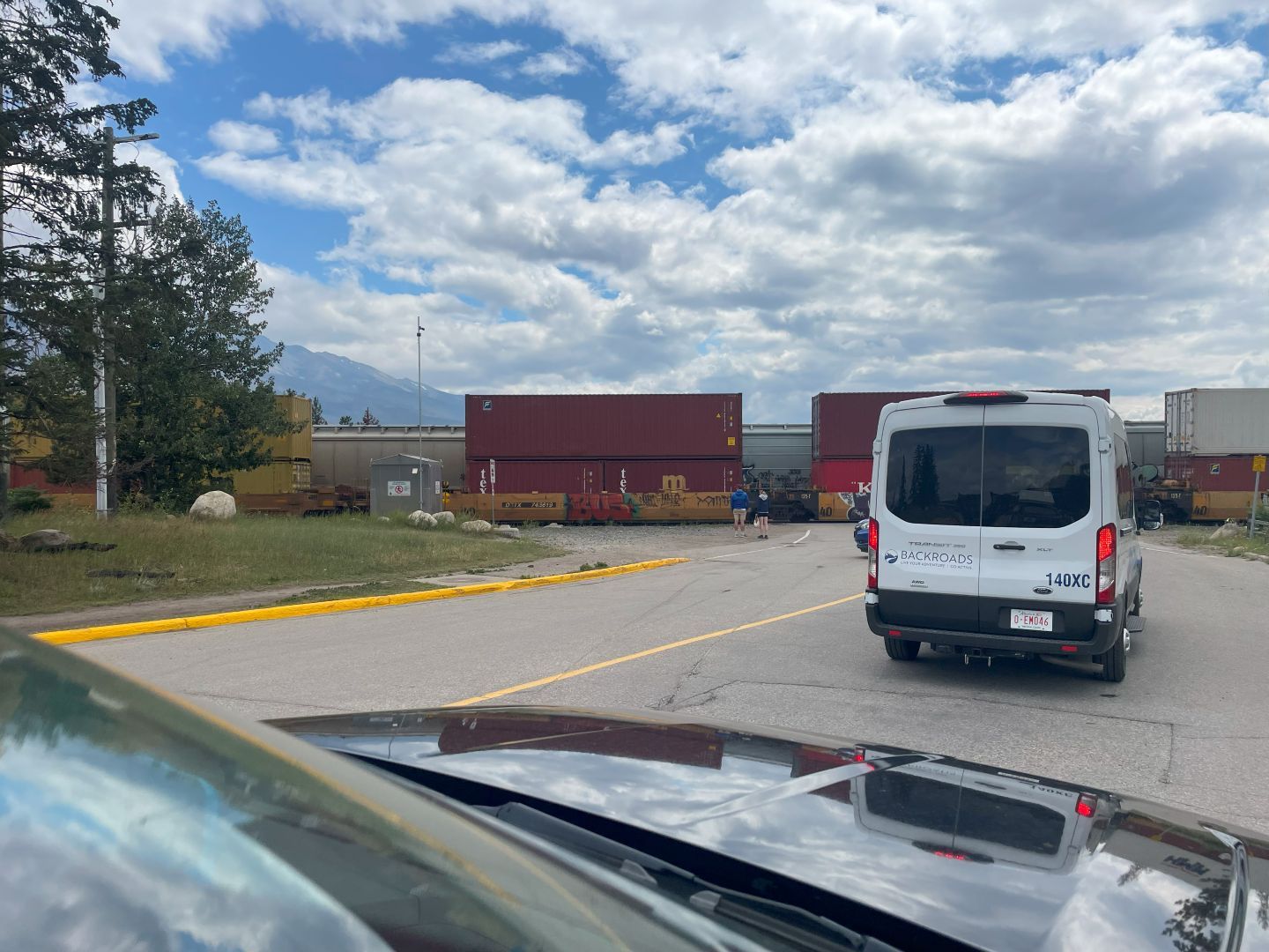 Zurück bei Jasper gehts nochmal tanken... es ist viel los an den beiden verbliebenen Tankstellen, zwei weitere sind abgebrannt. Am Bahnübergang in Jaspar stehen wir sage und schreibe 12 Minuten bis die beiden Züge durch sind.