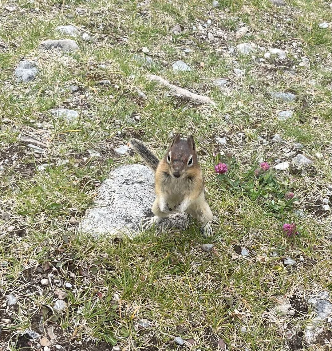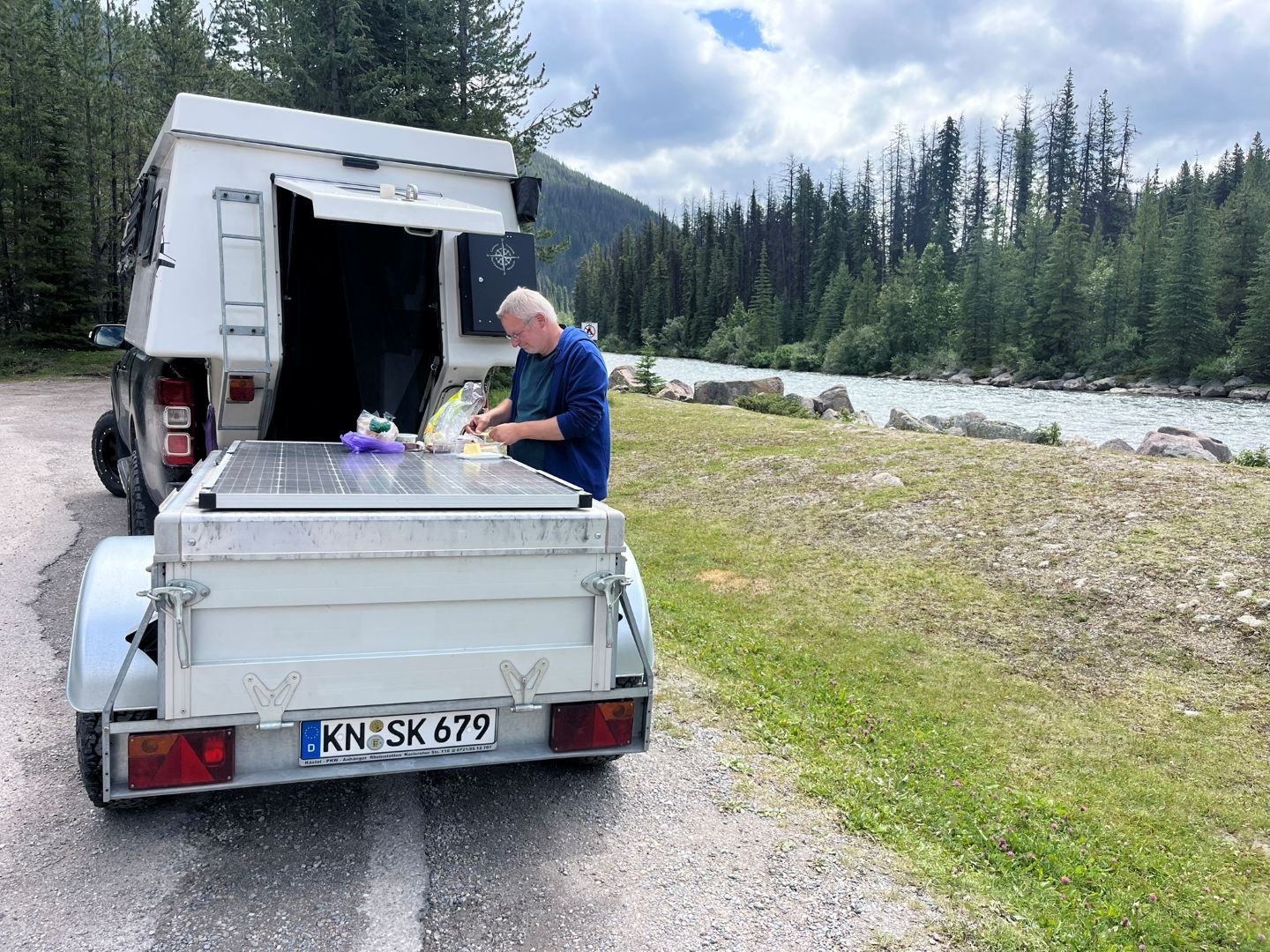 An einem ruhigen Plätzchen am Maligne River machen wir aber erst noch Frühstück ...und werden gleichmal von einem Bettler belästigt🙄