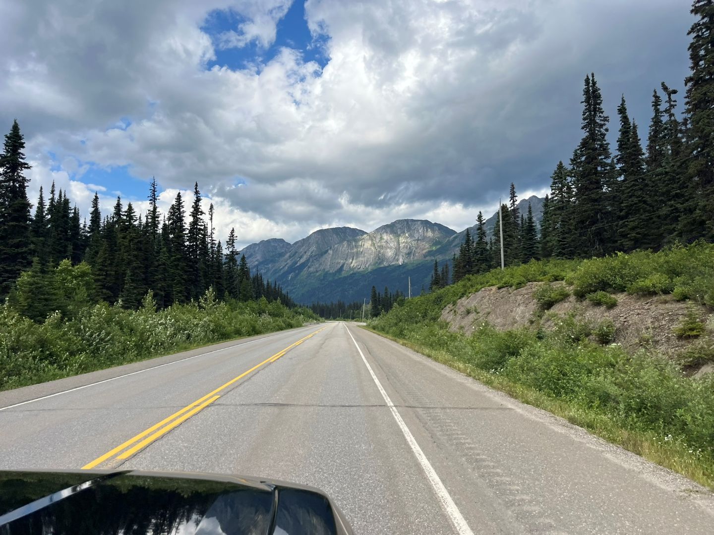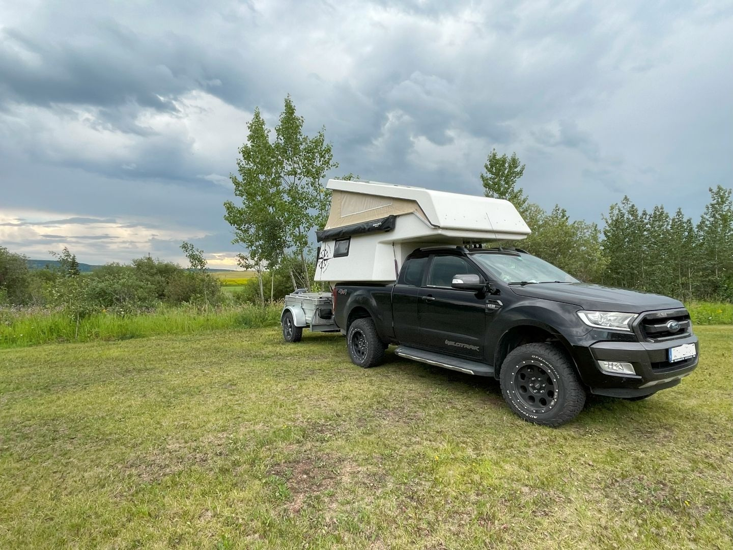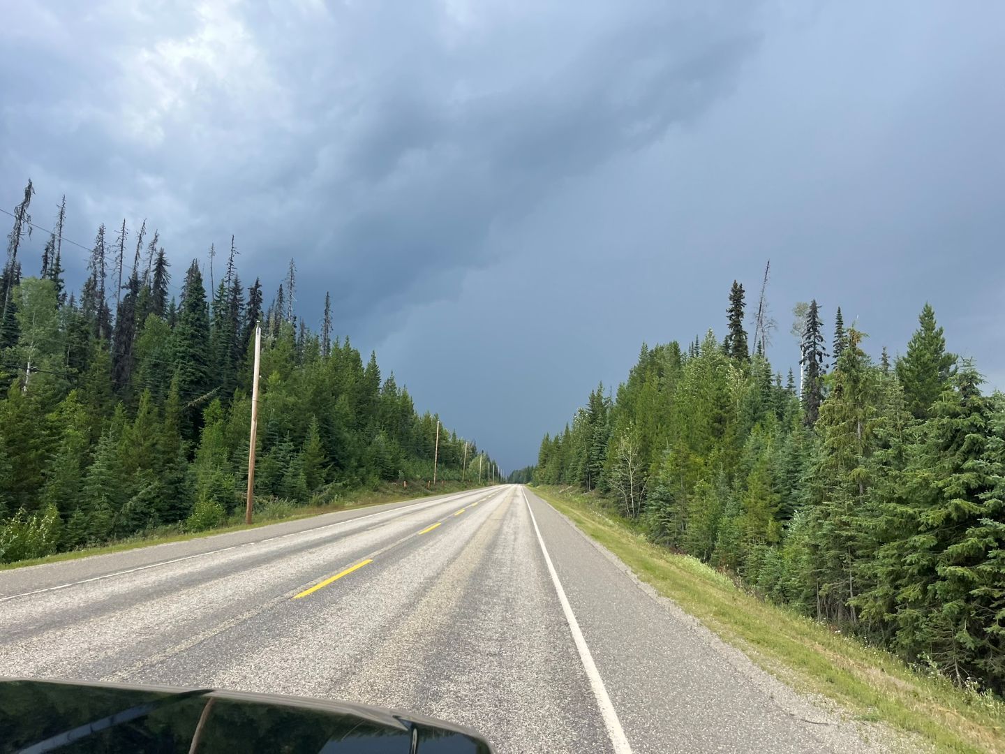Weiter geht's auf dem John Hart Highway erst Richtung Norden und später Richtung Osten nach Dawson Creek (nicht zu verwechseln mit Dawson City). Die Landschaft wird recht schnell wieder bergig und ist schön anzuschauen. Leider ist das Wetter sehr wechselhaft und es regnet immer wieder. Einmal ist es im „Thunderstorm" auch so heftig, dass man die Straße kaum noch erkennen kann. Unser Fahrzeug sieht leider danach nicht, wie erhofft, sauberer aus 🙁