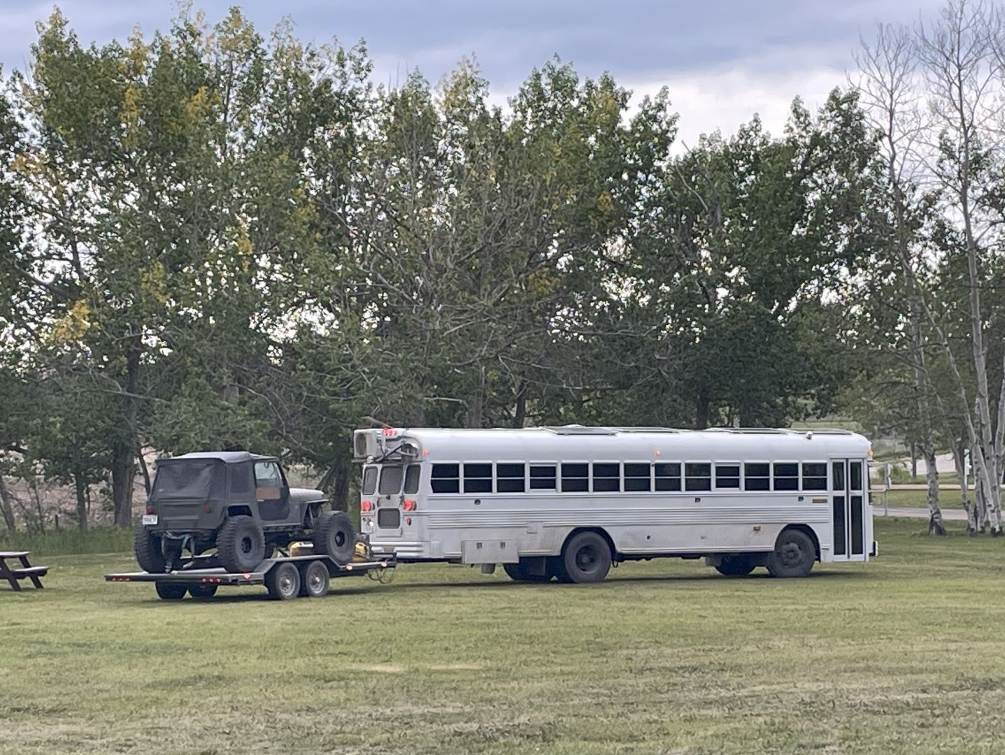 Es kommt noch ein alter umgebauter Schulbus hinzu der einen fett geilen Jeep auf Hänger hinter sich herzieht. Damit kommt man bestimmt Felswände senkrecht hoch😁