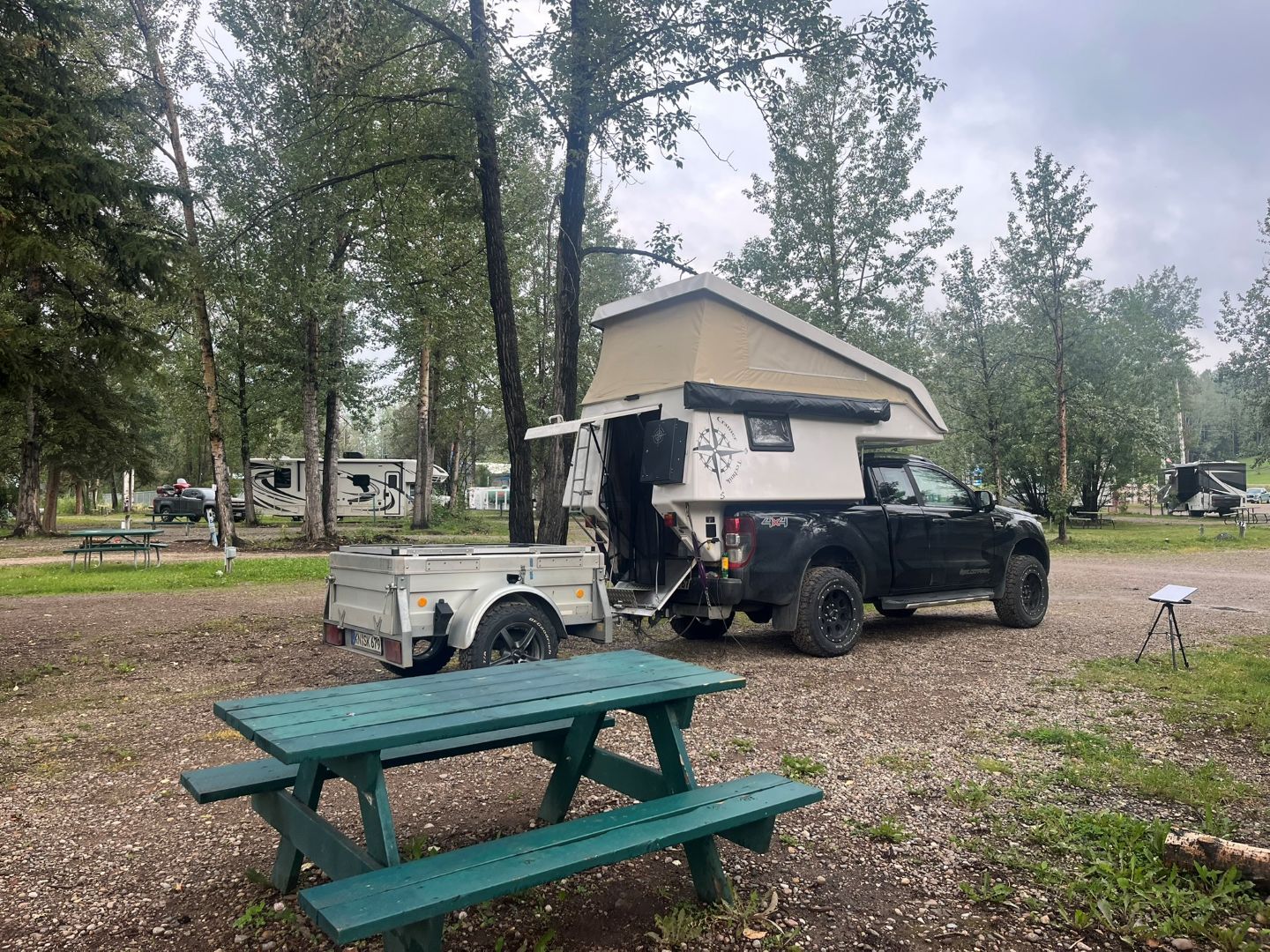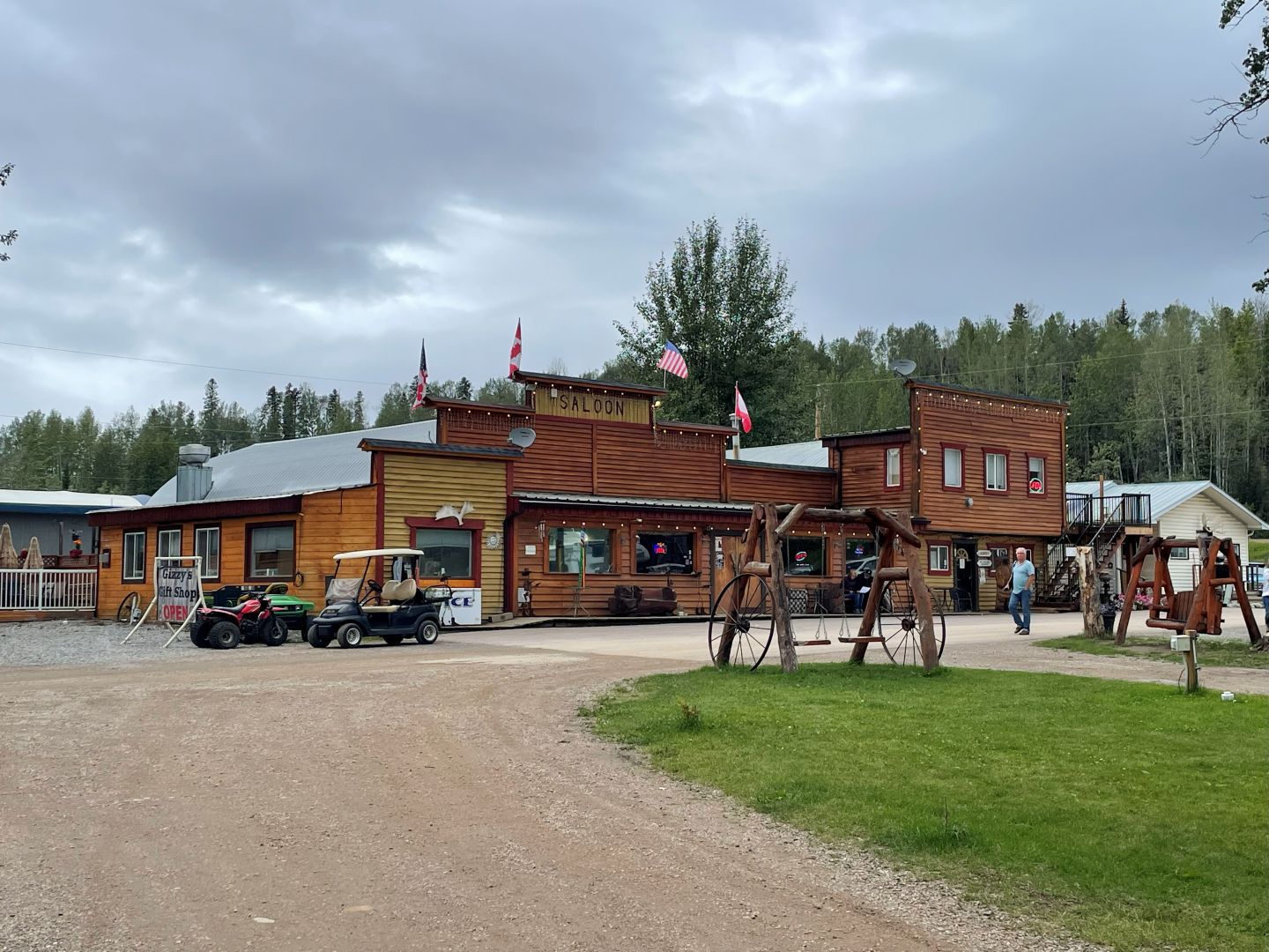 Wir gehen auf den Triple G Hideaway RV Camping. Die Rezeption mit Bar und Restaurant im Westernstyle sieht schon mal ganz urig aus. Leider behindern Bäume an unserem Platz wieder Starlink und das Wifi ist hier nicht wirklich gut. Das Sanitär ist soweit ok. Ein Loonie für 5 Minuten Duschen passt auch.