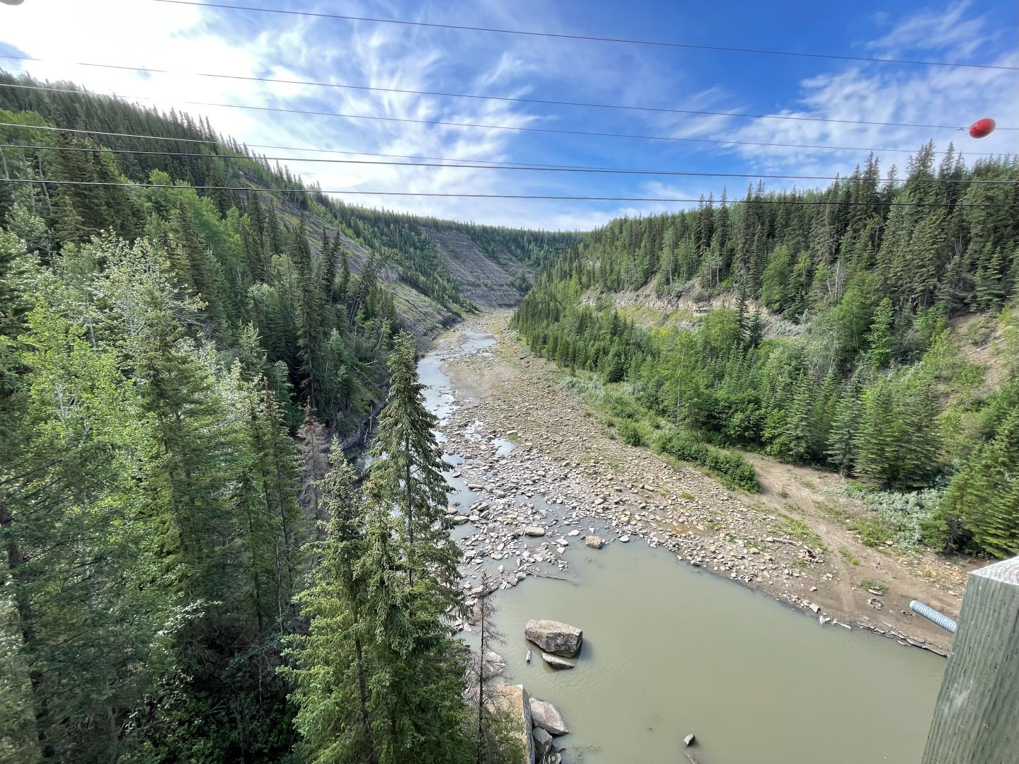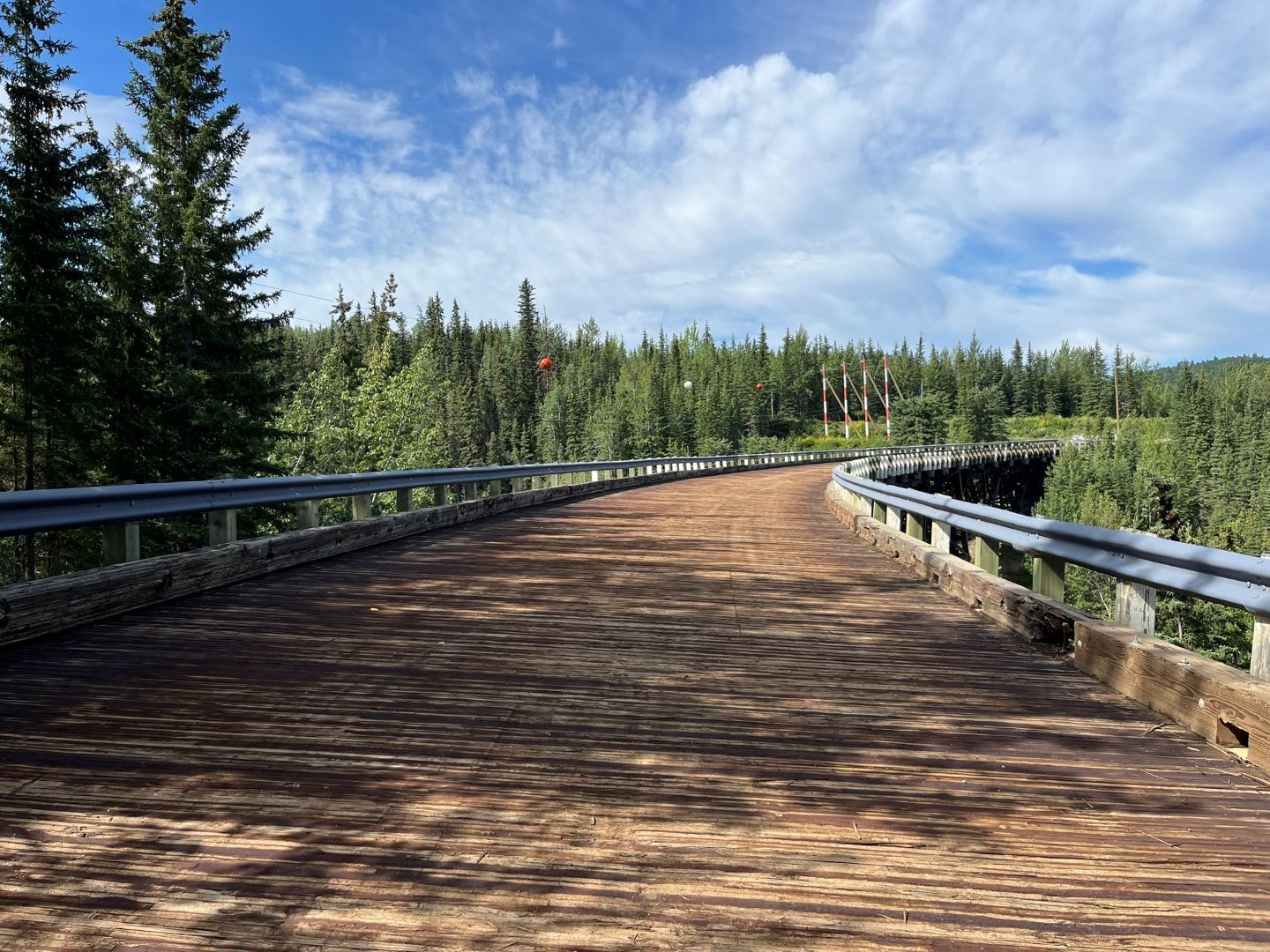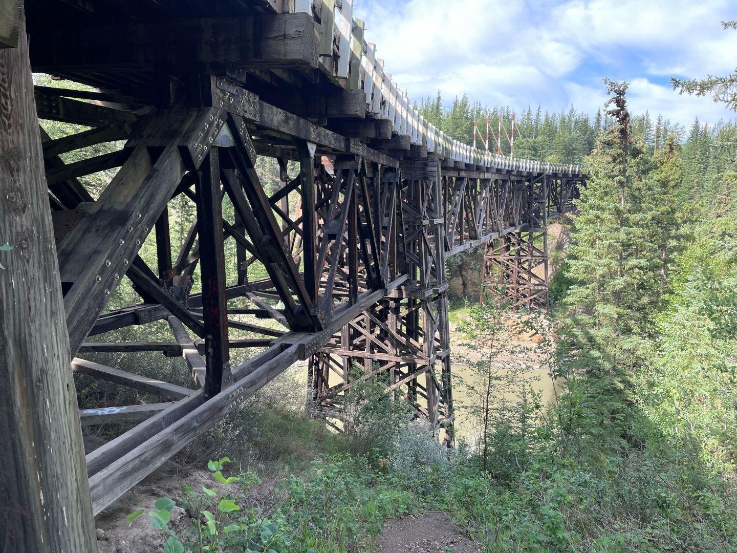Nach bereits 25 km geht's ab auf einen alten Teil der Route. Nach weiteren 4-5 km kommt die letzte noch erhaltene Originale Brücke. Die komplett aus Holz gebaute Brücke über den Kiaskatinaw River (wie man das wohl ausspricht🙄) ist inzwischen aber für den Verkehr gesperrt und kann nicht mehr befahren werden.