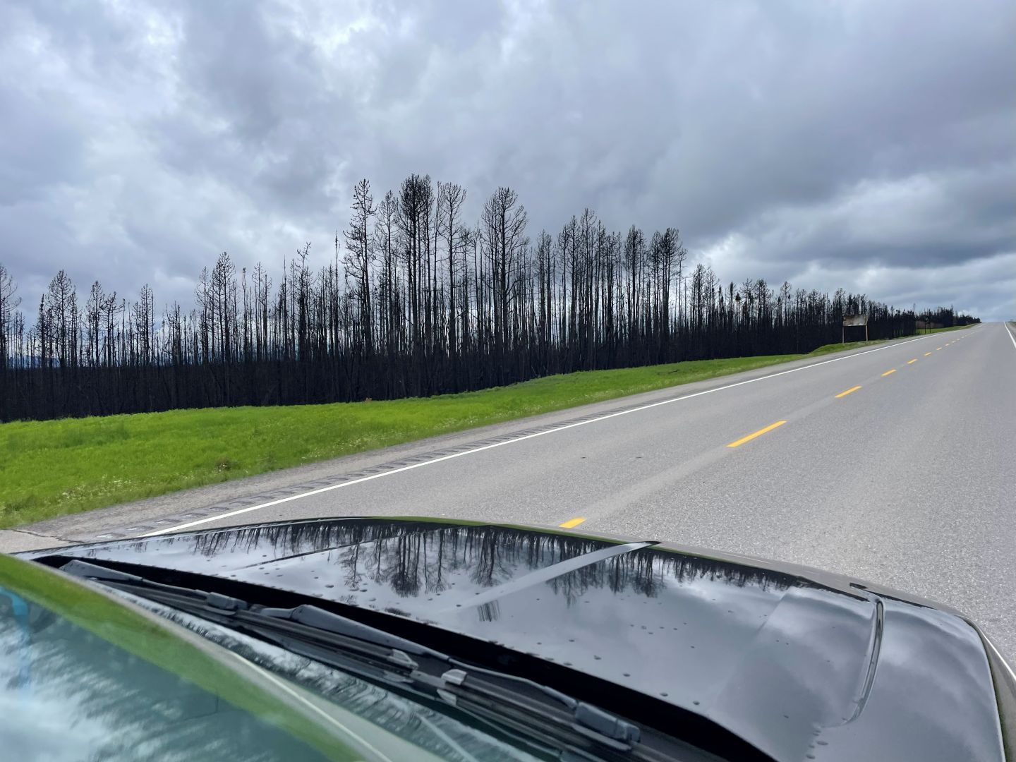 Es wird flacher und es folgen wieder große durch Waldbrände in Mitleidenschaft gezogene Gebiete. Manche sind wohl noch nicht solange her weil noch Brandgeruch in der Luft hängt.
