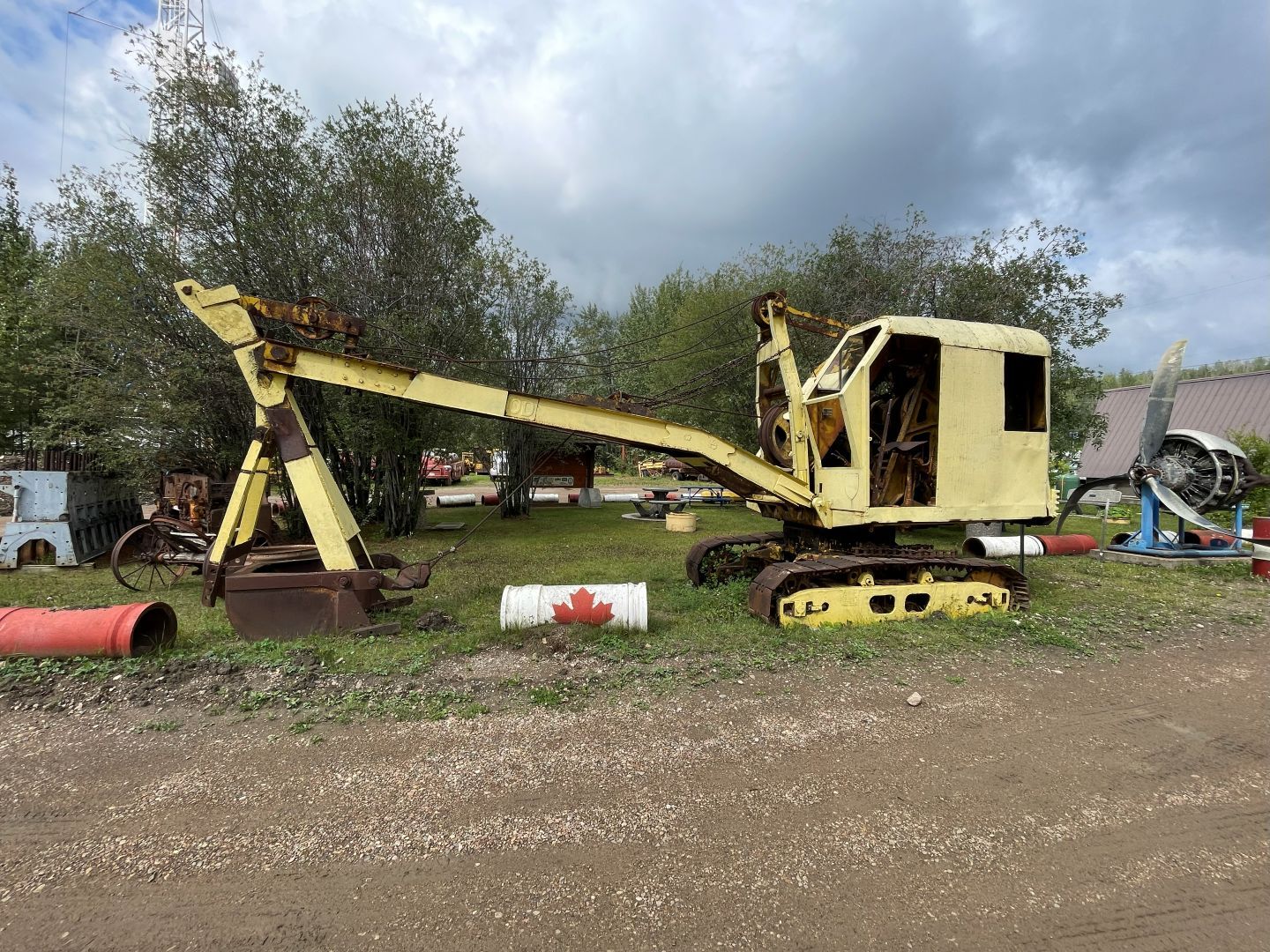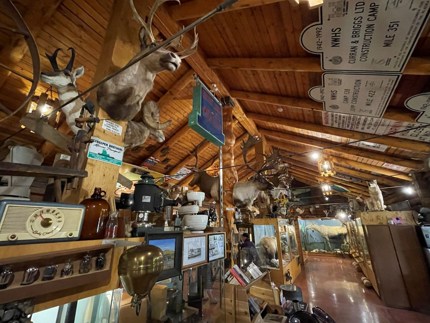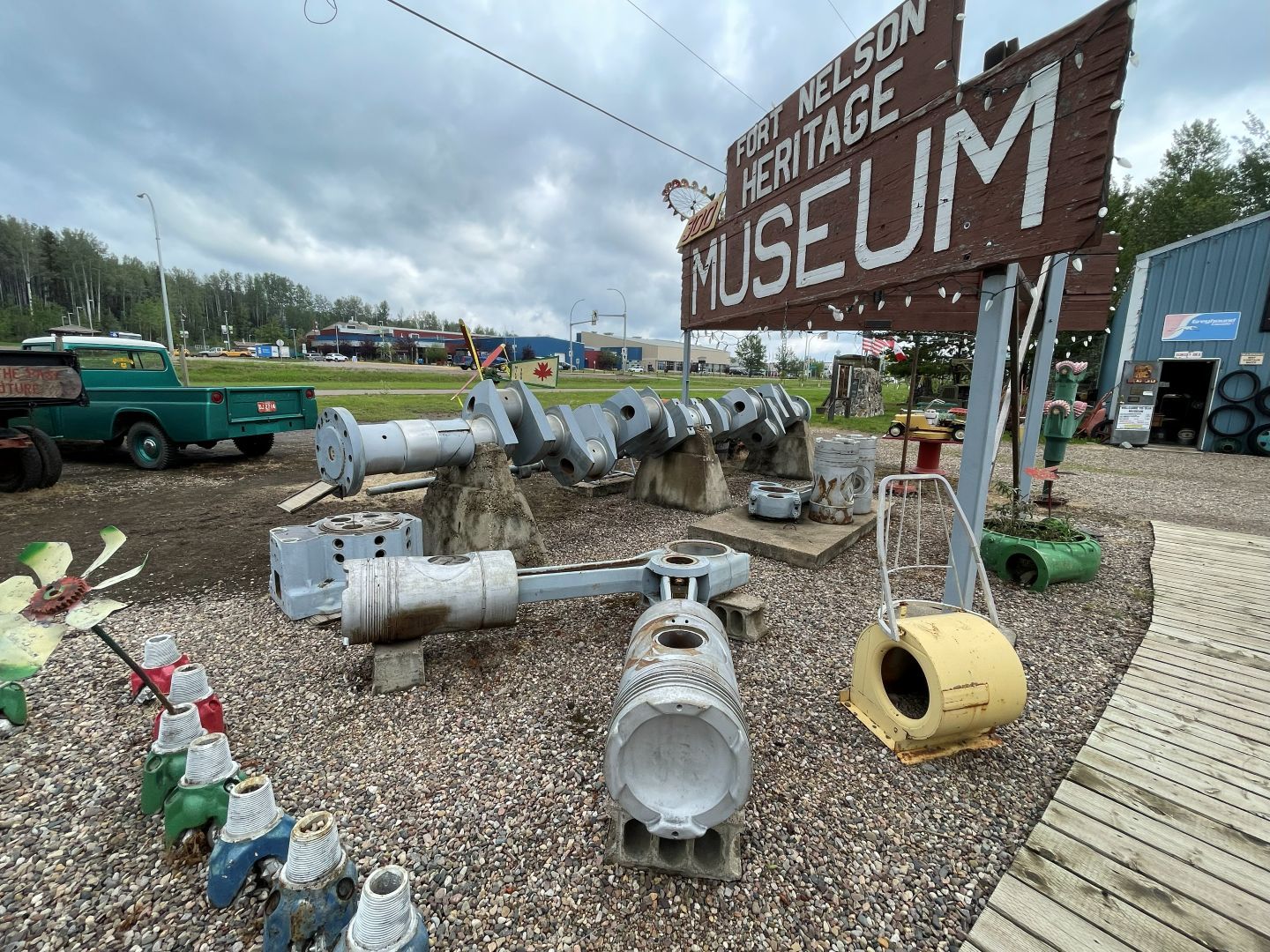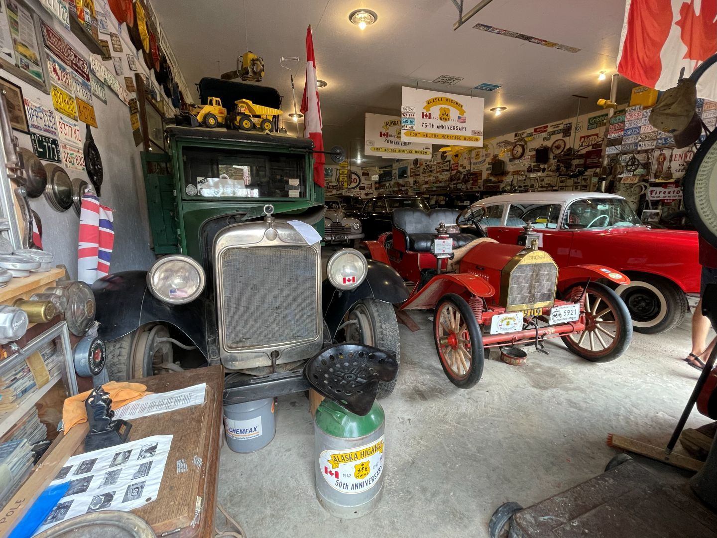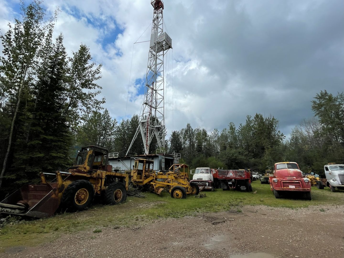 Es gibt nur Kaffee dann geht's ins Fort Nelson Heritage Museum nebenan. Das beherbergt ein dermaßen unglaubliches Sammelsurium an alten Sachen, dass man dort auch locker den ganzen Tag verbringen kann. Von altem Werkzeug aus dem vorletzten Jahrhundert bis zum Netzwerkschrank von Motorola, ich denk mal der war aus den 70er und dürfte das Modernste gewesen sein. Oldtimer aus mehren Epochen ...manche schon im Zerfall, über Raupenbagger, Traktoren, LKW's, Maschinen aller Art und kuriose Fahrzeuge bis zum Bohrturm auf einer Pontonplattform. Auch ein Flugzeugwrack und der Riesige Motor aus einem dem „Powerhouse" von früher in Fort Nelson stehen rum. Drinnen gibt's