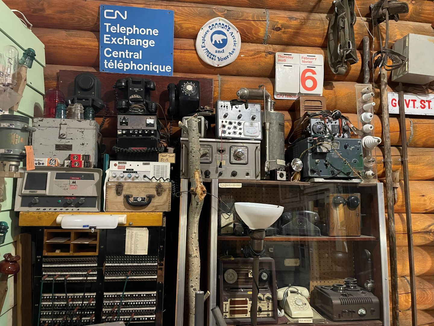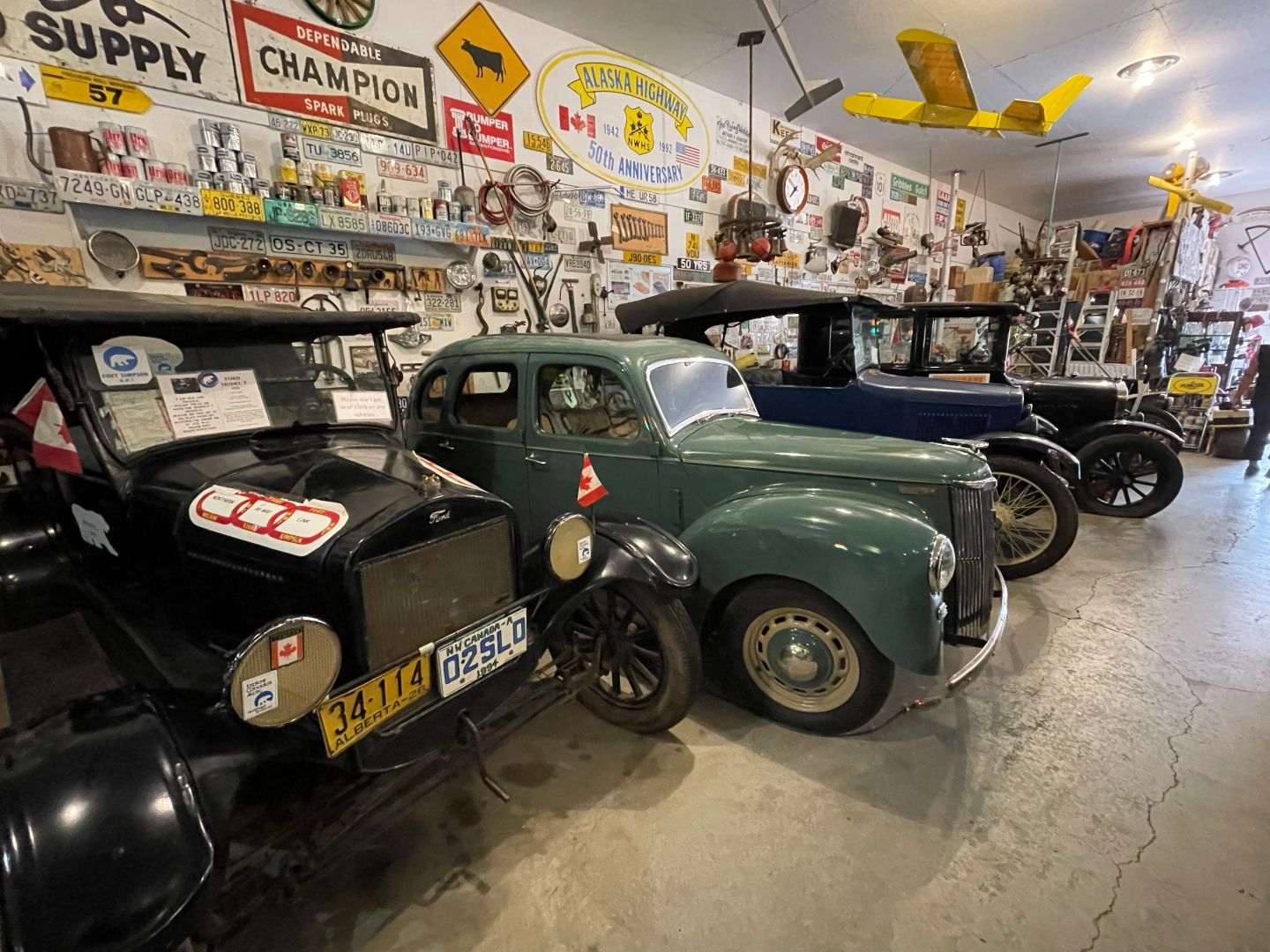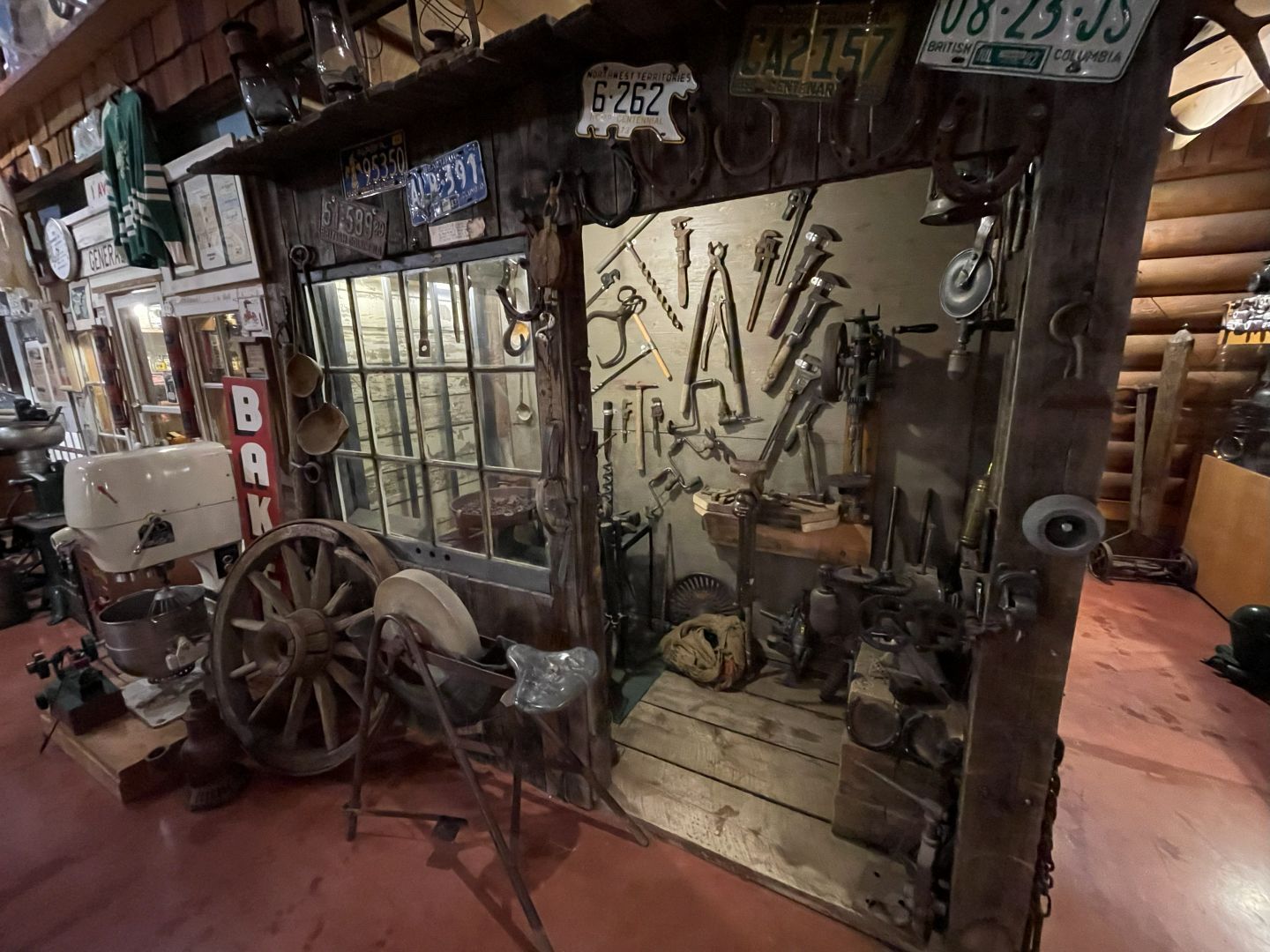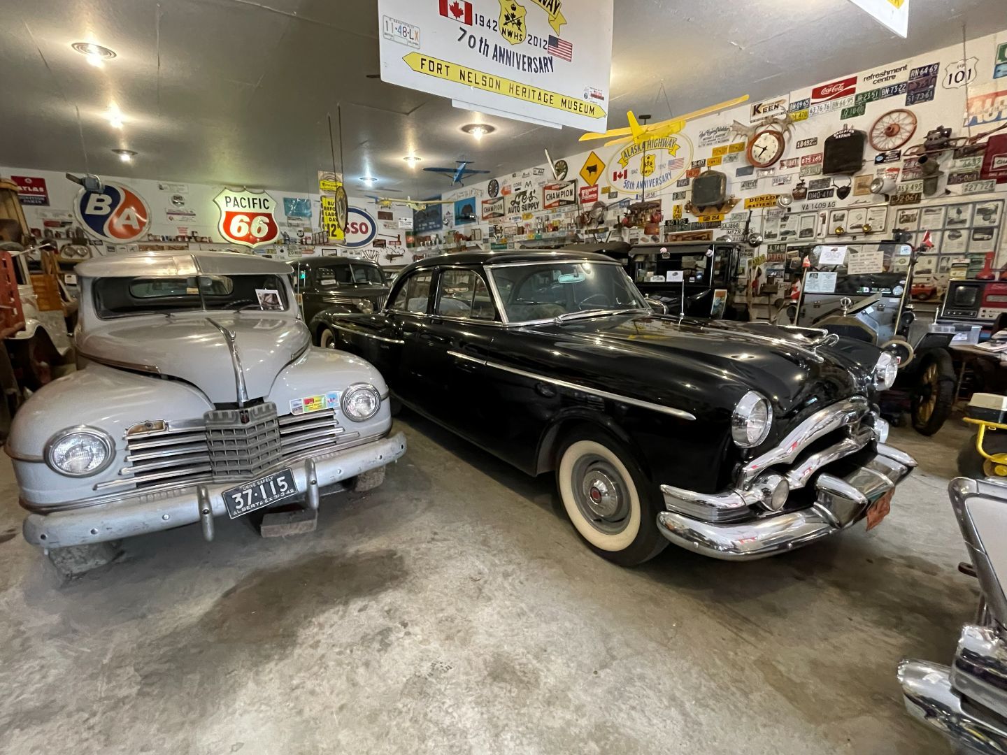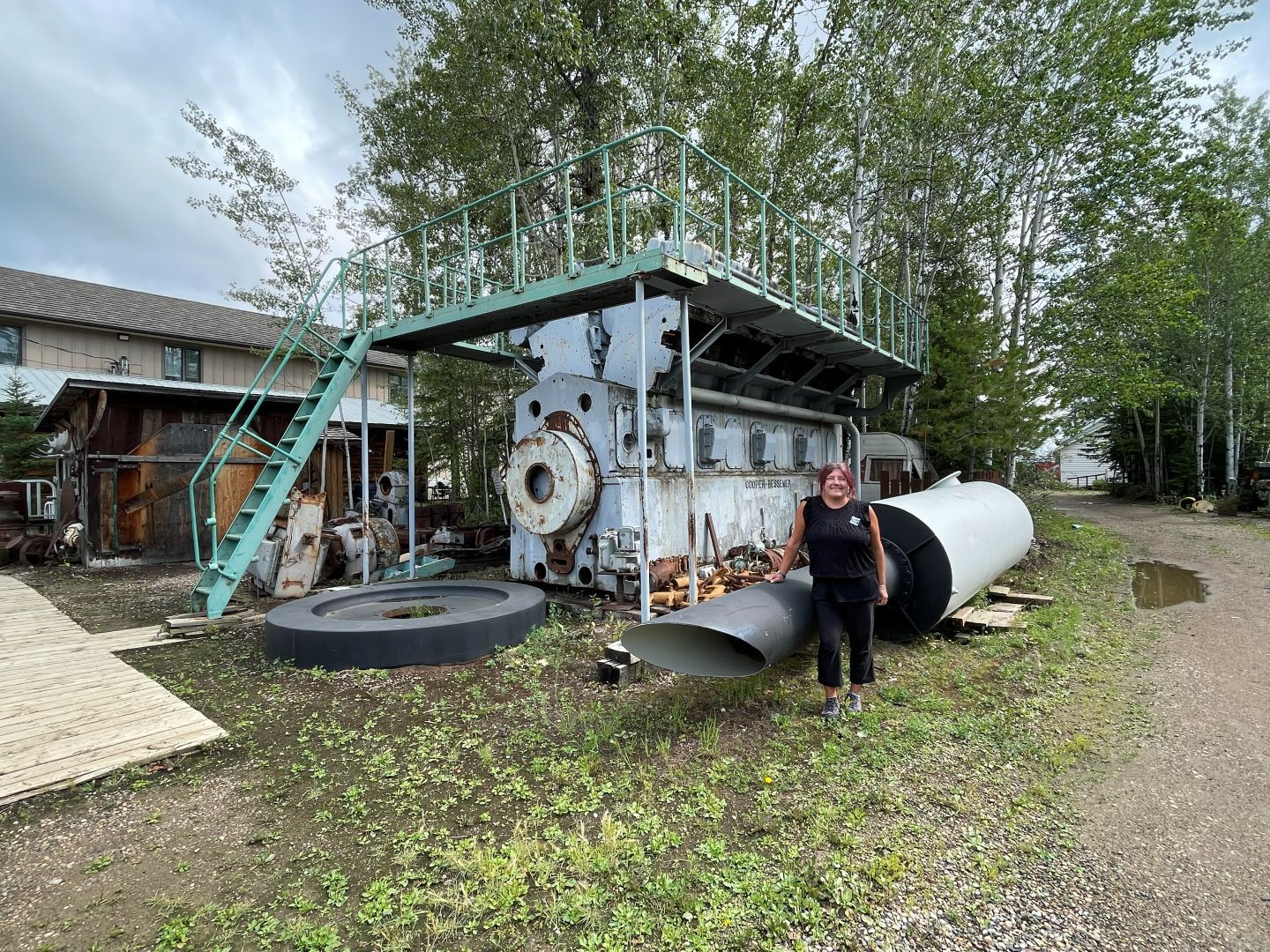 Es gibt nur Kaffee dann geht's ins Fort Nelson Heritage Museum nebenan. Das beherbergt ein dermaßen unglaubliches Sammelsurium an alten Sachen, dass man dort auch locker den ganzen Tag verbringen kann. Von altem Werkzeug aus dem vorletzten Jahrhundert bis zum Netzwerkschrank von Motorola, ich denk mal der war aus den 70er und dürfte das Modernste gewesen sein. Oldtimer aus mehren Epochen ...manche schon im Zerfall, über Raupenbagger, Traktoren, LKW's, Maschinen aller Art und kuriose Fahrzeuge bis zum Bohrturm auf einer Pontonplattform. Auch ein Flugzeugwrack und der Riesige Motor aus einem dem „Powerhouse" von früher in Fort Nelson stehen rum. Drinnen gibt's