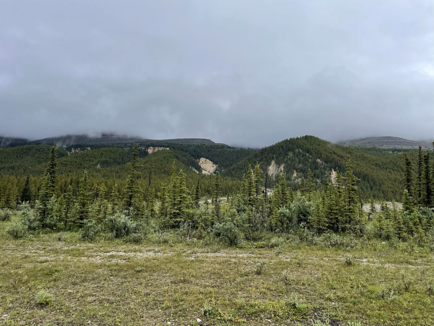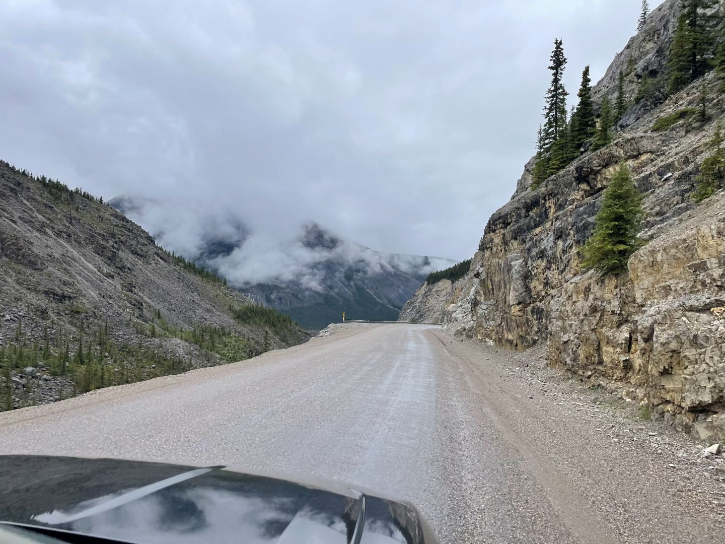 Als wir langsam wieder Richtung Rocky Mountains zurückkommen wird das Wetter schlecht. Wir kämpfen uns durch tiefhängende Wolken und Regen den ersten Pass hoch. Die Sicht ist teilweise so schlecht, dass wir zeitweise sogar Sicherheitshalber die Nebelleuchten anmachen. Saukalt wirds auch. Die Temperaturen sinken auf bis zu 8 Grad๐ฅถ. Danach wird's ein bisschen besser aber es bleibt Bescheiden.