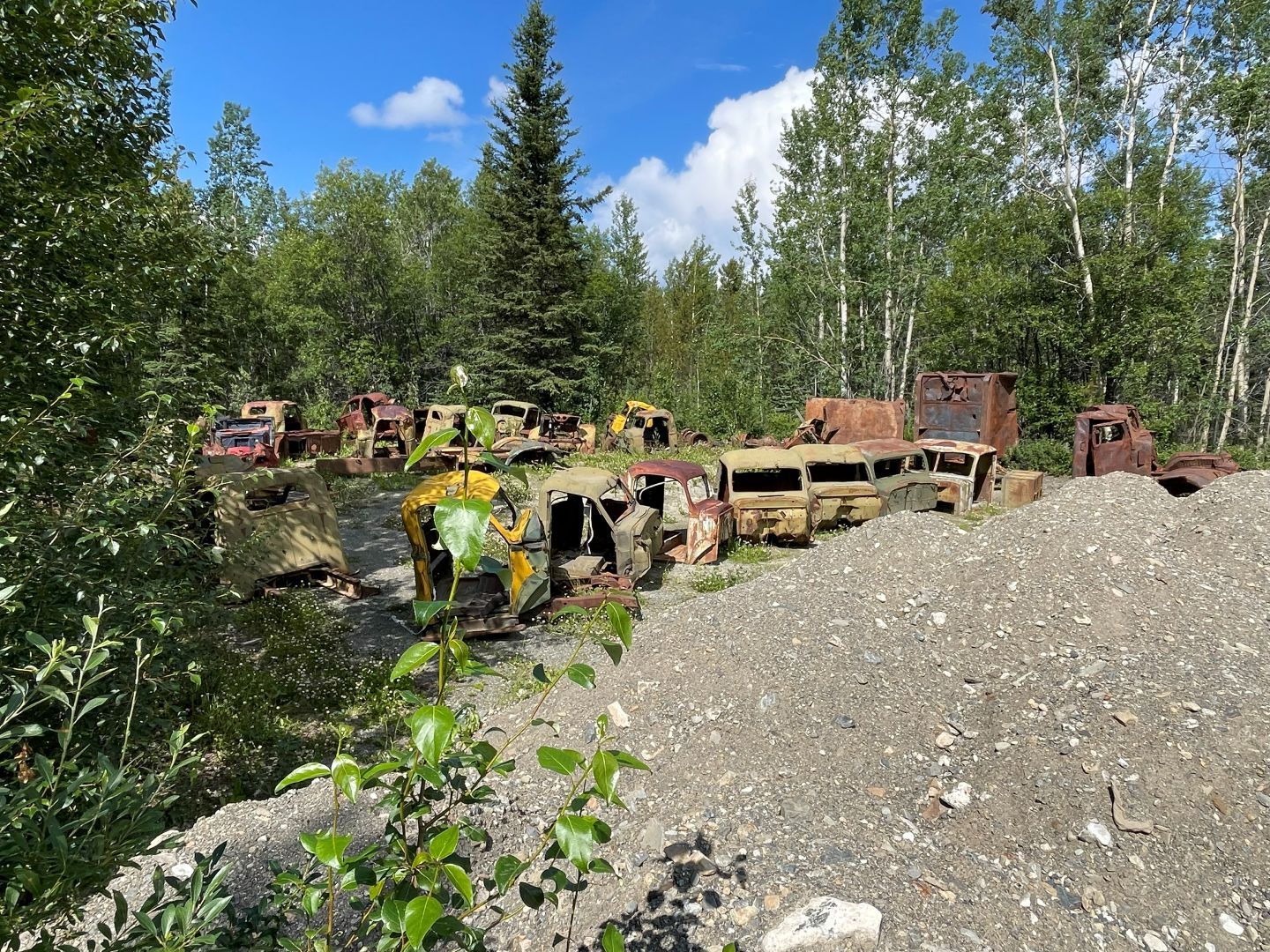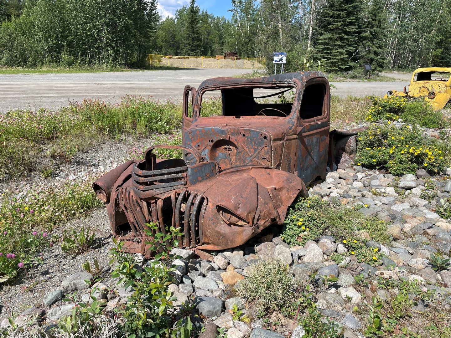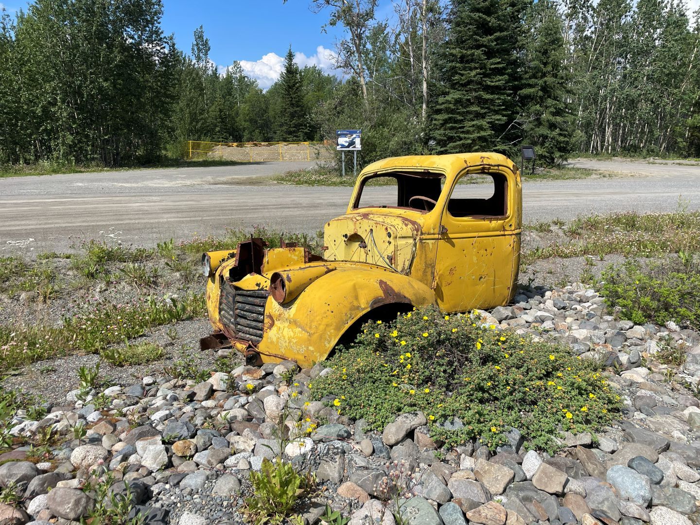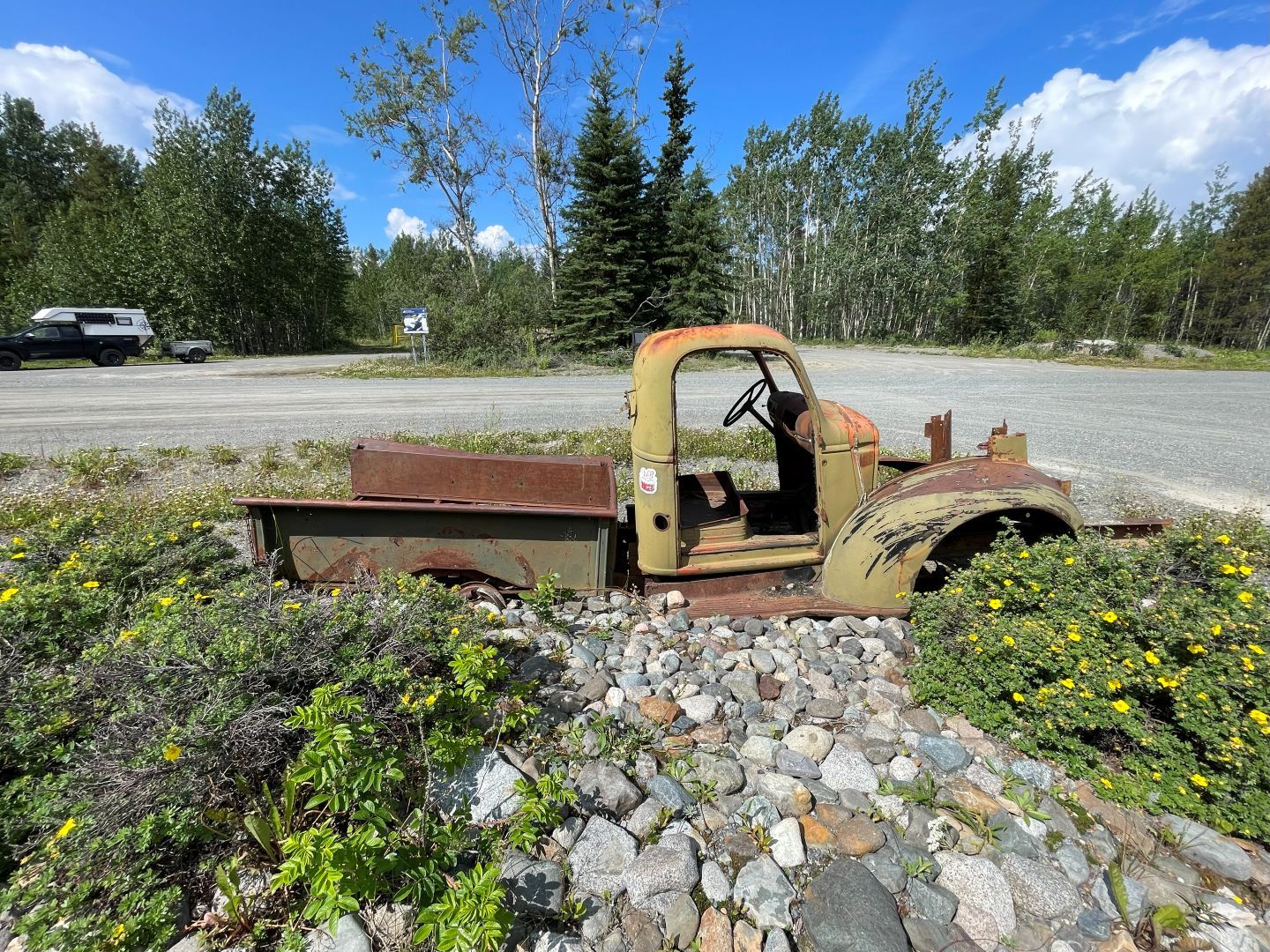 Wir halten nochmal zufällig bei einem Viewpoint. Hier stehen lauter alte Truck-Wracks rum. Die sind aus der Zeit als hier die Canol Road gebaut wurde. Die über 400km lange Schotterpiste führt nach Norden unter anderem ins 226km entfernte Ross River. Hier könnte man wieder auf den Campell Highway abbiegen der auch nach Dawson City führt und eine Alternative zu unserer Route ist. Die Geschichte des Baus wird auf vielen Tafeln erläutert. Die Strecke wurde im 2. Weltkrieg angelegt um die Canol Pipeline instand zu halten. Die Pipeline gibt es längst nicht mehr aber die Strecke wird noch von der Provinz Yukon in Schuss gehalten. Man wird gebeten die Maschinen an der Piste stehen zu lassen🙄 ...offensichtlich steht noch einiges vom Bau da rum.