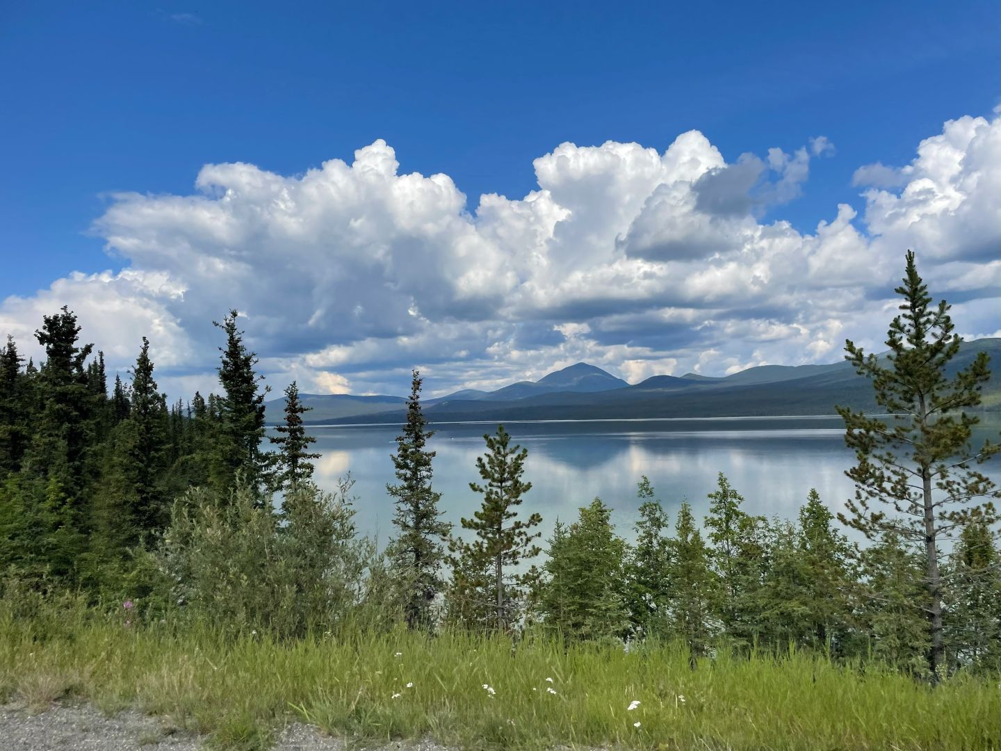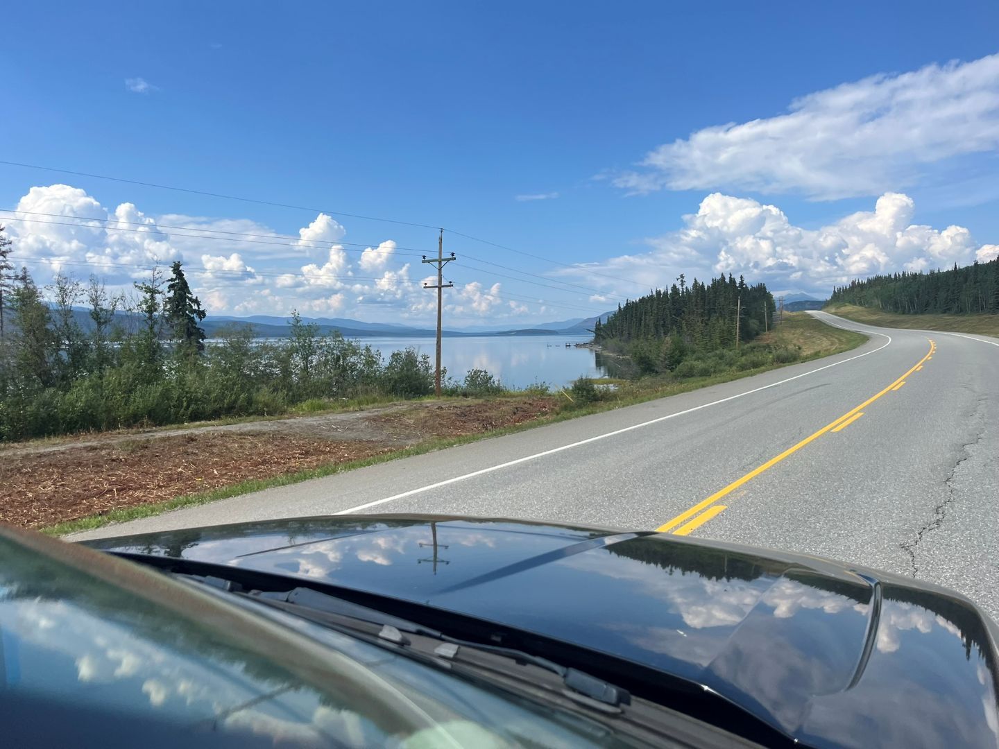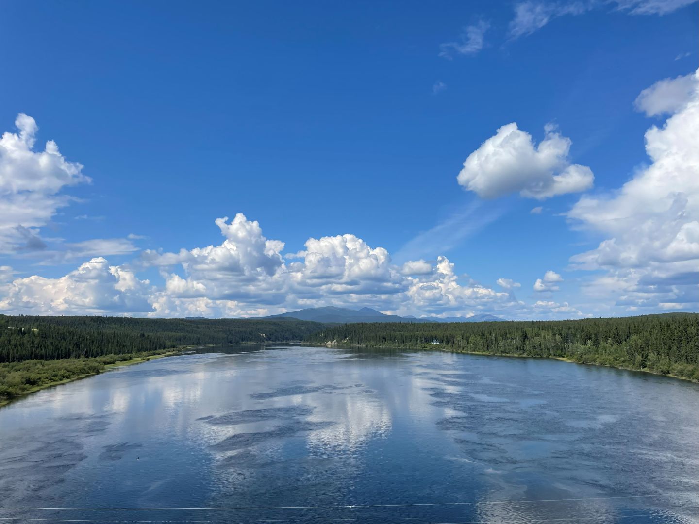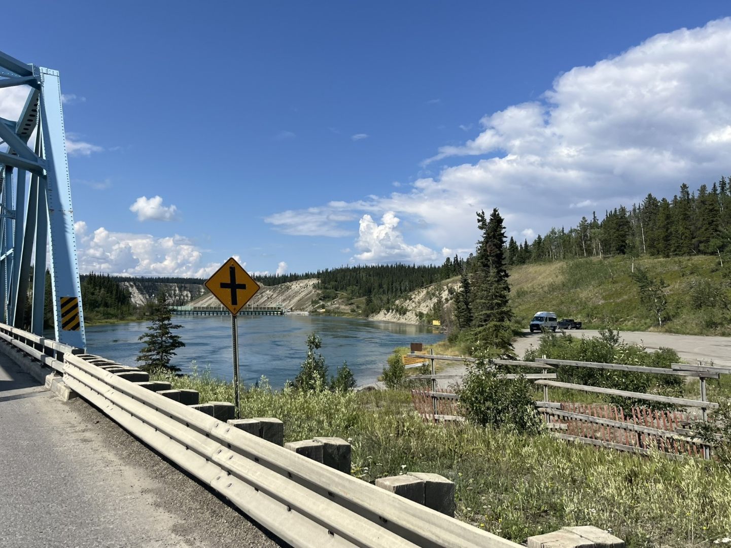 Wir fahren weiter auf dem Alaska Highway. Es geht nochmal nach British Columbia zurück. Irgendwann gehts dann wieder über die Grenze in den Yukon. Bis wir wieder BC sehen wirds jetzt eine ganz Weile dauern. Davor aber gabs noch mal, bei Teslin, die längste Brücke auf dem Alaska Highway ...da gibts auch einen im Reiseführer empfohlen Viewpoint. Also keine Ahnung ...aber wenn man schon sowas hinstellt (Überdachte Plattform mit Schildern die die Geschichte erzählen) sollte man vielleicht auch die Bäume zurückschneiden oder fällen ...dank dieser sieht man nämlich nix!🙄