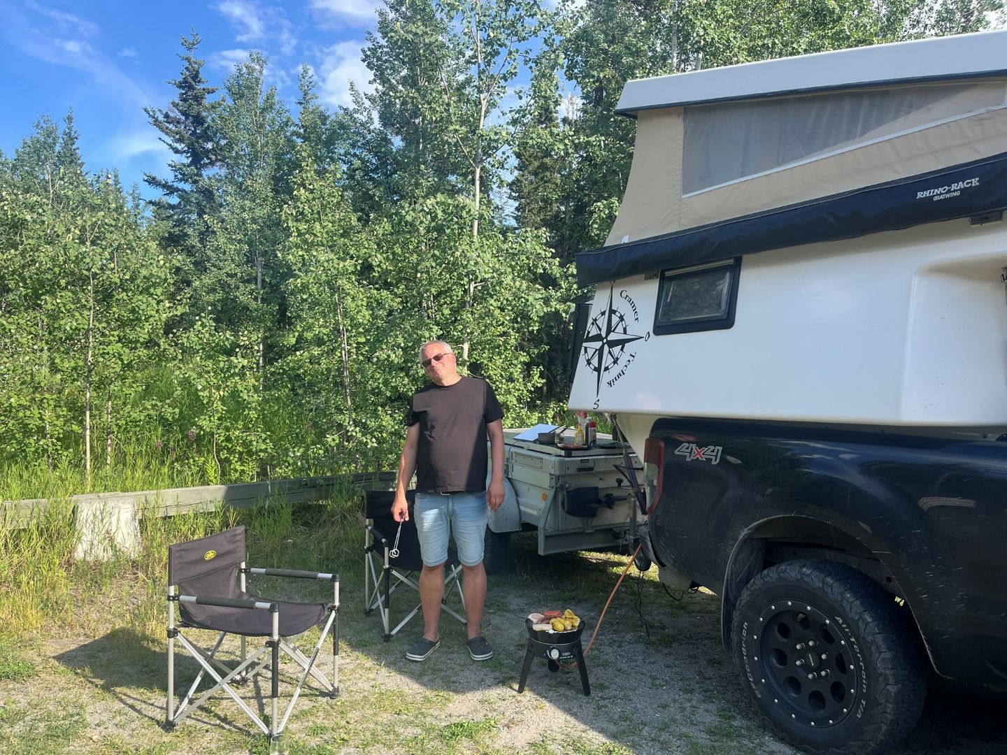 Links von uns parkt ein Expeditions-LKW aus dem Aargau. Er war fast ein Jahr hier unterwegs, die Familie ist schon wieder zurück in die Schweiz und er ist hier noch 3 Monate unterwegs. Nächstes Ziel ist dasselbe wie bei uns: der Dempster-Highway. Wie wir macht auch er sich Gedanken ob das gut geht. Zumindest will er in jeden Fall wenigstens nach Tombstone (sind so 100 km auf dem Dempster).