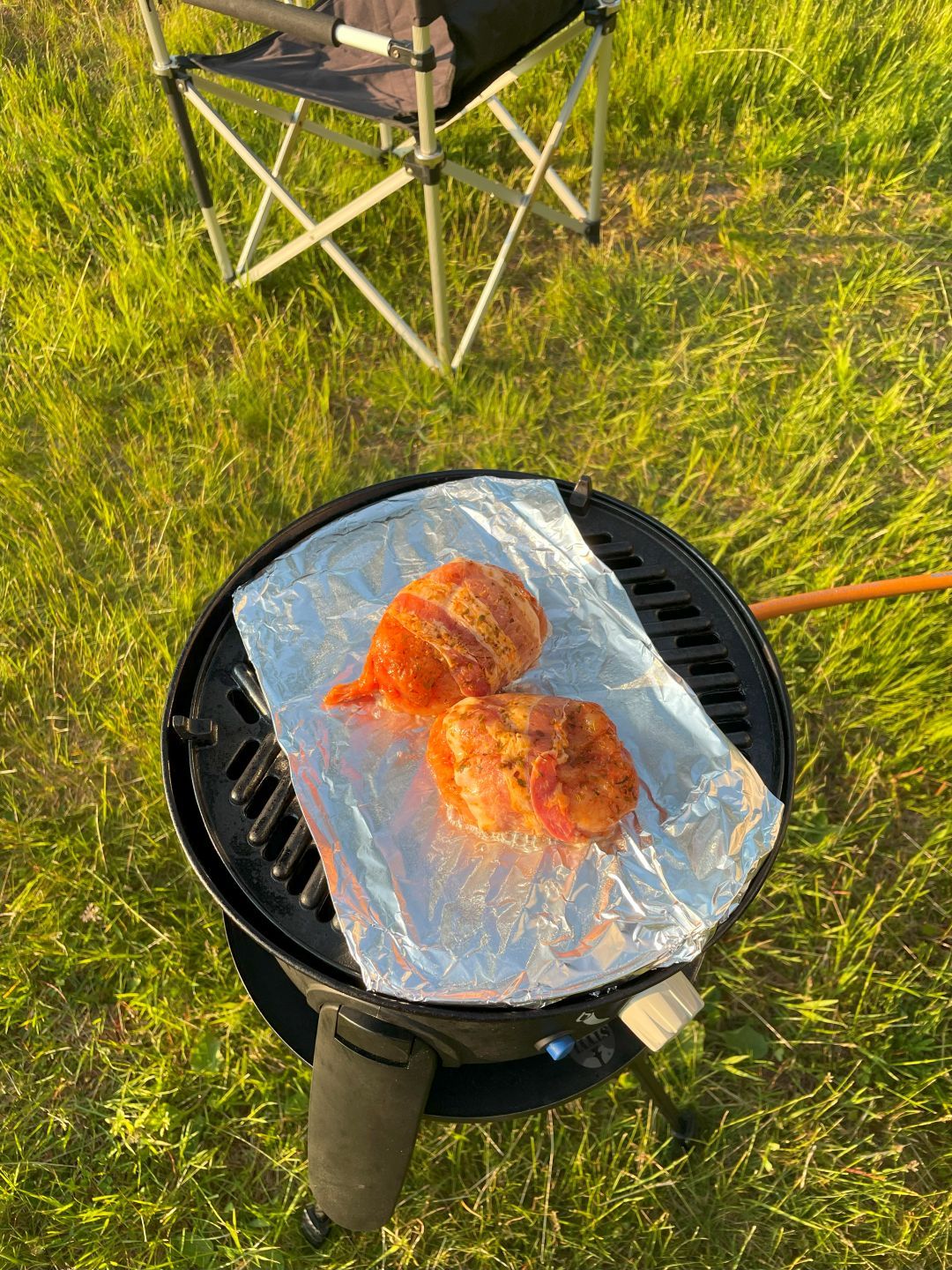 In unserem Fall Fleisch gefüllt mit irgend einer Art „Pizza"-Füllung umwickelt mit Beacon. Bei uns brauchen die 2 Dinger zum Glück auch keine Stunden auf den Grill. Wir sind normalerweise keine Freunde von fertig mariniertem Zeug, zu oft schon auf die Schnauze gefallen (ich sag nur England!). Aber das hier ist richtig gut. Gerne wieder :-)