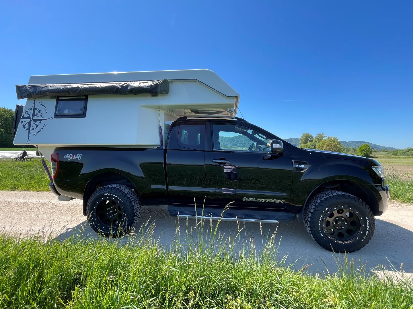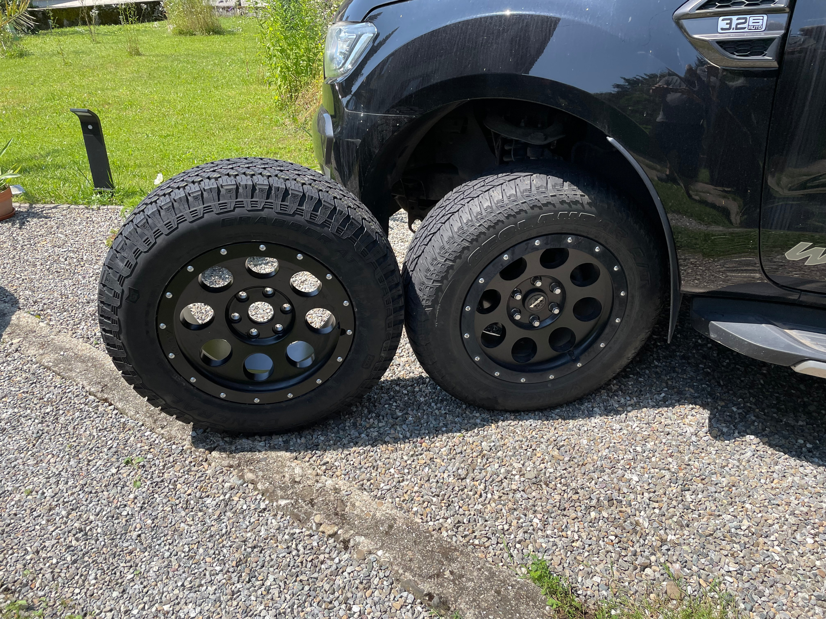 Desweitern wurde noch ein Notrad für den Anhänger montiert. Ursprünglich hätten auf den Anhänger ja die selben Räder wie die auf dem Ranger kommen sollen. Dann wäre das mit einem Ersatzrad für den Hänger natürlich nicht nötig gewesen. Allerdings gibt es keinen passenden Lochkreisadapter von 5x112 auf 6x139,7. Außer als Spezialanfertigung ohne Gutachten. Die Chancen sowas bei TÜV, GTÜ, Dekra etc. eingetragen zu bekommen sind kleiner 0. Auch für die Felgen wollen alle eine ABE sehen. Für Anhänger (und Anhängerfelgen) gibt es sowas aber garnicht. Die aktuellen Räder sind dann auch die Größten mit ABE (eigentlich für Mercdes C-Klasse) die ich gefunden habe. Noch neue Kotflügel drauf und mit der Eintragung lief´s dann problemlos.
