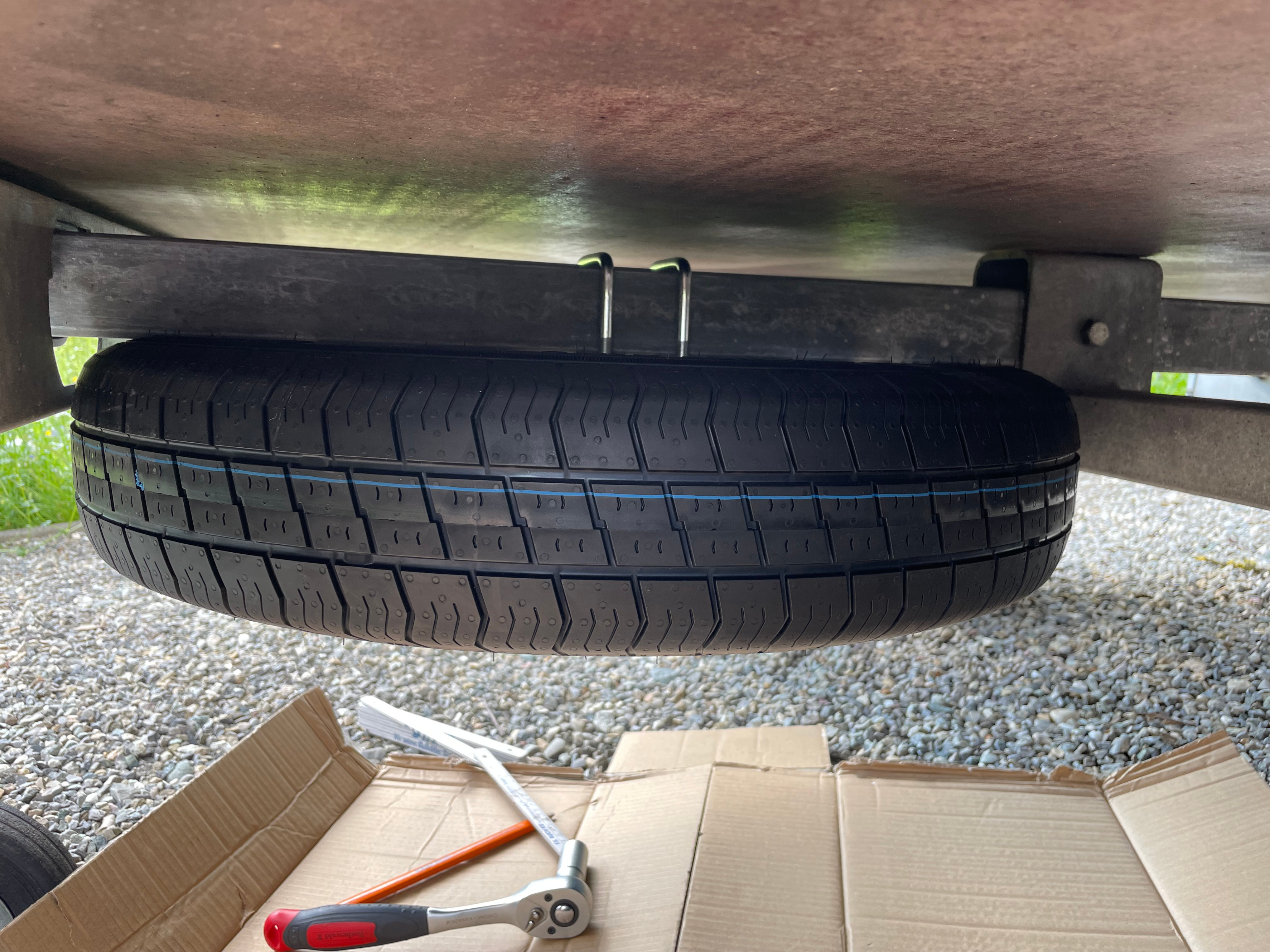 Das Notrad ist zwar auch noch ein bisschen kleiner im Durchmesser (sonst passt es nicht unter den Anhänger) aber das wird schon funktionieren. Ich bin mal guter Dinge und hoffe das es gar nie erst zum Einsatz kommt :)