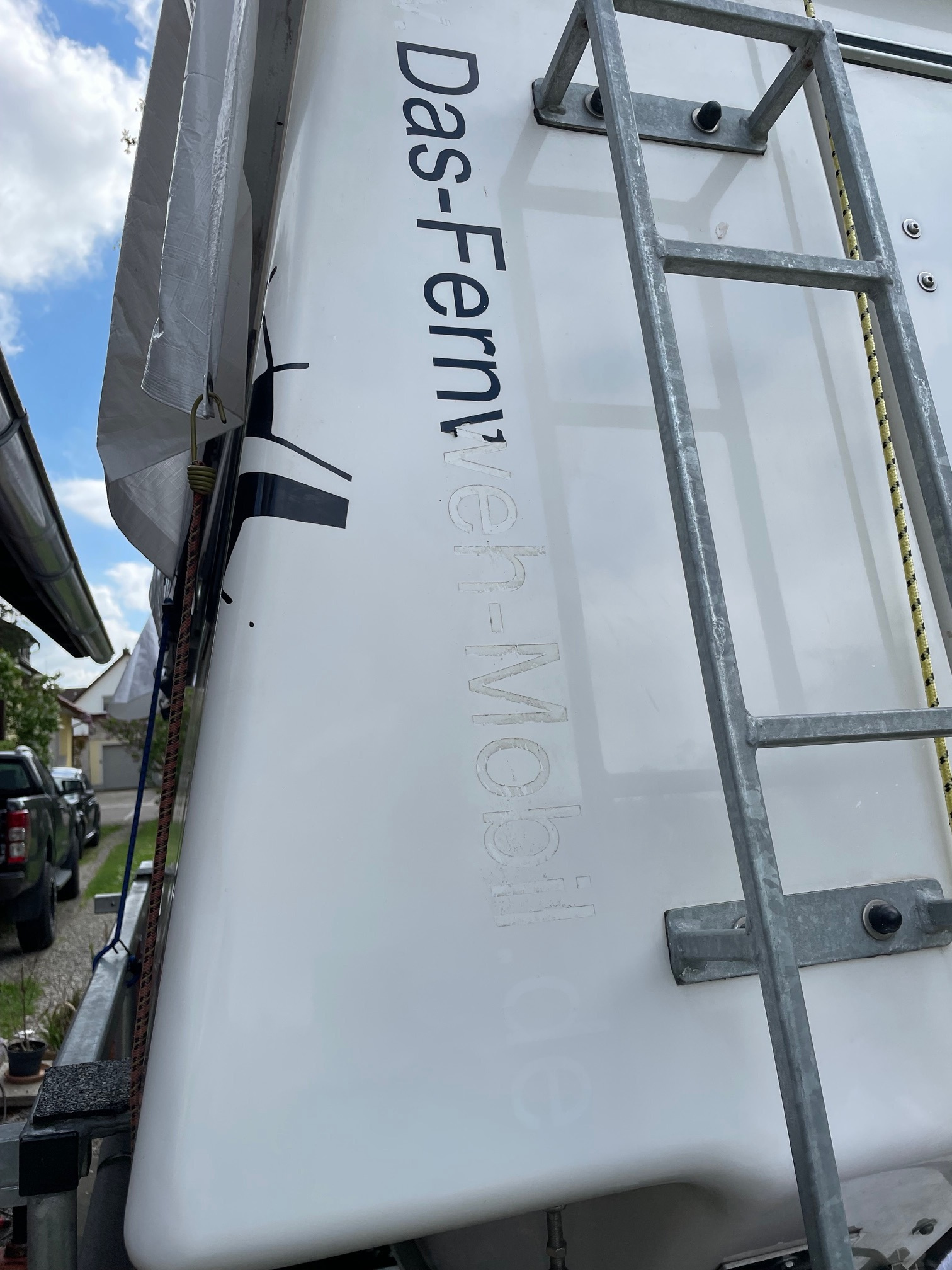 Unteranderm muss der alte "www.Mein-Fernweh-Mobil.de" Schriftzug auf der Kabine weg. Das war ja sicher sehr geschäftsmännisch vom Kabinenbauer gedacht, seit Corona nervts allerdings weil wir dank Wohnmobilboom immer darauf angesprochen werden wo, wie usw. das Ding zu mieten wäre.